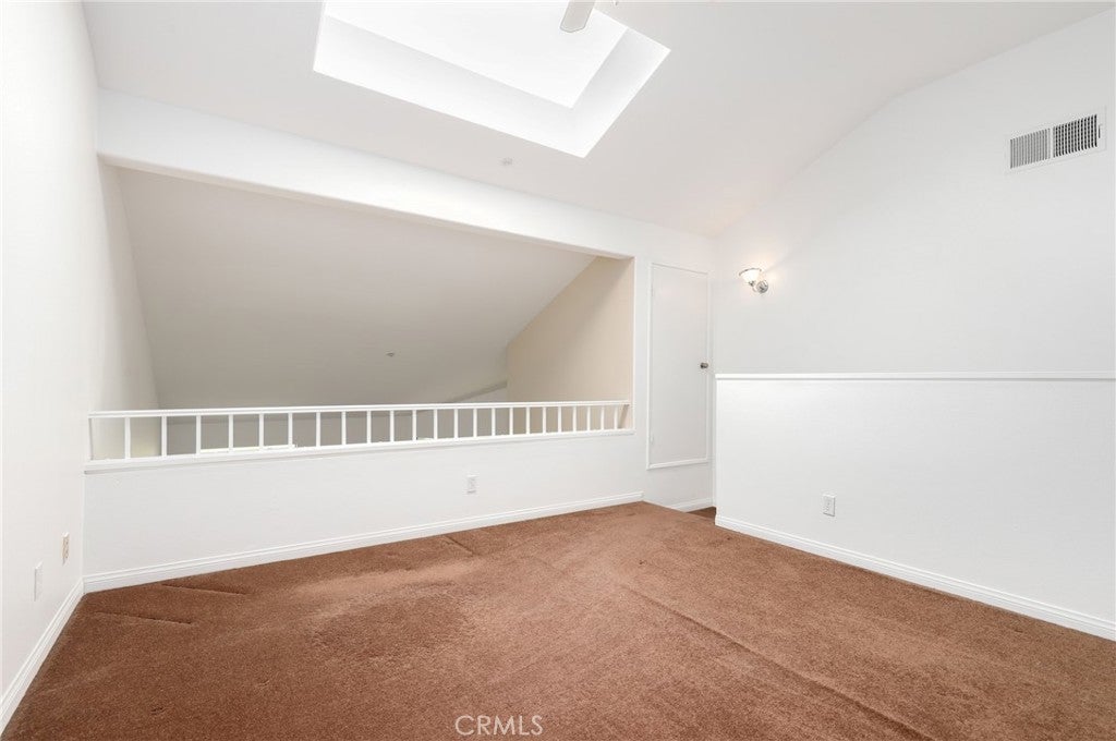 Upper Unit with Expansive Golf Course Views in Rancho Veracruz! Situated in one of Tustin Ranch’s most desirable communities, this highly sought-after upper-level residence offers breathtaking golf course and sunset views from nearly every window. With no one living above, the home combines privacy, natural light, and resort-style living in an unbeatable location. Inside, the popular floor plan features 1 spacious bedroom plus a versatile loft with closet—perfect for a home office, den, or second bedroom. The soaring cathedral ceilings, cozy fireplace, skylight, and abundant windows create a bright, open, and inviting atmosphere throughout. The remodeled kitchen showcases crisp white shaker cabinets, stone countertops, newer appliances, and a breakfast bar, seamlessly connecting to the dining area and living room—an ideal setup for entertaining. The bedroom suite includes a dressing area with an additional vanity, generous counter space, and plenty of storage. Upstairs, the loft offers flexibility and privacy, while the private balcony—accessible from both the living room and bedroom—overlooks the golf course and tree-lined views, providing the perfect space for morning coffee or evening barbecues. Additional highlights include fresh designer paint, full-size stackable washer/dryer, attic access for extra storage, and the rare advantage of no neighbors above. Residents of Rancho Veracruz enjoy two sparkling pools and spas, a fitness center, and a clubhouse for private events. HOA dues cover water and trash, which helps keep costs manageable. Centrally located near Tustin Ranch Golf Club, The Market Place, parks, hiking trails, and top-rated schools, this home blends comfort, convenience, and captivating views. Don’t miss your chance to own this stunning golf course view home in Rancho Veracruz!