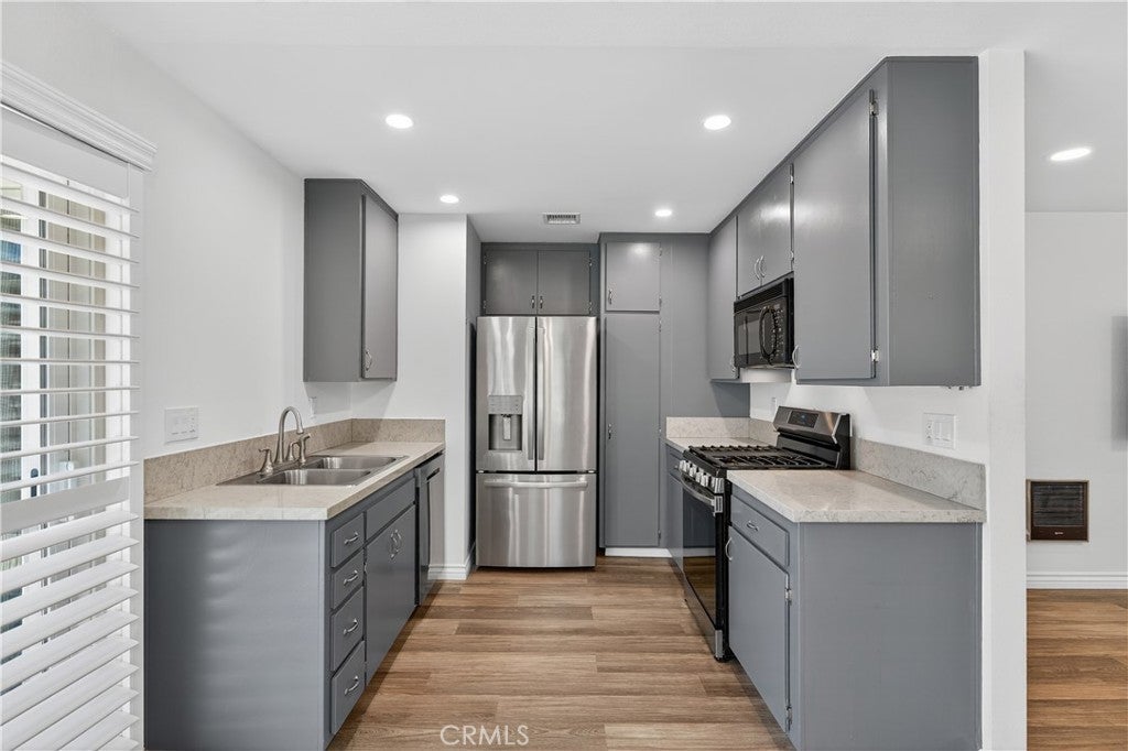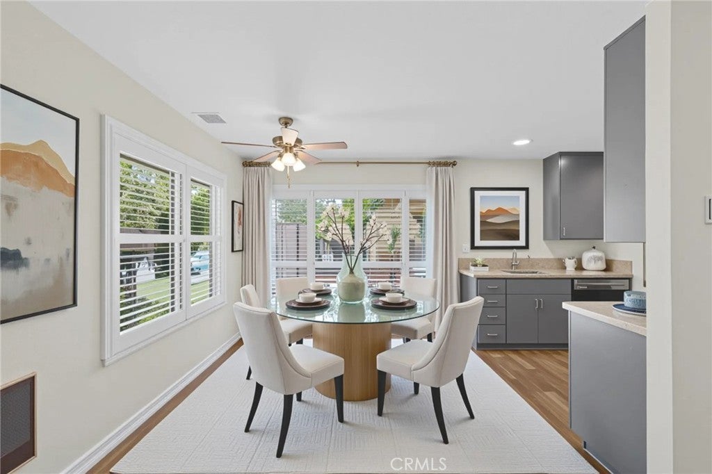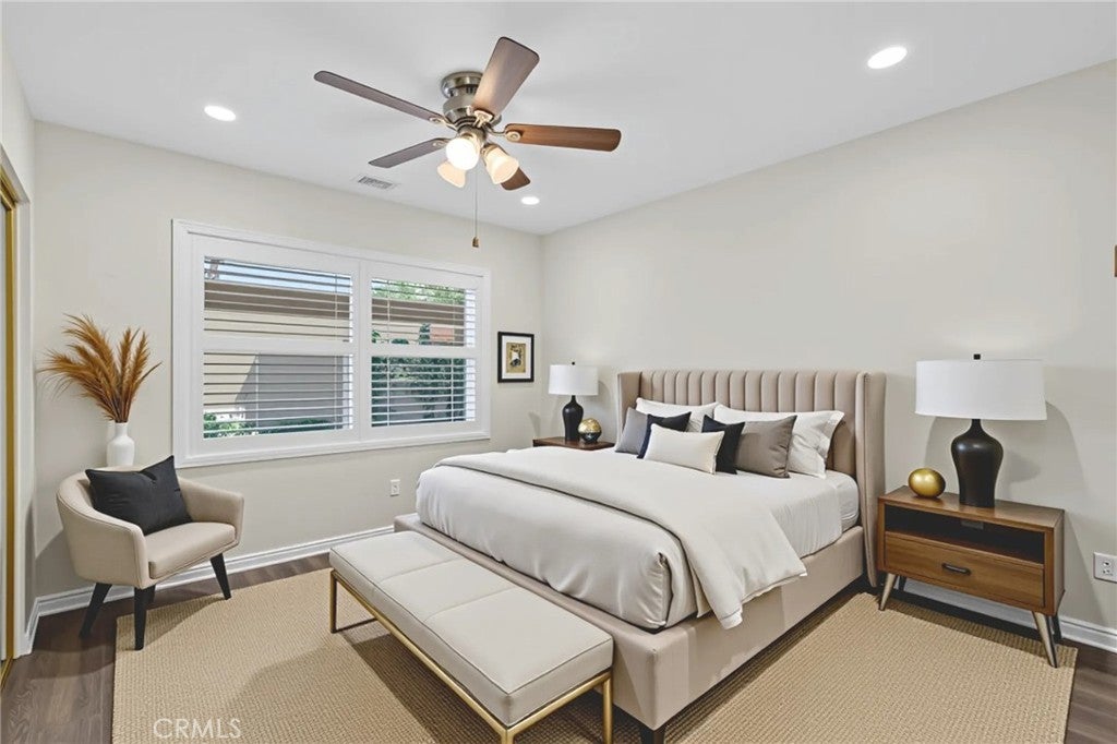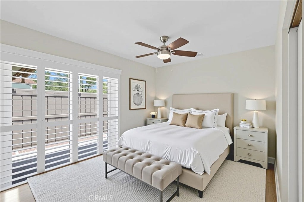 RECENTLY REMODELED SINGLE-FAMILY HOME ON A CORNER LOT, ATTACHED ON ONLY ONE SIDE, NO ONE ABOVE OR BELOW, WITH PATIO ACCESS TO 2-CAR GARAGE! Open floor plan and large windows, all with plantation shutters, bring in lots of natural light. Living room is open to dining room, and dining room is open to remodeled kitchen with recessed lighting, quartz countertops, and stainless-steel appliances. Kitchen windows and sliding glass doors in dining room and one of the back bedrooms open to a large private back patio with wood fence and block wall, where you can relax and barbeque. Recently painted, and newer laminate flooring throughout except for carpet in primary bedroom. Large primary bedroom has ensuite full bathroom. Down the hall is a second full bathroom, and two additional bedrooms at the back of the home. Newer Central A/C and water heater, dual-pane windows, and smooth ceilings. Ceiling fans in all bedrooms, and recessed lighting in living room, dining room, kitchen and one of back bedrooms. Community has an association pool and spa, and is next to Boisseranc Park, a public park with lighted tennis courts, pool, handball courts, baseball fields, playground, and picnic area. Conveniently located near 91 and 5 freeways.