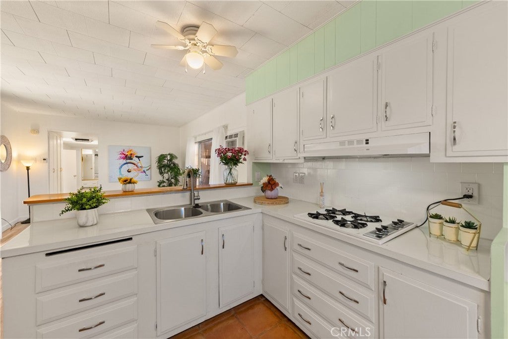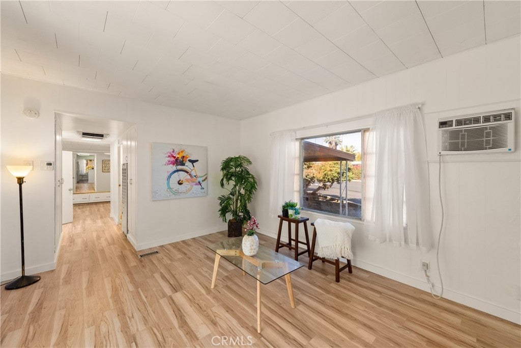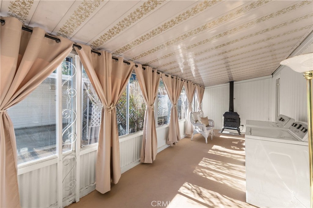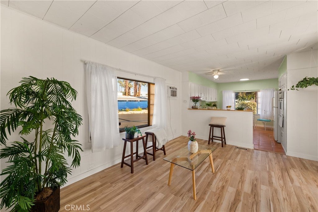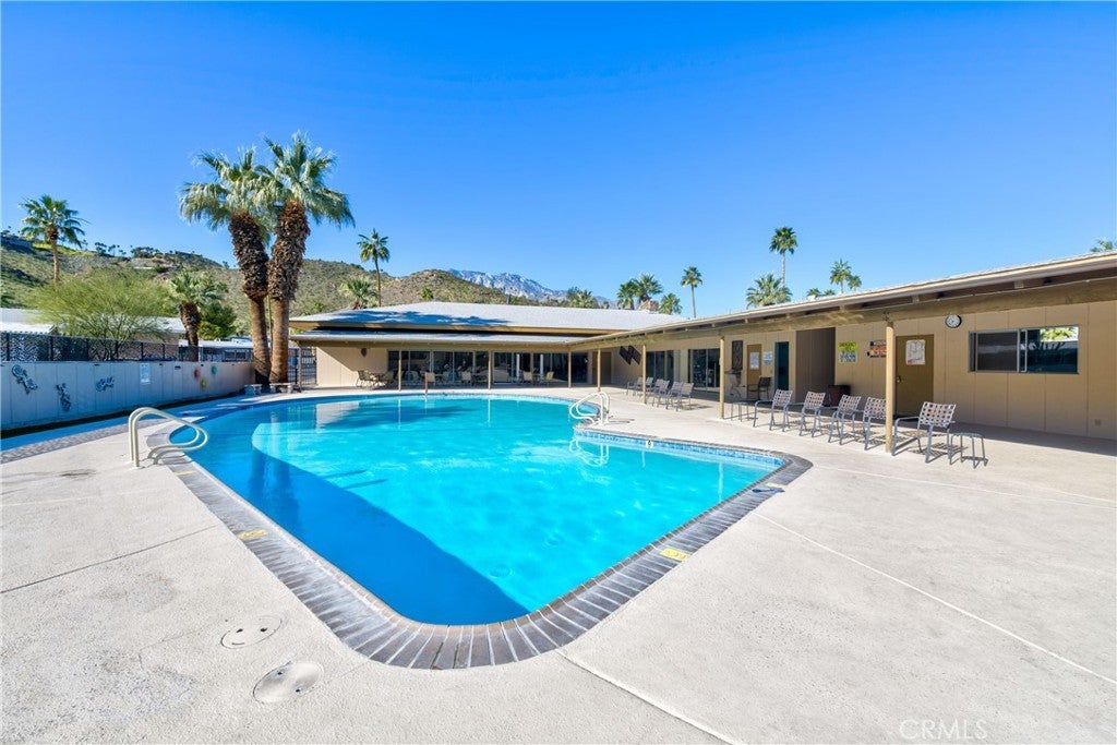 Charming Desert Home - in 55+ Palm Springs Community. Welcome to your desert retreat! This spacious 1-bedroom, 1-bathroom mobile home is ready to move in! Offering 945 sq.ft. which includes the 225 sq.ft. elegant enclosed sunroom. Remodeled throughout, with modern features including new flooring, fresh paint, new fixtures, new trim, and modern lighting throughout. The oversized bedroom offers plenty of space and flexibility to create a second bedroom if desired, or enjoy it as a spacious reading room, office, or mini-gym, the possibilities are endless! The open floor plan seamlessly connects the living room and kitchen, creating an inviting space for entertaining. The kitchen and bathroom feature beautifully refinished Spanish Saltillo tile flooring, adding warmth and charm to the space. The large bedroom provides plenty of closet space, while the bathroom has been refreshed for comfort and style. There is an abundance of closet and cabinet space throughout, including the well-appointed kitchen offering plenty of room for storage and organization. The home features all-new window treatments, including blinds, sheers, and blackout curtains. Covered porch/sitting area plus an additional side patio—perfect for morning coffee, evening refreshments or relaxing outdoors. Covered carport and storage shed add extra convenience and functionality. Enjoy the convenience of in-home washer and dryer hook-ups, giving you extra flexibility. The pre-owned washer & dryer are complimentary (as-is). The park offers great amenities, including a sparkling swimming pool and relaxing hot tub, rec room with pool tables and ping pong, community room, and a clubhouse. Nestled in a peaceful location, this home features beautiful hillside views in a serene setting, away from the city’s hustle and bustle. It is just minutes from shopping, dining, and the vibrant Palm Springs lifestyle. Located in a friendly 55+ senior park , you’ll love the community atmosphere and peaceful ambiance. This home is move-in ready and waiting for its next owner to enjoy all that Palm Springs has to offer! Square footage includes Sunroom which can be used as living space. Currently it is being used as a laundry room, without Sunroom the home is 720 sqft. Carport + storage shed . • Remodeled interior: new floors, paint, kitchen and bathroom fixtures, and lighting .• All new window treatments; blinds, sheers, blackout curtains. • Wired for a security alarm .• Located in a well-maintained 55+ community.