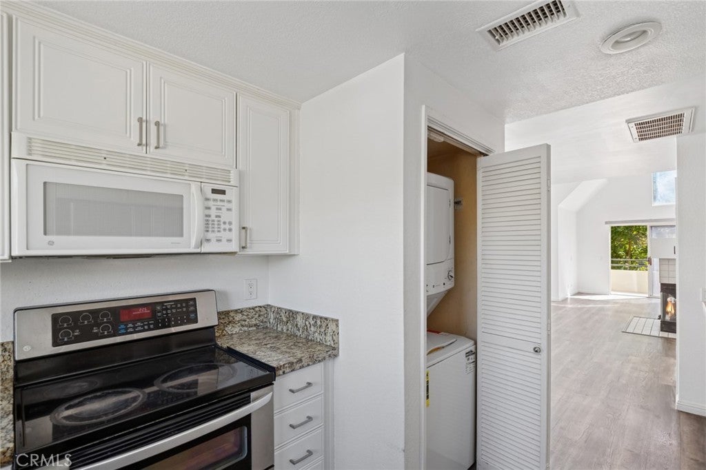 Nestled in the sought-after community of Rainbow Ridge, this updated 2-bedroom, 2-bathroom residence combines comfort, style, and convenience. A dramatic entry with soaring ceilings and expansive windows fills the interiors with natural light, enhancing the sense of space. The open-concept living area features a tiled fireplace and flows seamlessly to a large private balcony, perfect for both relaxing and entertaining. The main-floor primary suite offers a spacious walk-in closet and a well-appointed full bath. Upstairs, the secondary bedroom provides privacy with its own en-suite bath and closet. The kitchen is designed with efficiency and function, opening to the dining and living areas for a connected lifestyle. Recent upgrades add to the home’s appeal, including luxury plank flooring, remodeled bathrooms with modern finishes, motorized window shades, a new water heater, and a complete plumbing re-pipe in 2025. Thoughtful details throughout reflect quality and attention to design. Residents of Rainbow Ridge enjoy tree-lined surroundings and access to Lake Mission Viejo membership, which includes lakeside activities, picnic areas, summer concerts, and movie nights. The community is also ideally located near shopping, dining, entertainment, and major freeways, making it a perfect blend of comfort and convenience.