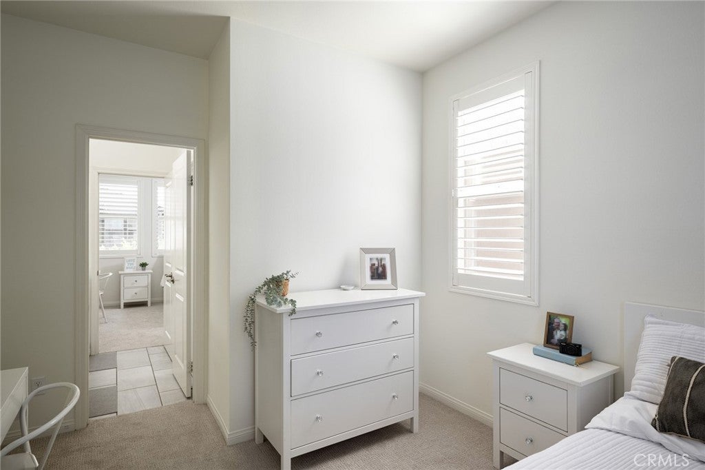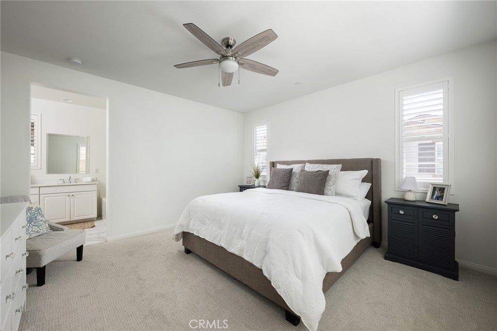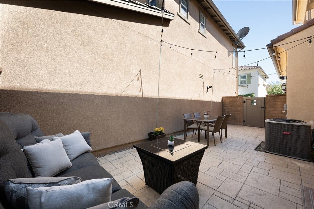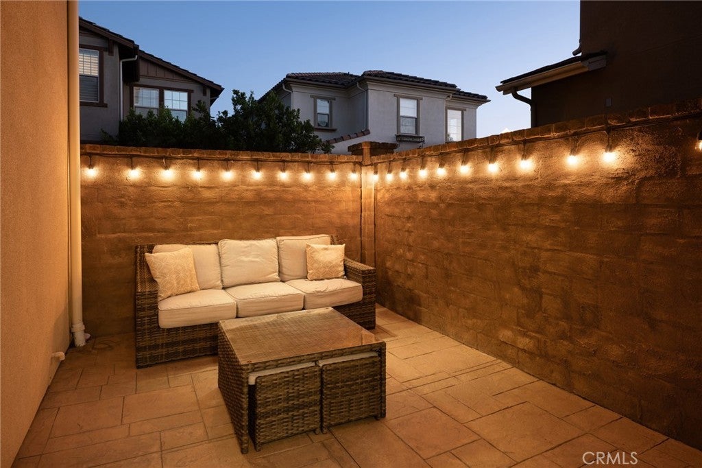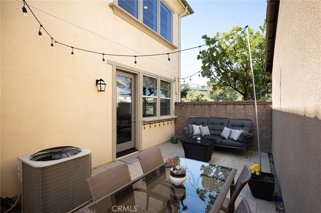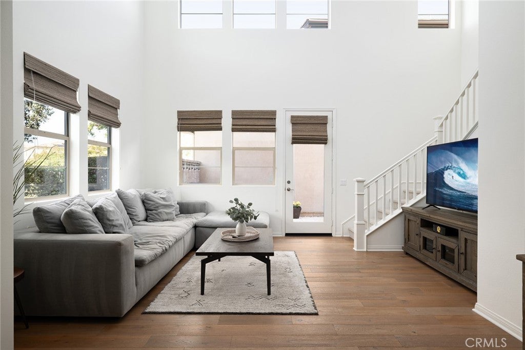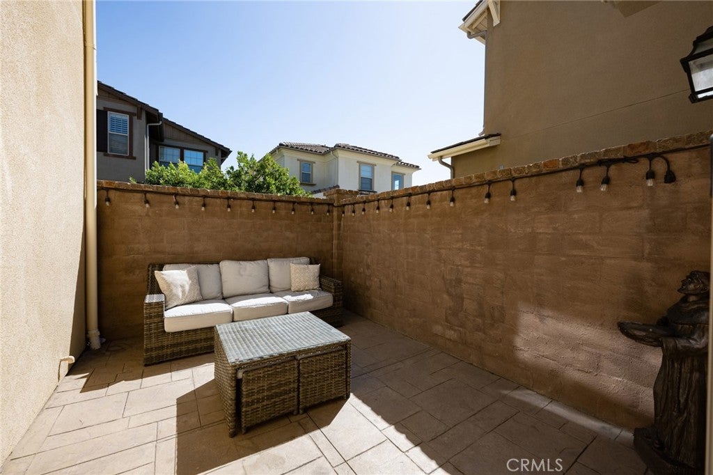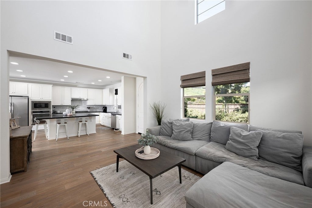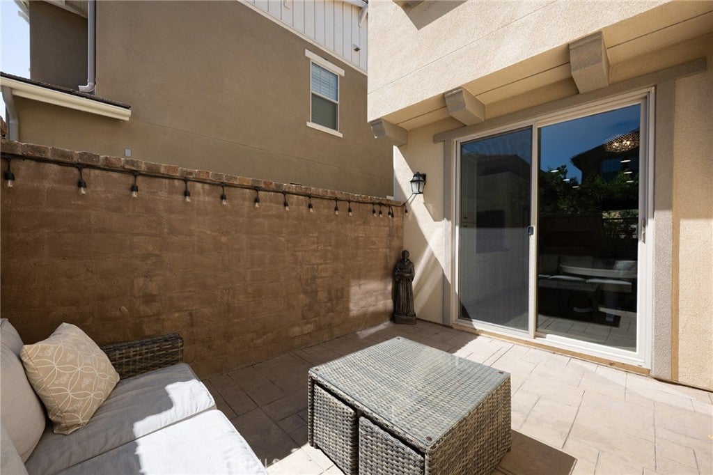 Welcome to this exceptional 3-bedroom, 2.5-bathroom single-family home offering 1,921 sq. ft. of stylish living in the highly sought-after Citron neighborhood of Rancho Mission Viejo. This unique residence boasts a private front entrance with serene hillside views right from your doorstep. Inside, an open and airy layout is highlighted by soaring two-story ceilings, gorgeous engineered hardwood floors, plantation shutters, and custom window shades. At the heart of the home, the oversized kitchen island with quartz countertops provides the perfect gathering space for cooking, dining, and entertaining. The kitchen is further enhanced with a marble backsplash, Whirlpool stainless steel appliances, crisp white shaker cabinetry with soft-close drawers, and abundant pantry storage. Counter seating offers a spot for casual meals, while the adjacent dining area is ideal for larger gatherings. Upstairs, the primary suite serves as a relaxing retreat with a spa-inspired en-suite featuring dual vanities, a soaking tub, a separate walk-in shower, and a generous walk-in closet. Two secondary bedrooms connected by a pass through bathroom, plus a convenient laundry room with sink, overhead cabinetry, and folding counter, complete the second floor. Perfect for indoor-outdoor living, the home also features two upgraded backyard patios with stamped concrete—ideal for entertaining, relaxing, barbecuing, or playtime with pets. Residents of Esencia enjoy an unmatched lifestyle with access to resort-style amenities, including multiple clubhouses, 8 pools, 3 state-of-the-art gyms, sports fields, a dog park, community farms, scenic hiking trails, tennis and pickleball courts, the Boulder Pond, Camp Out facility, and more. Families will love the close proximity to the award-winning Esencia K-8 School. With a prime location just 15 minutes from the beach and quick access to the 241 and 5 freeways, this home truly captures the best of Southern California living.
