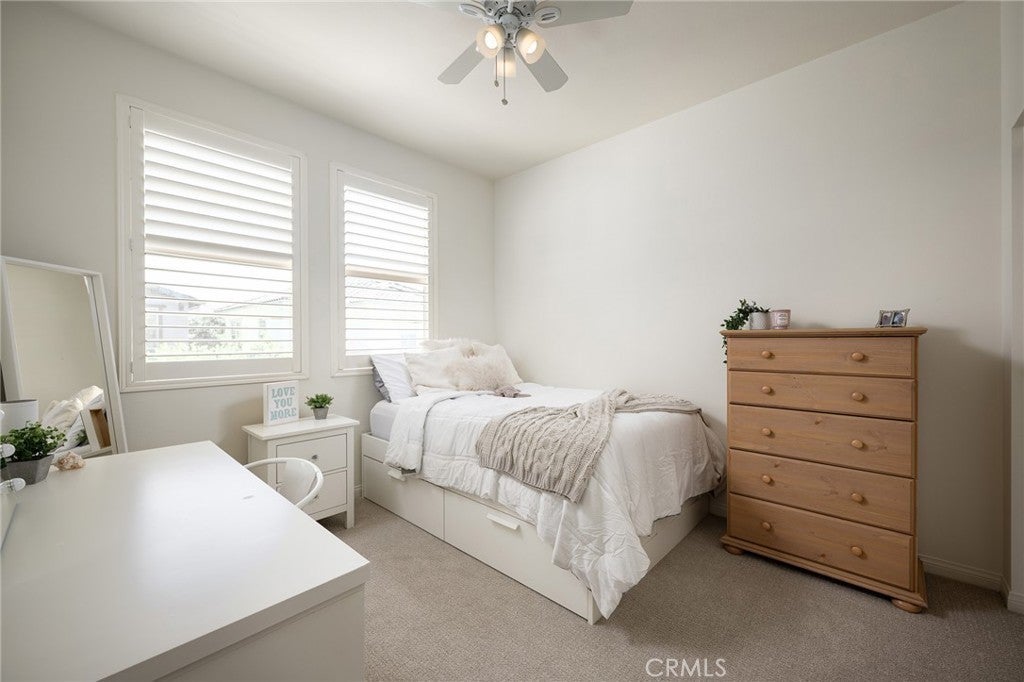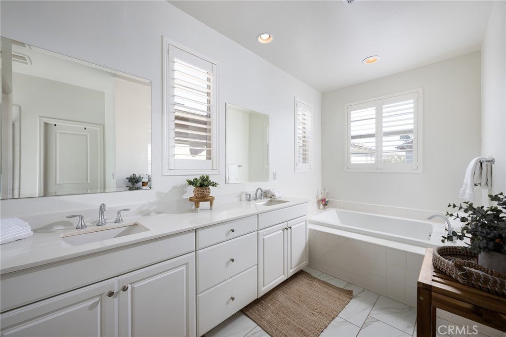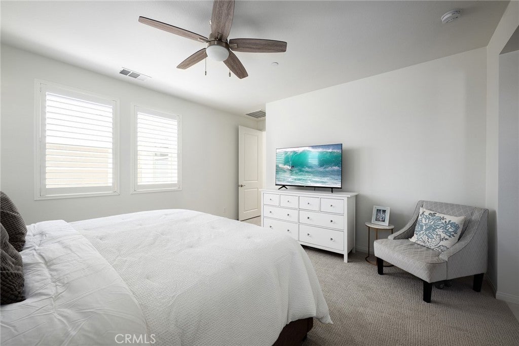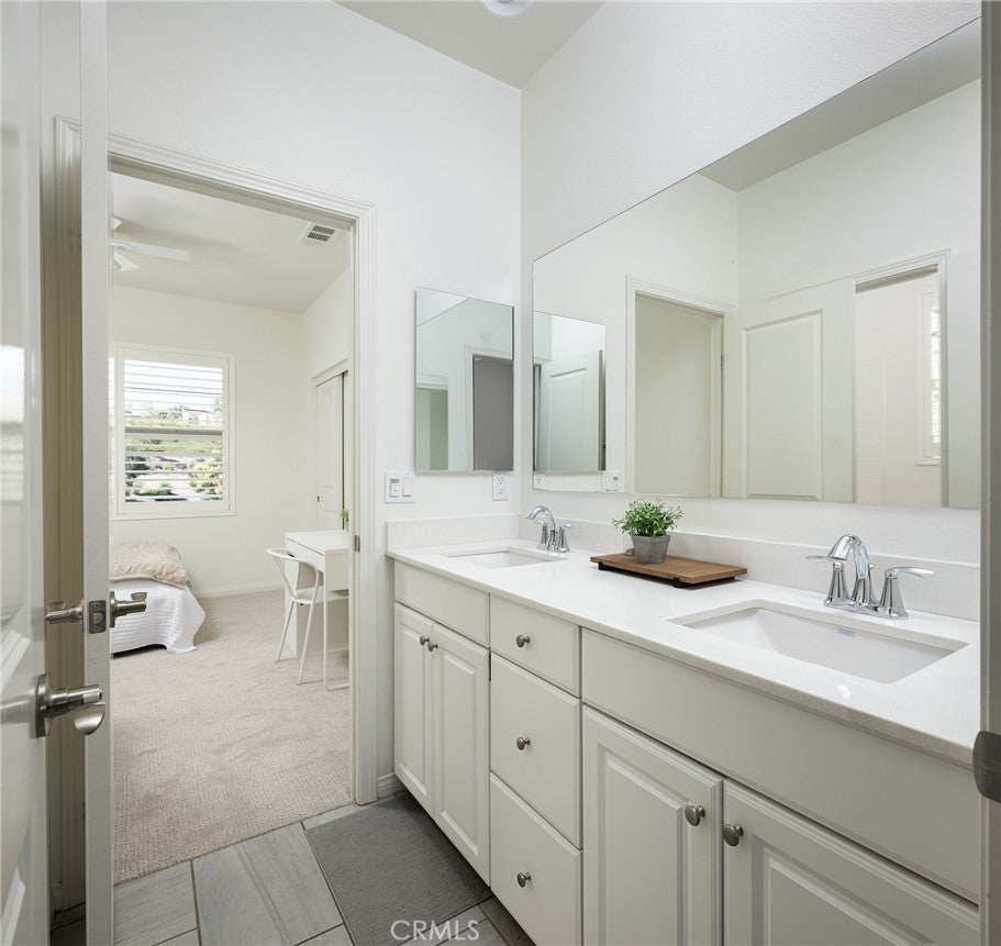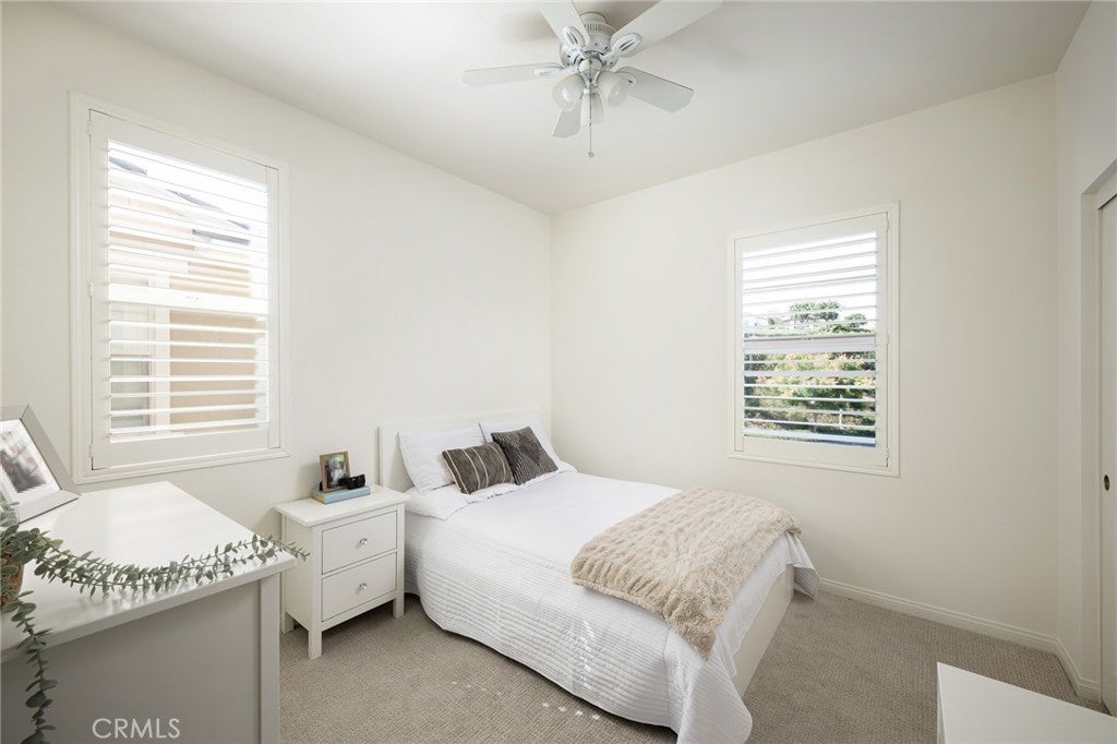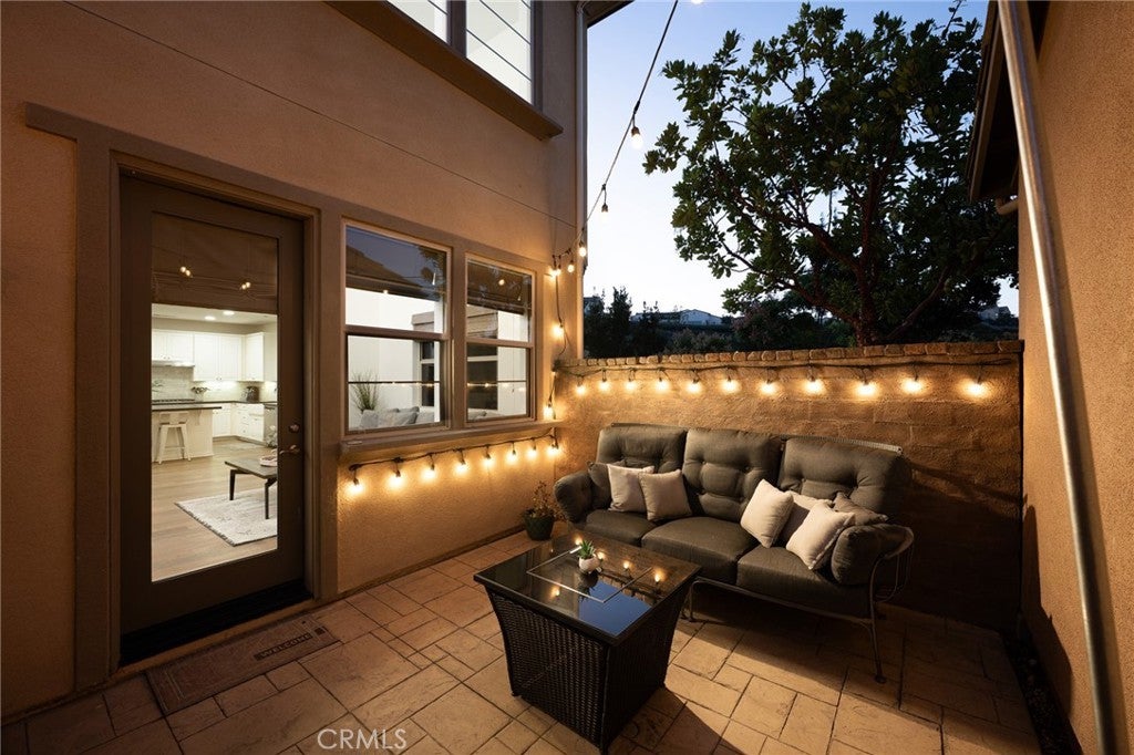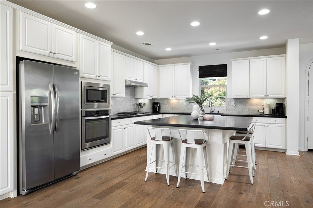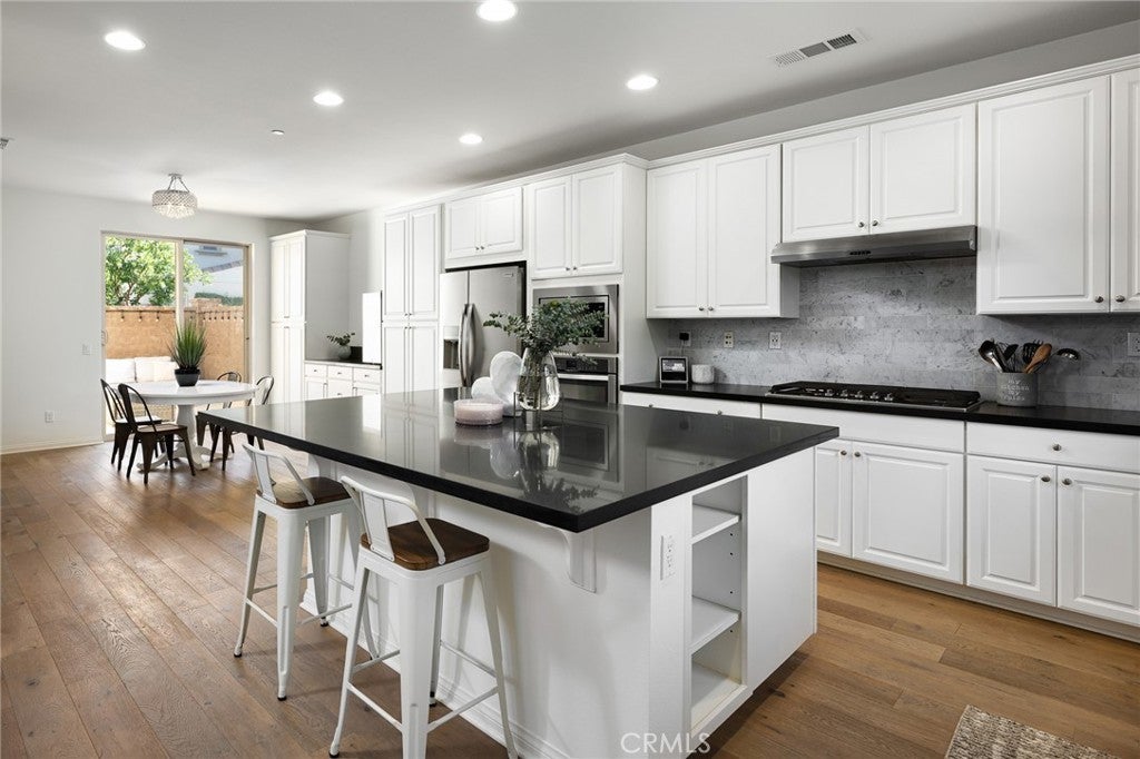 Welcome to this exceptional 3-bedroom, 2.5-bathroom single-family home offering 1,921 sq. ft. of stylish living in the highly sought-after Citron neighborhood of Rancho Mission Viejo. This unique residence boasts a private front entrance with serene hillside views right from your doorstep. Inside, an open and airy layout is highlighted by soaring two-story ceilings, gorgeous engineered hardwood floors, plantation shutters, and custom window shades. At the heart of the home, the oversized kitchen island with quartz countertops provides the perfect gathering space for cooking, dining, and entertaining. The kitchen is further enhanced with a marble backsplash, Whirlpool stainless steel appliances, crisp white shaker cabinetry with soft-close drawers, and abundant pantry storage. Counter seating offers a spot for casual meals, while the adjacent dining area is ideal for larger gatherings. Upstairs, the primary suite serves as a relaxing retreat with a spa-inspired en-suite featuring dual vanities, a soaking tub, a separate walk-in shower, and a generous walk-in closet. Two secondary bedrooms connected by a pass through bathroom, plus a convenient laundry room with sink, overhead cabinetry, and folding counter, complete the second floor. Perfect for indoor-outdoor living, the home also features two upgraded backyard patios with stamped concrete—ideal for entertaining, relaxing, barbecuing, or playtime with pets. Residents of Esencia enjoy an unmatched lifestyle with access to resort-style amenities, including multiple clubhouses, 8 pools, 3 state-of-the-art gyms, sports fields, a dog park, community farms, scenic hiking trails, tennis and pickleball courts, the Boulder Pond, Camp Out facility, and more. Families will love the close proximity to the award-winning Esencia K-8 School. With a prime location just 15 minutes from the beach and quick access to the 241 and 5 freeways, this home truly captures the best of Southern California living.