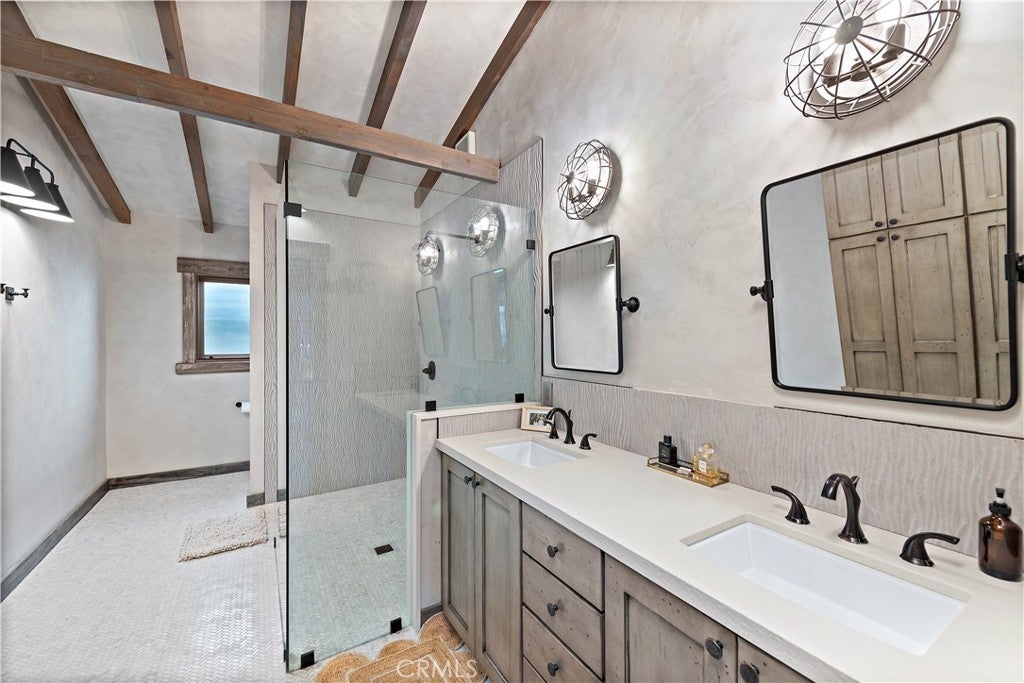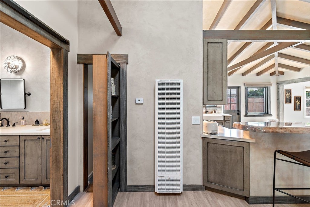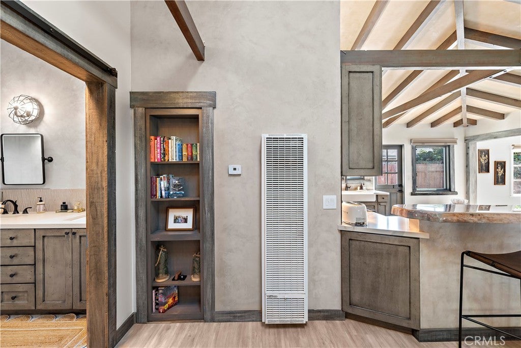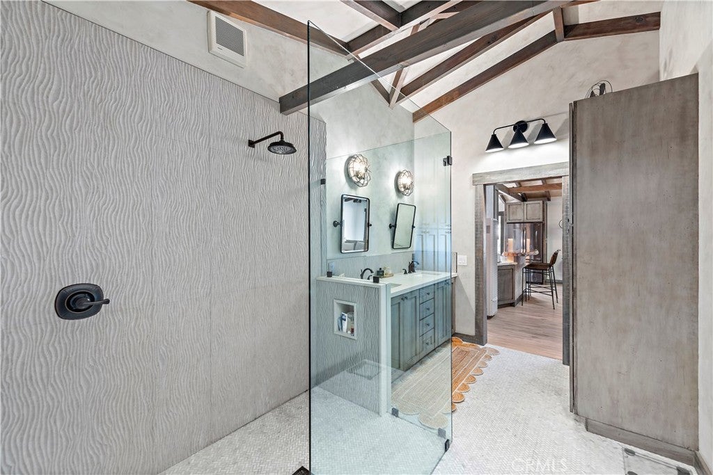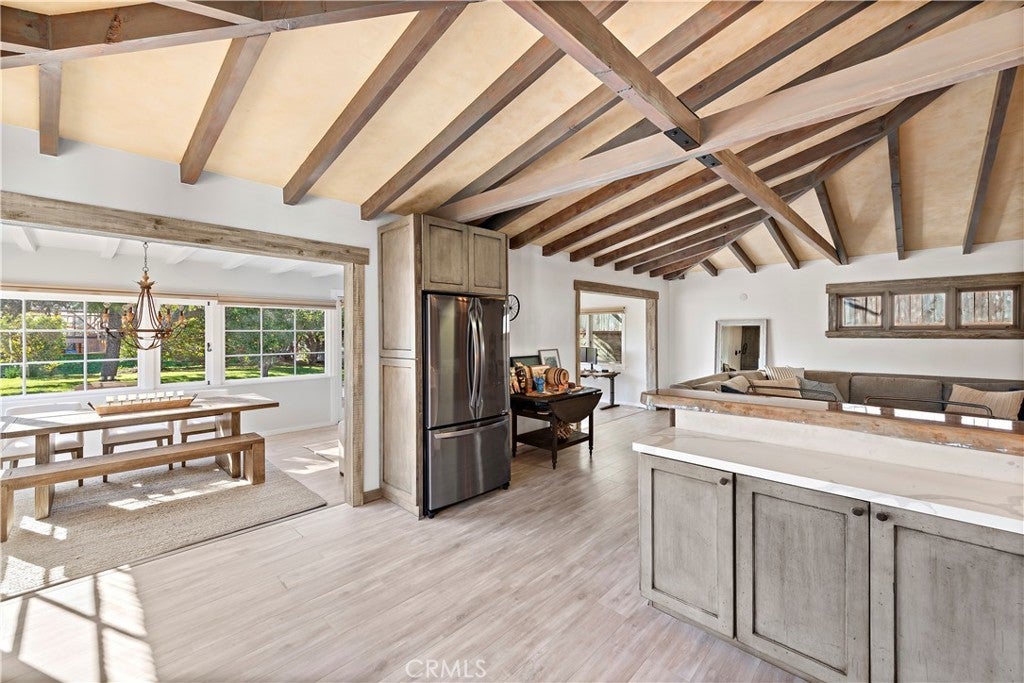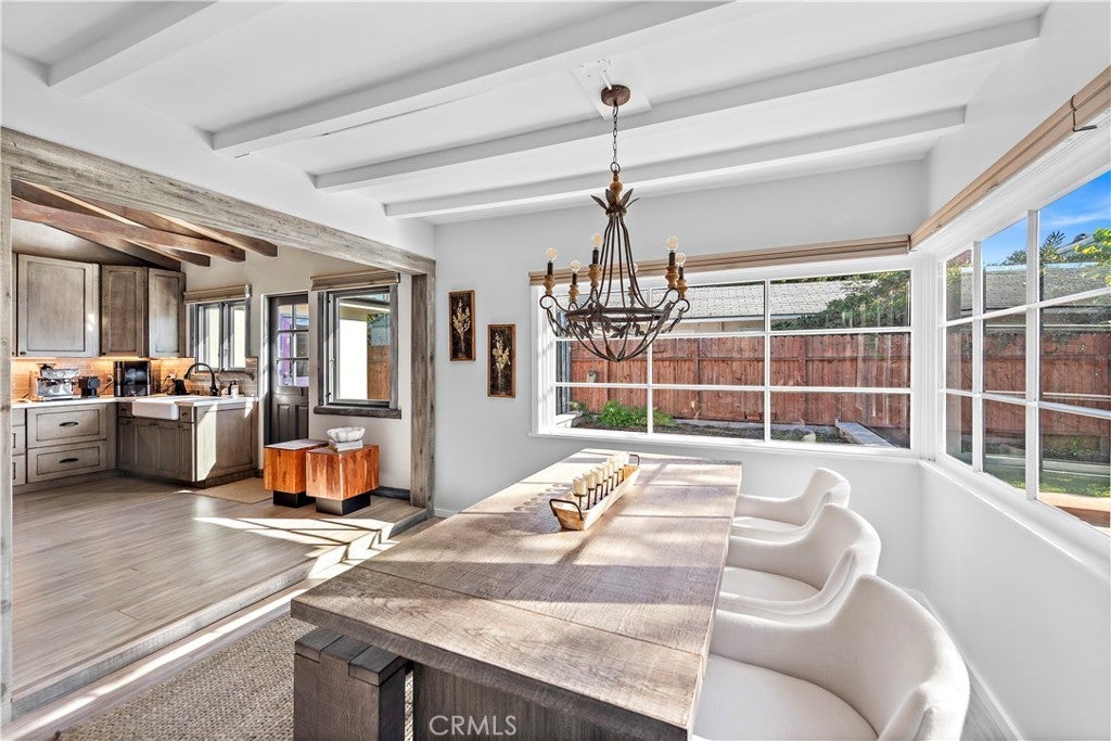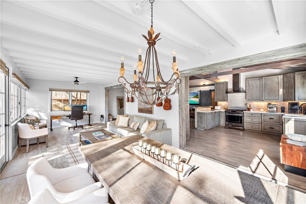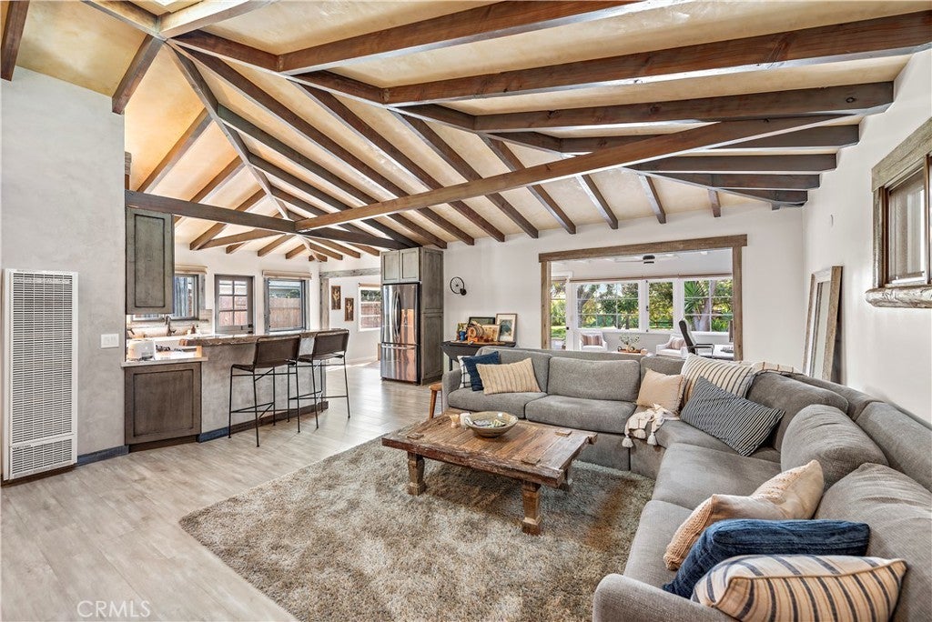 Welcome to this unique opportunity, nestled on a spacious lot just a short stroll from T-Street Beach, this single story home welcomes you with an airy open-concept layout that invites an abundance of natural light with a large private yard engulfed with mature trees and landscape. A blend of modern design and rustic charm creates a warm and inviting atmosphere throughout. Inside, you'll find wide-plank luxury vinyl flooring, vaulted beamed ceilings, wood-cased windows, oversized barn doors, and an open concept sunroom that leads to the outdoor living areas, patio and yard. The kitchen is equipped with custom cabinetry, a large single-basin sink, high-end LG stainless steel appliances, and a peninsula with seating. The primary bedroom and bathroom offer a luxurious retreat with a quartz-topped dual vanity, a generously sized wood-framed mirror, a stylish frameless walk-in shower with patterned tile, and ample linen storage. Outside, the property features a spacious lawn for entertaining, relaxing, sunbathing or just to stroll around, a concrete patio with a built-in planters, and multiple areas for activities. Walk-through you secret bookshelf door onto the attached two-car garage with ample storage cabinets, a convenient laundry area, and updated plumbing and electrical systems throughout. This is your opportunity to walk to the beach, and explore what San Clemente has to offer. Conveniently located to Shops, Dinning, and Stores and easy for commuting.