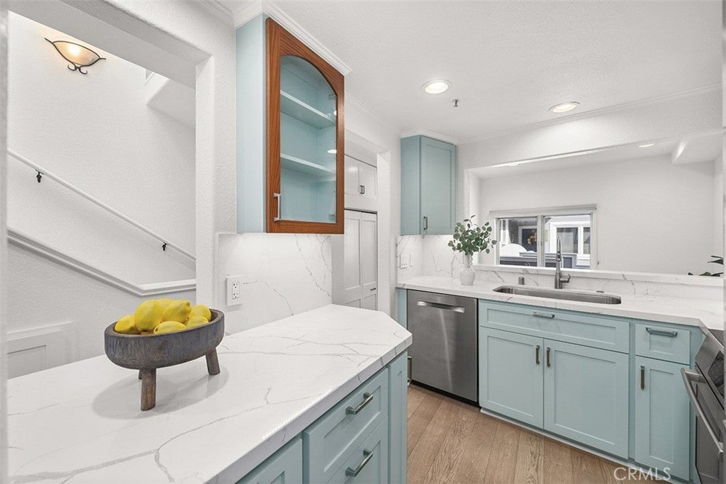 LOCATION ALERT! Downtown Lantern District! Very High Walkability Score! Immerse yourself in coastal living at this beautifully updated 2-bed, 2.5-bath condo in the heart of Dana Point’s Lantern District. The open living area welcomes natural light through sliding glass doors that let in a refreshing ocean breeze, complemented by wide-plank flooring and a marble-surround fireplace. The remodeled kitchen impresses with quartz countertops, turquoise shaker cabinetry, and Bosch stainless-steel appliances. Upstairs, two private en-suite bedrooms include a tranquil primary suite with ocean views that frame the sunset sky. Fresh paint, carpet, and designer lighting elevate every corner. Secure gated parking, elevator access, and a private garage offer everyday convenience. Perfectly positioned near the new $400M harbor revitalization, coastal cafes, elevated dining and boutique shops, this turnkey home captures the essence of effortless luxury and relaxed Southern California living.