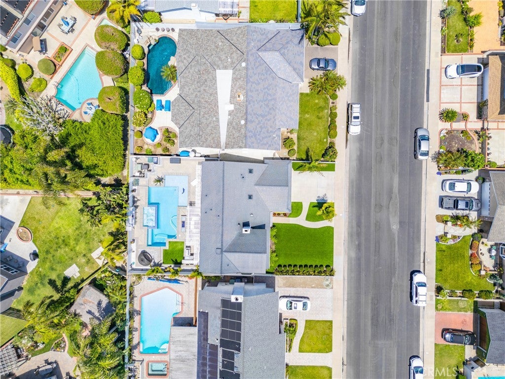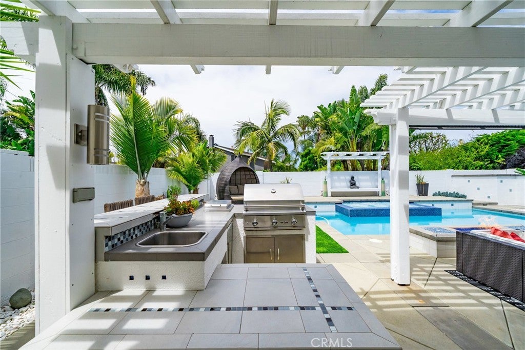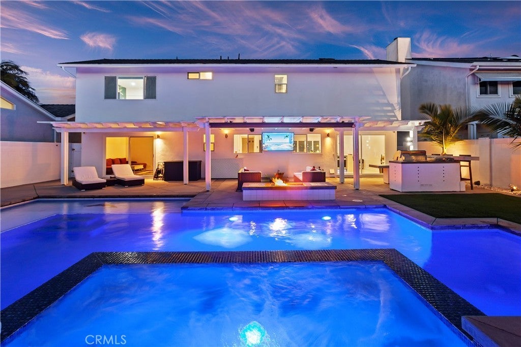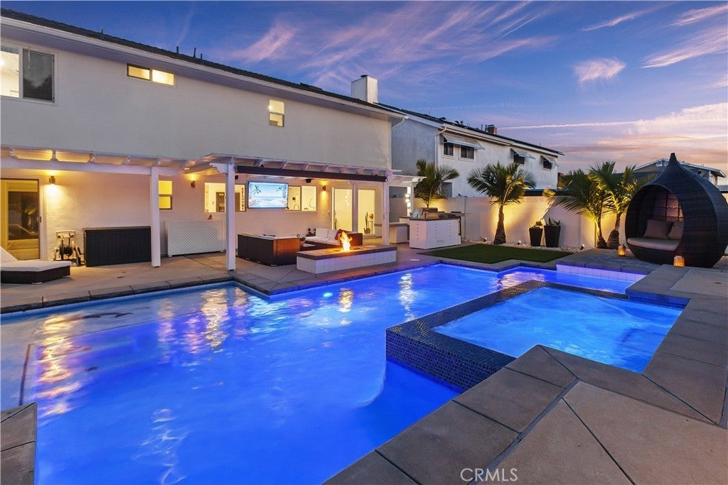 Welcome to this exceptional, renovated home blending high-end design, smart technology, and resort-style outdoor living. Located on a quiet interior street in the highly sought after Moffett tract, this home truly has it all. Every detail has been thoughtfully curated—from the reimagined front yard with lush landscaping, low-maintenance turf, new King palm, privacy fencing, and app-controlled irrigation system—to the stunning indoor and outdoor upgrades. The entry porch features stylish, no-slip tile, while the upgraded garage includes vinyl flooring, a smart door system, new water heater, and washer/dryer. Inside, the open-concept main level showcases heated Italian porcelain tile flooring and a show-stopping kitchen with a custom Italian quartz island, built-in convection oven, sensor glass cooktop, downdraft vent, microwave drawer, and sleek soft-close cabinetry in walnut and fingerprint-resistant gloss white. Under-cabinet LED lighting with app-controlled color options completes the modern aesthetic. Large sliding doors open to a true backyard retreat: a custom-built BBQ island with fridge, sink, gas grill, side burner, storage, ambient lighting, and two seating areas. Entertain with ease around the gas fire-pit or waterproof outdoor TV, or unwind in the state-of-the-art salt water pool and spa, featuring massage jets, a waterfall, Baja step, upgraded heater, and app-controlled lighting—all surrounded by lush landscaping and a new brick paver patio with a cozy daybed. The main floor includes a bedroom and beautifully updated bathroom with white marble-look tile, matte black fixtures, and a rain shower. Upstairs, the luxurious primary suite offers heated floors and a huge walk-in closet with custom built-ins and a frosted glass barn door. The spa-inspired bathroom features black porcelain tile, gold fixtures, a Kohler digital steam shower with six body sprays, bluetooth speakers, dual waterfall sinks, invisible drains, and floating walnut vanities with under-cabinet lighting. A third spacious bedroom includes an en suite bath, large closet, and sweeping views of the pool and Huntington Beach sunsets. This home also features a whole-house Sonos sound system (app-enabled) for seamless indoor and outdoor audio in the living room, primary suite, and patio. With so many features, this home is a must see and is the epitome of SoCal living near the beach, top-rated schools, shopping, dining, and entertainment.