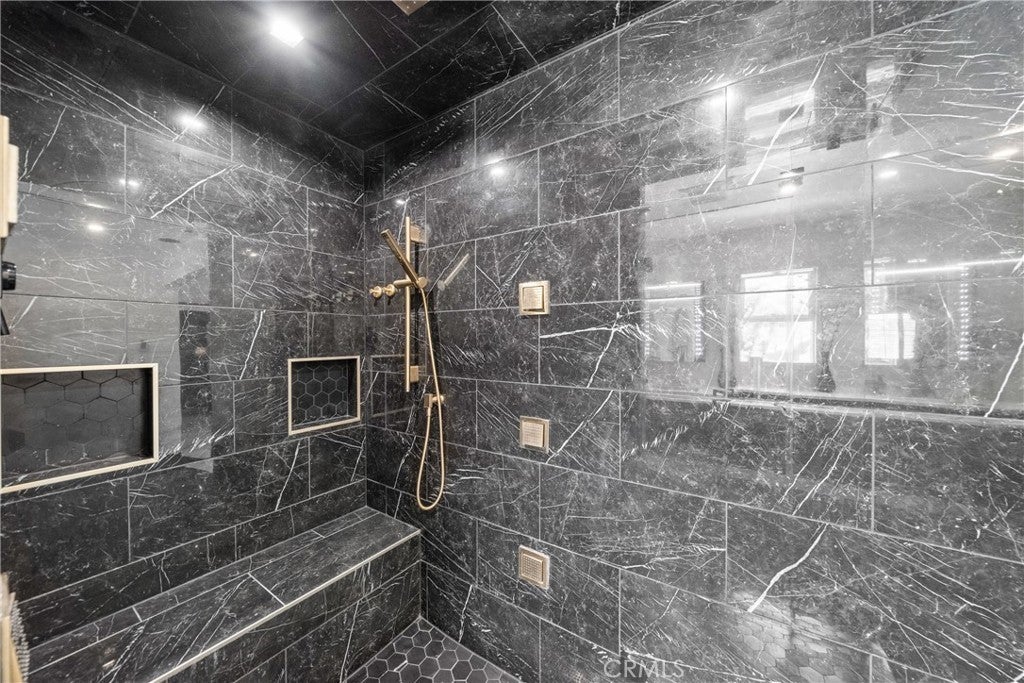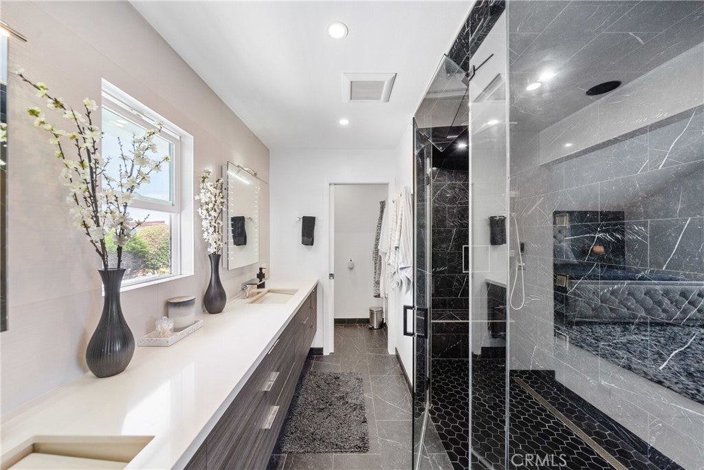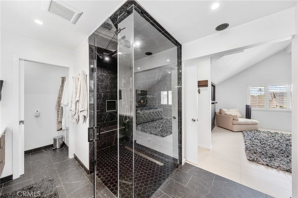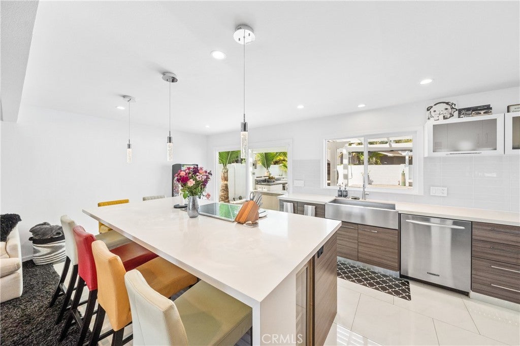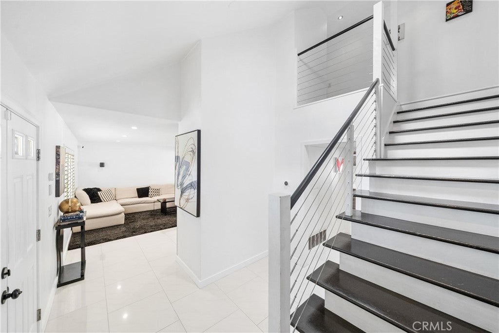 Welcome to this exceptional, renovated home blending high-end design, smart technology, and resort-style outdoor living. Located on a quiet interior street in the highly sought after Moffett tract, this home truly has it all. Every detail has been thoughtfully curated—from the reimagined front yard with lush landscaping, low-maintenance turf, new King palm, privacy fencing, and app-controlled irrigation system—to the stunning indoor and outdoor upgrades. The entry porch features stylish, no-slip tile, while the upgraded garage includes vinyl flooring, a smart door system, new water heater, and washer/dryer. Inside, the open-concept main level showcases heated Italian porcelain tile flooring and a show-stopping kitchen with a custom Italian quartz island, built-in convection oven, sensor glass cooktop, downdraft vent, microwave drawer, and sleek soft-close cabinetry in walnut and fingerprint-resistant gloss white. Under-cabinet LED lighting with app-controlled color options completes the modern aesthetic. Large sliding doors open to a true backyard retreat: a custom-built BBQ island with fridge, sink, gas grill, side burner, storage, ambient lighting, and two seating areas. Entertain with ease around the gas fire-pit or waterproof outdoor TV, or unwind in the state-of-the-art salt water pool and spa, featuring massage jets, a waterfall, Baja step, upgraded heater, and app-controlled lighting—all surrounded by lush landscaping and a new brick paver patio with a cozy daybed. The main floor includes a bedroom and beautifully updated bathroom with white marble-look tile, matte black fixtures, and a rain shower. Upstairs, the luxurious primary suite offers heated floors and a huge walk-in closet with custom built-ins and a frosted glass barn door. The spa-inspired bathroom features black porcelain tile, gold fixtures, a Kohler digital steam shower with six body sprays, bluetooth speakers, dual waterfall sinks, invisible drains, and floating walnut vanities with under-cabinet lighting. A third spacious bedroom includes an en suite bath, large closet, and sweeping views of the pool and Huntington Beach sunsets. This home also features a whole-house Sonos sound system (app-enabled) for seamless indoor and outdoor audio in the living room, primary suite, and patio. With so many features, this home is a must see and is the epitome of SoCal living near the beach, top-rated schools, shopping, dining, and entertainment.