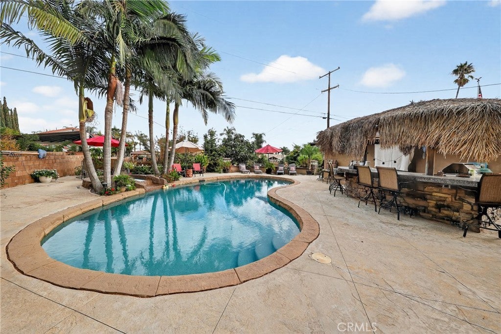This home is a one-of-a-kind, single-story, turnkey pool home. Featuring three bedrooms, two bathrooms, and a large 12,197 square foot lot. Manicured landscaping in front and back with fruit trees and automatic timed sprinkler systems. The micro orchard includes avocado, lemon, cherry, tangerine, fig, pear, apple, and a fruit cocktail tree (white peach, yellow peach, and plum). Gorgeous pool and spa with plenty of room for entertaining, built-in granite tiled BBQ with bar seating, brand new palapa, storage shed, and horseshoe pit. Resort-like, beautifully landscaped, very quiet, and very private back yard oasis. Oversized finished 2 1/2 car garage. ADU opportunity! All the rooms are wired for wall-mounted TVs. Ceiling fans in all rooms. 2” Faux wood blinds on all windows. Galley kitchen with stainless steel appliances, granite countertops, undercabinet lighting, and a garden window. Original oak hardwood floors throughout. Wood-burning fireplace in an open living room. Expansive driveway for RV access and up to 10 cars, along with RV hookups. Close to freeways, schools, entertainment, and shopping.