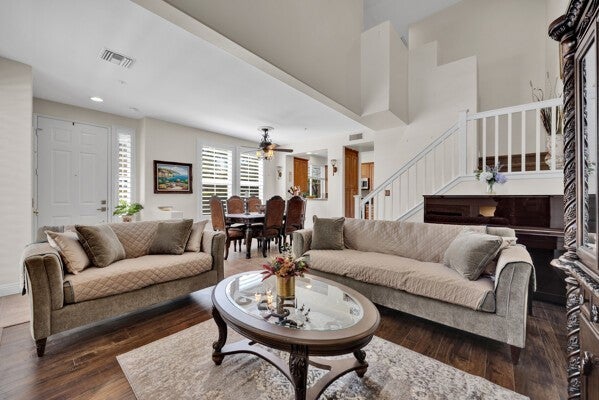 Welcome to the highly desirable location of Terracina—a beautiful end-unit townhouse that feels more like a private, detached home. Recently remodeled with beautiful engineered hardwood flooring throughout, soaring vaulted ceilings, plantation shutters and an abundance of natural light with an open-concept design that creates a welcoming and spacious atmosphere. The kitchen features custom cabinetry, stunning granite countertops, and stainless-steel appliances perfect for entertaining. The primary suite boasts remodeled bathroom with tiled shower and glass enclosure. Two secondary bedrooms and spacious secondary bathroom, also remodeled has granite counters and two sinks, upgraded mirrors and lighting. Other highlights include a fully updated HVAC system, ceiling fans, and a versatile third bedroom. The garage offers overhead storage as well as extra built in storage space. Step outside to the patio, ideal for gatherings and outdoor enjoyment. Located conveniently near the 241 toll road, top-rated schools, shopping, various dining options, and access to Rancho Santa Margarita Lake along with all the SAMLARC parks and facilities.