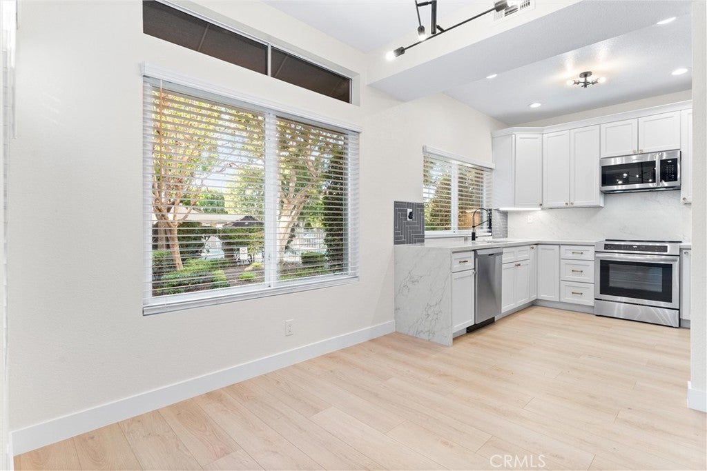 Welcome to this beautifully renovated single-level home in the heart of Dana Point! This 2 bed, 2 bath residence offers modern comfort and coastal charm in an unbeatable location. The home features a fully renovated kitchen with quartz countertops, shaker cabinetry, and brand new stainless steel appliances (refrigerator included). It also boasts two completely renovated bathrooms, new luxury vinyl flooring, and fresh interior paint throughout. The open-concept living area includes a cozy fireplace and access to a private covered patio, perfect for relaxing or entertaining. Enjoy the convenience of an indoor laundry room (washer and dryer included) and direct access to the attached garage. Central heating and air conditioning ensures year round comfort, and the community pool is just steps away. Ideally situated within walking distance to the Ocean Ranch Village shopping center, this home offers the perfect blend of convenience and coastal living. And just 5 minutes to Dana Point’s beautiful beaches!