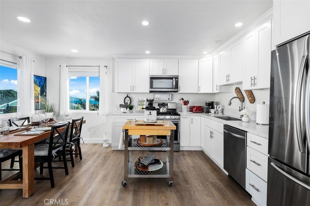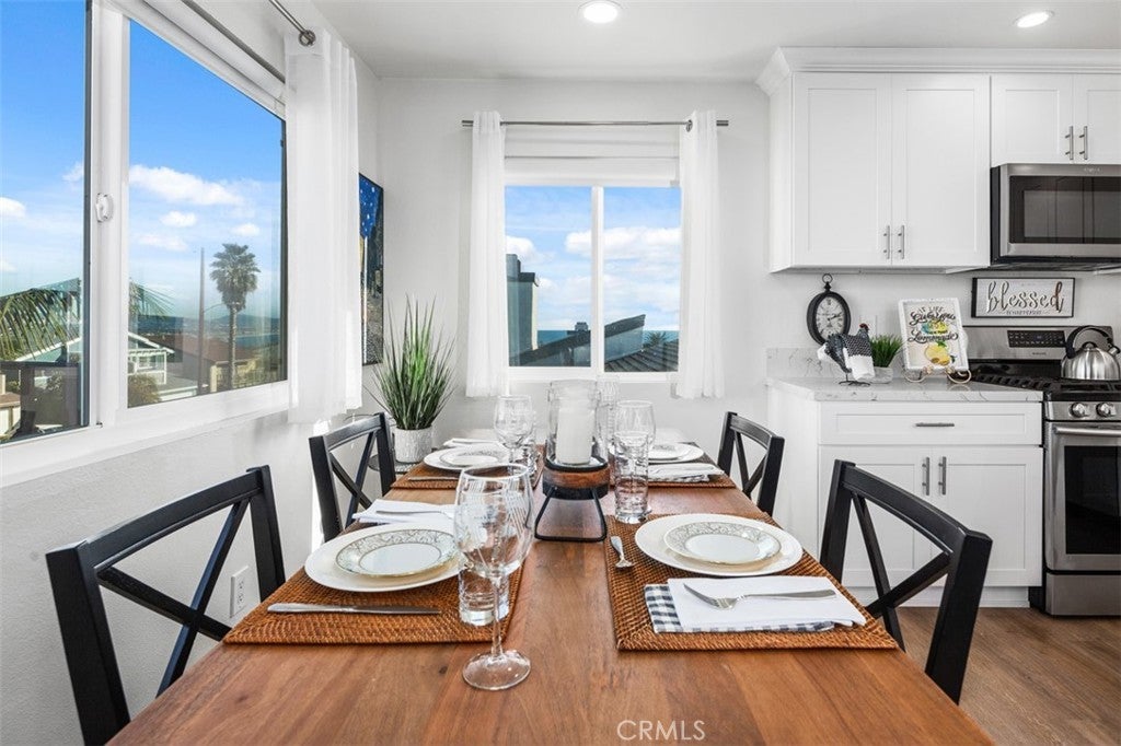 Are you ready to live in luxury? This is the quintessential Southern California rental property that you have been looking for! With absolutely stunning white water views throughout the single-level home, you are bound to fall in love with it from the moment you walk inside. The interior of this property boasts a relaxing beach vibe with the crystal clear blue of the ocean water filling the interior through the windows looking out to the horizon. You will not only love the views, but you will also enjoy living in this stunningly renovated property. The open floorplan great room allows the living room to open directly to the kitchen and dining area. The beautiful kitchen features white cabinetry, which matches perfectly with the stainless steel refrigerator, gas range, oven, microwave, dishwasher, and sink. Matching cabinet handles, quartz countertops, and light-grain laminate flooring finish off the gorgeous open space. Recessed lighting, arched door openings, and laminate flooring follow you throughout the rest of the property, which is comprised of 2 large bedrooms and 2 beautiful bathrooms. Both renovated bathrooms, one being an en-suite in the primary bedroom and the other being a hallway bathroom, feature walk-in showers with floor-to-ceiling porcelain tiles, stone pebble flooring, frameless glass barn doors, stainless steel accents, and beautiful white vanities. The large balcony just off the dining area is bound to be the place you spend most nights with its beautiful brick accents, open space for multiple chairs and tables, and absolutely stunning views of the ocean and clear skies beyond. The property includes a 1-car garage with 4’x8’ overhead steel storage rack and a common indoor laundry room. With close proximity to the highly popular Lantern District, Dana Point Habor, Doheny Beach, and multiple five-star hotels, you truly cannot be in a better location. Whether you prefer the ease of an exquisitely fully furnished home or the blank canvas of an unfurnished space, this property allows you to move in and begin your luxurious Southern California dream!