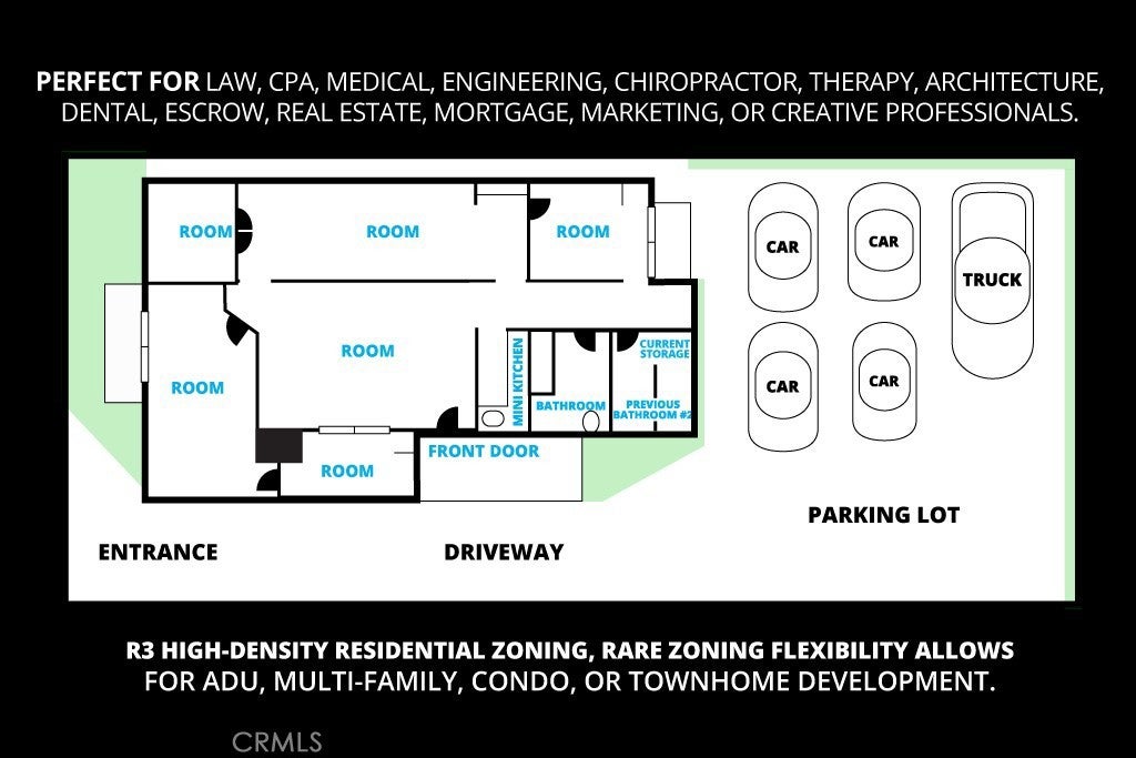Rare Tustin–near Irvine opportunity to own a permitted office space or redevelop a versatile R3-zoned property offering multiple exit strategies and immediate income potential. Perfect for owner-users, investors, or developers seeking future redevelopment upside in a high-demand corridor. Currently operating as a professional office since 1980 (improved 2020), but zoned for high-density residential including ADU, multi-family, condos, or townhomes. Perfect for owner-users needing premium office space TODAY, investors seeking cash flow with future upside, or developers analyzing infill opportunities. Shovel-Ready Infrastructure: Plumbing and utilities already in place for two bathrooms + full kitchen, dramatically reducing conversion costs. Turnkey for immediate professional use or ready for residential/mixed-use transformation with zoning that allows multi-family, condo, townhome, ADU, or mixed-use development. This high-visibility location on Red Hill Ave near the I-5 Freeway is ideal for a wide range of top-performing professionals seeking a corporate home, including: Law, CPA, Medical, Dental, Therapy, Chiropractic, Physical Therapy, Mental Health, Architecture, Engineering, Real Estate, Mortgage, Insurance, Financial Planning, Marketing, Consulting, Creative, Photography, Design Studios, Tech Startups, Insurance Agencies, Tech Consultants, Financial Planners, Private Tutors, MedSpa, owner-user investors, any professional seeking a private stand-alone office and/or developers, and small multifamily builders seeking future redevelopment upside in a high-demand corridor. Multiple paths to profit: Owner-users build equity while deducting expenses | Investors lease now, redevelop later | Developers maximize R3 density for multi-family/condo projects | Live/work buyers convert to residence + ADU income. R3 zoning in high-demand Tustin corridor with infrastructure in place = reduced risk, faster returns, proven exit strategies!