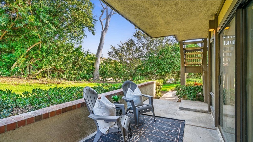BEAUTIFULLY REMODELED CORNER CONDO ON A PRIVATE GREENBELT WITH AN OPEN FLOOR PLAN AND THREE SEPARATE PATIOS. This bottom-level residence offers one-level living with high smooth ceilings, recessed lighting, and large windows that fill the space with natural light. The den has been converted into a true third bedroom complete with doors and a closet. The kitchen, dining room, and living room are seamlessly connected, while each area, including the spacious primary bedroom, has its own sliding glass door leading to a patio. Situated down the hall, the front bedroom is conveniently located next to the hall bathroom, providing easy access for guests, while further along is the primary bedroom with its own ensuite bathroom featuring a double-sink vanity and a privacy door to the shower. Recent updates include a new roof and tenting completed in Summer 2023, with the HOA special assessment fully paid. The remodel, which is HOA approved and permitted, features a new HVAC system, porcelain tile flooring in the kitchen and bathrooms, Shaw luxury vinyl plank flooring throughout, solid core doors, elegant maple kitchen cabinets, quartz countertops and backsplashes, LED mirrors in bathrooms, a striking black marble porcelain tile fireplace wall, and fresh paint throughout. Resident amenities include two community pools and spas, with association dues covering water, trash, and exterior maintenance. Located in the acclaimed Irvine School District, including University High, this condo is conveniently situated near UCI, William Mason Park, John Wayne Airport, Newport Beach, and Fashion Island, providing a truly turnkey home with an interior that feels like new construction. See Virtual 3D Walkthrough at https://my.matterport.com/show/?m=t6zHgD1K9RW&brand=0