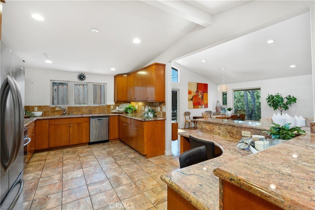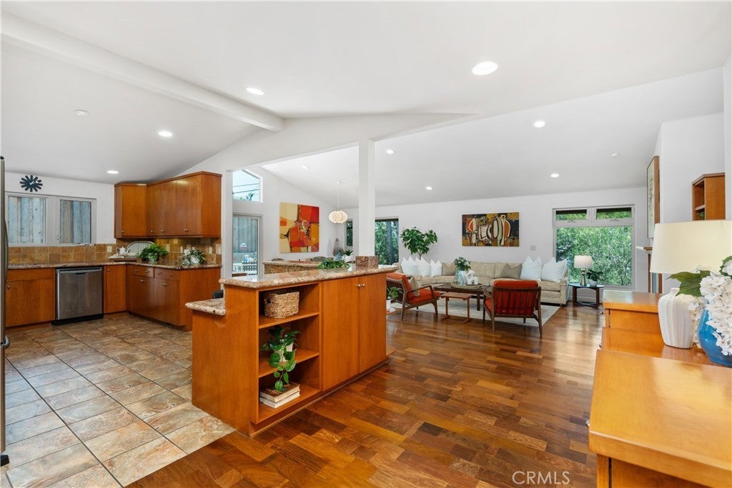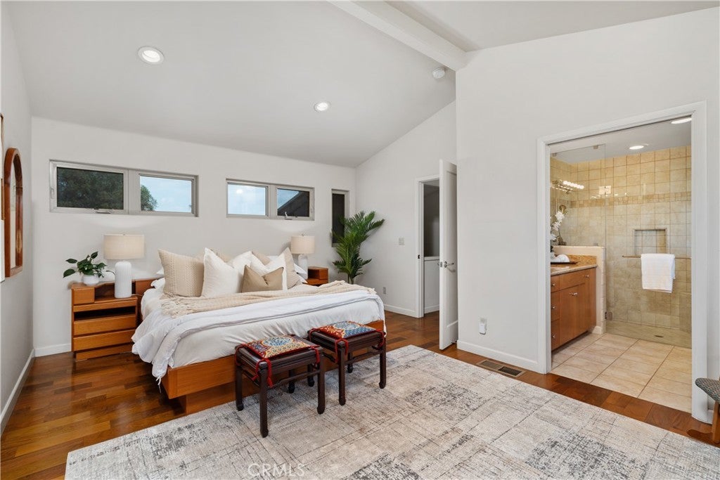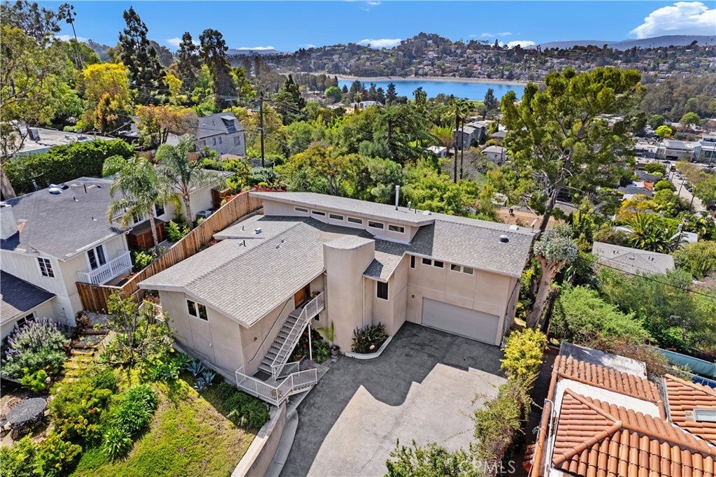 2377 Silver Ridge Avenue, a stunning retreat perched up high in Silver Lake, offers breathtaking views of the Hollywood Sign, Griffith Observatory, and the surrounding hills, providing modern living in one of L.A's most vibrant neighborhoods. This home combines luxury, functionality, and style with thoughtful design elements throughout. The home features a spacious driveway that accommodates 5 or more cars, a rarity in the area, along with a direct-access 2 car garage. Recessed lighting, hardwood flooring, and abundant windows flood the home with natural light. Designed to live like a single-level home, the primary bedroom, secondary bedroom, kitchen, living room, and laundry room are all conveniently located on the main level. The home was also designed to accommodate a future elevator if desired. The great room concept seamlessly connects the kitchen, family room, and dining area, with the dining space offering direct access to a tranquil patio, ideal for entertaining. The kitchen includes a step-in pantry, granite countertops, stainless steel appliances, a gas cooktop with a vent hood, and ample cabinetry. A counter seating area also serves as a convenient workspace. The primary bedroom offers captivating views of Silver Lake, the Hollywood Sign & Griffith Observatory, with a spacious walk-in closet featuring a custom built-in storage system. The ensuite bathroom includes a luxurious bayless walk-in shower, bench seating and multiple shower heads, plus a separate make-up vanity area. The secondary main-level bedroom is currently used as an office/den, with direct access to the patio. The secondary bathroom features a tub/shower combo. The outdoor patio area is peaceful and perfect for barbecues and outdoor gatherings. The lower level includes a third bedroom, ideal as a guest bedroom or private office, as well as a powder bath and a flex space currently used as a fitness area. The direct-access garage is also on this level, with the home designed for a potential future elevator installation. Located in the heart of Silver Lake, this home is just minutes from Whole Foods, Silver Lake Library, trendy cafes, shops, and green spaces around the Silver Lake Reservoir. Griffith Park, the Hollywood Hills, and Downtown L.A. are all easily accessible. Silver Lake is known for its modernist architecture, artistic vibe, and dynamic food scene. The neighborhood's blend of culture, nature, and nightlife makes it one of the most desirable areas to live in Los Angeles.