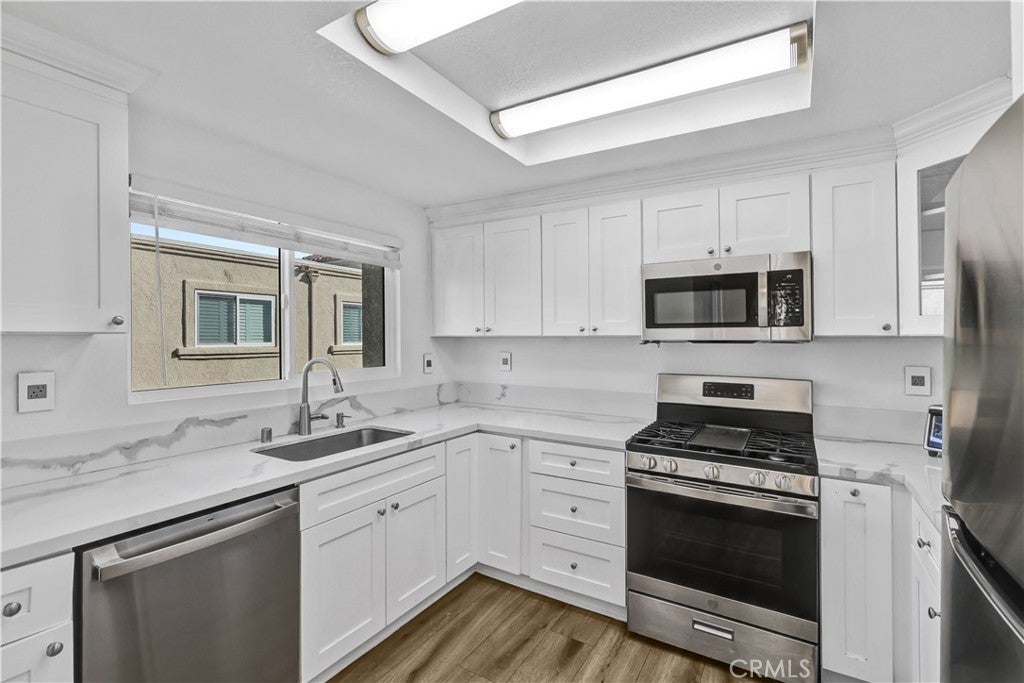 Discover this highly sought-after condo in the charming Vista Del Flores community of Lake Forest! This home features soaring vaulted ceilings, an open-concept layout, and a private balcony with serene greenbelt views. Enter from the ground-level 1-car garage with direct access and in-unit laundry. Upstairs, the sun-filled family room boasts plantation shutters, a tiled fireplace, and fresh vinyl flooring—plus, no one lives above or below for added tranquility. The kitchen impresses with stainless steel appliances, quartz countertops, and crisp white cabinetry. Retreat to the spacious master suite with double-door entry, mirrored closets with organizers, and an ensuite bathroom with tub/shower combo. Vista Del Flores offers beautifully maintained grounds, a sparkling pool, spa, park, and is close to top-rated schools, shopping, and dining.
