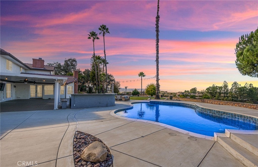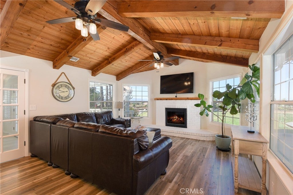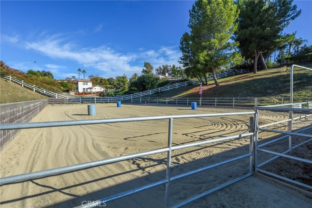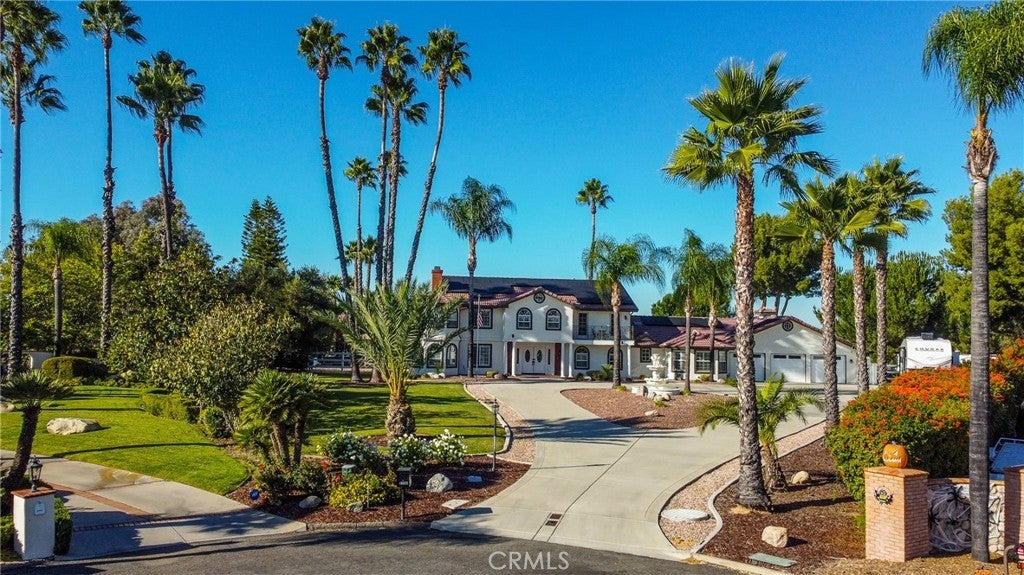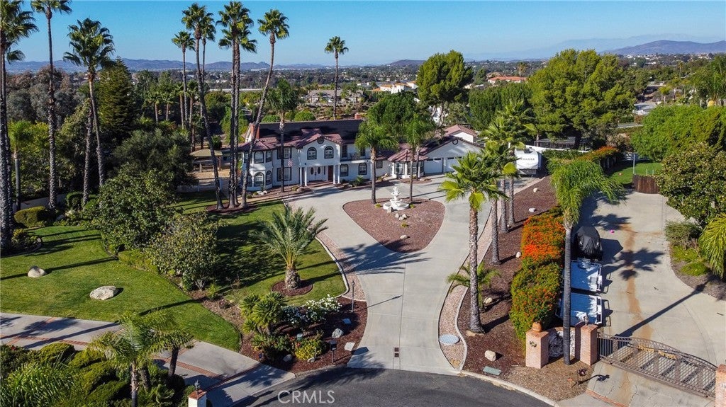 Welcome to Mariposa at Santiago Estates, Temecula’s premier enclave of luxury living. This entertainer’s dream home and horse property combines resort-style amenities with country charm—offering breathtaking views, modern upgrades, and 2.4 acres of usable equestrian land in a peaceful cul-de-sac setting. This expansive 4,533 sq. ft. estate features 5 bedrooms, 4.5 baths, and multiple living spaces designed for both comfort and grand entertaining. Inside, discover a light-filled floor plan with elegant renovations, including a professionally designed chef’s kitchen with new cabinetry, prep island, designer lighting, high-end appliances, and a statement range hood. The formal living and dining rooms set the tone for gatherings, while the spacious family room—with fireplace and built-in bar—opens to the backyard oasis. Upstairs, the primary retreat includes a sitting area, cozy fireplace, and a newly remodeled spa bath with dual sinks, quartz countertops, oversized soaking tub, and walk-in shower. The home also includes a private-entry Next-Gen suite—ideal for guests or multi-generational living—featuring its own living area plus a bonus flex room perfect for a gym, studio, or office. Step outdoors to your resort-style backyard: a relaxing haven with custom saltwater pool, outdoor kitchen and bar with built-in grill and seating, firepit lounge, and open space for entertaining. Enjoy panoramic sunset views, privacy, and annual fireworks from the comfort of home. The grounds include mature fruit trees (orange, lemon, lime, fig, avocado, olive, pomegranate, grapevine) and raised garden beds for farm-to-table living. A detached pool room/office offers a flexible workspace or guest area. Equestrians will love the barn and riding arena on the lower property, perfect for training and care. Additional highlights include new LVP flooring, HVAC, insulation, 400-amp service, new roof (2022), 48 solar panels, and solar-heated pool. The 3-car garage provides abundant storage, and the extended driveway accommodates RVs or recreational vehicles. Located near Old Town Temecula, Wine Country, Pechanga Resort, shopping, and fine dining, this estate delivers the ideal blend of sophistication, space, and lifestyle.