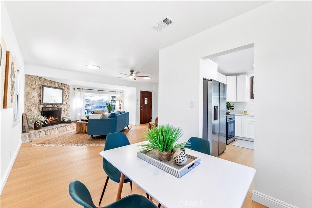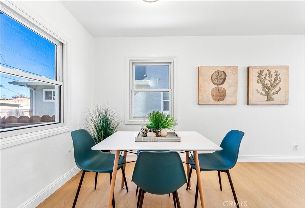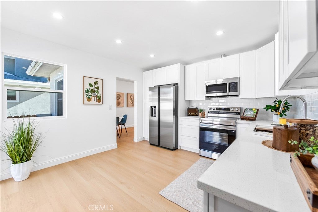 Tucked into one of Redondo Beach’s most charming and sought-after neighborhoods, this thoughtfully remodeled home borders the lush greenery of Franklin Park, a beloved community green space just steps from your door. Mature trees rise above the backyard fence, creating a peaceful, park-side setting where the air feels fresh and the surroundings feel special. Franklin Park offers open grassy areas, picnic spots, walking paths, and shaded seating, making it a favorite gathering place for the neighborhood. Step inside to discover a home that flows with intention and light. The living room is bright and inviting, anchored by an original floor-to-ceiling stone fireplace with a raised hearth and framed by a beautiful bay window. New flooring and recessed lighting enhance both warmth and modern comfort. The dining nook is wrapped in windows and designed for effortless everyday living, connecting naturally to both the living room and the backyard. At the heart of the home, the sleek white kitchen balances beauty and function with brand-new cabinetry, stainless appliances, a classic subway tile backsplash, recessed lighting, and gorgeous wood-look flooring. A walk-in pantry and integrated stackable washer and dryer add exceptional convenience, while a sliding door opens directly to the backyard and serene park-tree views. The bedroom retreat offers two closets, direct access to the backyard, and a beautifully finished bathroom just beyond. A high-set horizontal window frames leafy park views while maintaining complete privacy, creating a calm and restorative atmosphere. The second bathroom sparkles with a bright white tub and full-length shelf, a clean white vanity, oval mirror, and polished stainless details. Set apart from the home, the detached two-car garage retains its original character with pegboard walls, built-in storage, open wood rafters, and a functional workshop feel ideal for hobbies or projects. Just a few miles from Redondo Beach’s sandy shores and vibrant Pier area, this location offers easy access to beach walks, dining, and coastal amenities. The home is located within the Redondo Beach Unified School District, known for strong academics and community reputation. With its thoughtful updates, intelligent flow, and extraordinary park-side setting, this home offers a rare blend of charm, privacy, and everyday ease. Combining quality upgrades, an ideal location, and a true neighborhood feel, this home is ready for effortless coastal living.