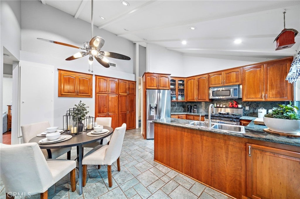 - Interior FeaturesBeamed Ceilings, Breakfast Bar, Built-in Features, Ceiling Fan(s), Cathedral Ceiling(s), Separate/Formal Dining Room, Eat-in Kitchen, Granite Counters, High Ceilings, Pantry, Recessed Lighting, Storage, All Bedrooms Down, Bedroom on Main Level, Main Level Primary, Primary Suite