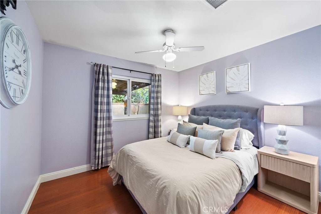 Paid off solar! - Welcome to this stunning single-story home nestled on a peaceful cul-de-sac in the highly sought-after Green Valley community. From the moment you arrive, you’ll be impressed by the beautiful curb appeal, featuring an oversized curved driveway for 3 cars, designer exterior paint, and a charming covered front porch. Inside, this thoughtfully designed home offers 4 spacious bedrooms and 2 upgraded bathrooms. The living room features vaulted, beamed ceilings and an abundance of natural light streaming through a large sliding door, creating a bright and inviting atmosphere. Elegant designer tile flooring flows through the main living areas, complemented by bamboo laminate floors in the bedrooms, recessed lighting, and a cozy brick fireplace as the perfect focal point. The chef’s kitchen is a true highlight, showcasing solid cherry cabinetry, granite countertops, a 6-burner gas range, and a breakfast bar that opens to a casual dining area—ideal for both entertaining and everyday living. The primary suite offers a peaceful retreat with a ceiling fan, abundant natural light, and a beautifully updated ensuite bath featuring a floor to ceiling tiled walk-in shower. Three additional bedrooms are generously sized, with ceiling fans, mirrored wardrobes, one with a French door entry. The remodeled guest bath includes a stylish pedestal sink and a tub/shower combo. Step outside to your private backyard oasis, complete with two covered patios, paver pathways, a lush grassy area, a storage shed, a fenced garden, and gated RV parking from Los Jardines E. Residents of Green Valley enjoy low HOA dues and access to three community pools, clubhouses, playgrounds, and more. Conveniently located near Mile Square Park, shopping, dining, entertainment, and major freeways, this home offers the perfect blend of comfort, style, and convenience.