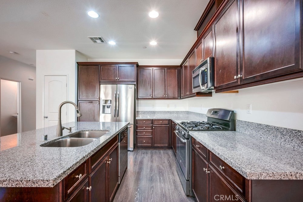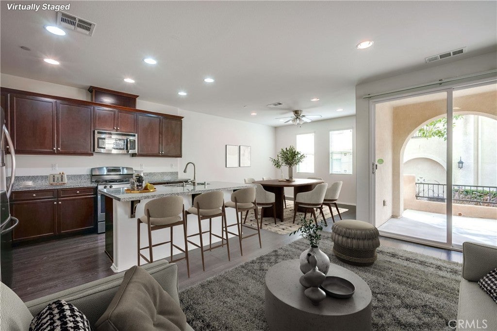 Welcome to 12531 Elevage Dr #58 located in the charming Elevage gated community in Rancho Cucamonga. Beautiful and meticulously well maintained home featuring modern day living at its best offering 1,726 living space, 3 spacious bedrooms, 2.5 baths, loft on the 2nd level, nice open floor plan with a quaint patio off the main entrance and lanai off the primary bedroom on the 2nd level, seamless natural sunlight exposure, tankless water-heater and two-car attached garage with direct access. Modern appeal with granite kitchen countertops, stainless steel appliances including refrigerator and Samsung front loading washer/dryer units, dark finish kitchen cabinets, recessed lighting and distressed wood plank flooring throughout. The home is perfectly situated as an end unit facing West. Conveniently located with close proximity to Victoria Gardens, schools, shopping and several restaurants. Schedule your private viewing today!