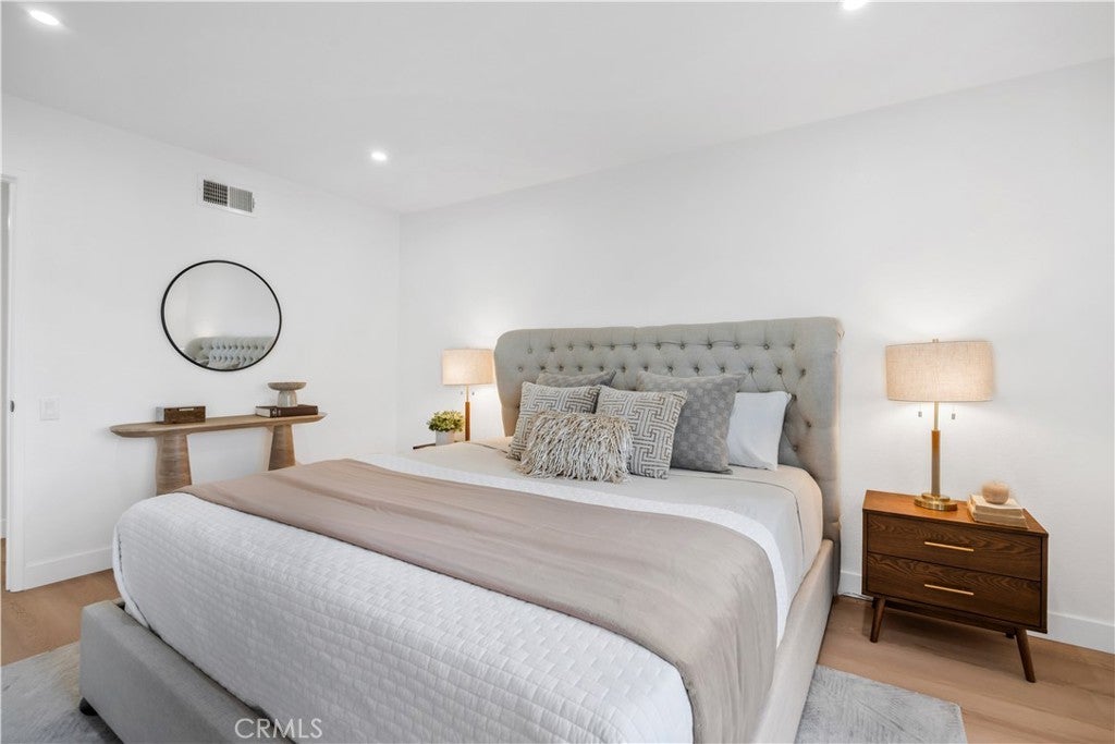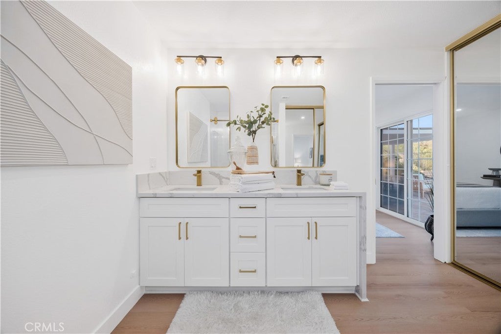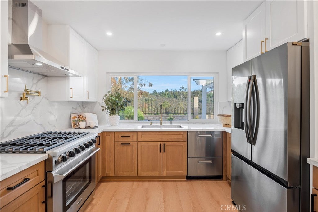 This beautifully renovated single story home sits on a quiet cul de sac in Mission Viejo and perfectly blends modern upgrades with style and functionality. Every detail has been thoughtfully designed, from energy efficient systems to designer finishes, making it a truly move in ready residence. Inside, high end waterproof hybrid laminate flooring flows seamlessly throughout, accented by modern baseboards, fresh paint, updated outlets, switches, hardware, and energy efficient LED recessed lighting. The fully remodeled gourmet kitchen showcases custom white and oak Shaker cabinetry with soft close drawers, quartz countertops with a full height backsplash and waterfall edges, ceiling height cabinets, touchless sink with pot filler, and professional grade appliances including a 36" 6 burner Thor gas range, Thor drawer microwave, Thor wine fridge, GE Profile double drawer dishwasher, Samsung refrigerator, and sleek range hood. An elegant farmhouse chandelier and updated fireplace bring warmth to the family room, while new hallway cabinetry and a high capacity washer dryer with overhead storage add convenience. The primary suite offers a spa like retreat with a walk in shower featuring oversized shampoo niches, double vanities with quartz counters, soft close cabinetry, and upgraded fixtures. All bathrooms have been fully remodeled with modern cabinets, countertops, faucets, mirrors, and low flow toilets. Each bedroom has new flooring, baseboards, paint, and lighting for a fresh, modern feel. Additional smart home features include a Nest thermostat, Ring camera doorbell, and a full PEX repipe for added peace of mind. The private backyard is fully enclosed, perfect for pets and children, and offers serene mountain views with no neighbors behind. A stylish maintenance free privacy fence with lush greenery enhances the outdoor living space. The finished two car garage has been freshly drywalled, painted, and upgraded with epoxy flooring. Residents also enjoy exclusive access to Lake Mission Viejo, featuring sandy beaches, swimming, boating, fishing, a clubhouse, and year round events. With no Mello Roos, a low HOA, and a prime location, this turnkey single story is a rare opportunity in one of Mission Viejo’s most sought after neighborhoods.