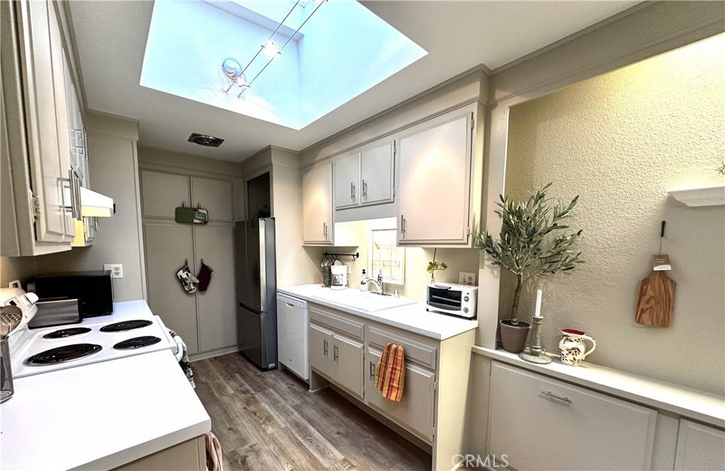 Avail Jan1 - Located in the prestigious LW Gated community with 24 hour security this popular 1BR Coronado floorplan is the upper one which has no steps and no one above. It has modern upgrades such as new kitchen skylight, low maintenance vinyl planking flooring both rooms, dual pane windows and slider, smooth ceilings and designer paint colors. The sun filled kitchen is thoughtfully designed with raised counters for both style and practicality. Bathroom with convenient walkin shower and new vanity. HVAC high efficiency offers year round heating and cooling comfort. AC/Heat in bedroom too. Key takeaways are no one living above you, a very large balcony offering greenbelt views with a great breeze and natural air and light flow. This home also provides the convenience of no-step access to the carport, and laundry facilities, ensuring easy mobility.Carport just steps away to front door. Added bonus to this location is that it is within walking distance to Clubhouse 4 ARTS Center and pool .Cremaics, sculpture, Located within a vibrant 55+ community, this remodeled residence combines comfort and modern living. This is an amazing home in one of Laguna Wood's premium areas! Laguna Woods Village residents enjoy a 27-hole championship Golf course, a 9-hole executive par 3 course, Pickleball and Tennis courts, Gyms, Clubhouses with 200 clubs such as the Comedy Club and Performance Arts Theater. Horse stables and Saddleback Emeritus College Art programs with world class Art facilities is same Gate 5. Take advantage of this opportunity to enjoy an exiting lifestyle with all the amenities and services that Laguna Woods has to offer.