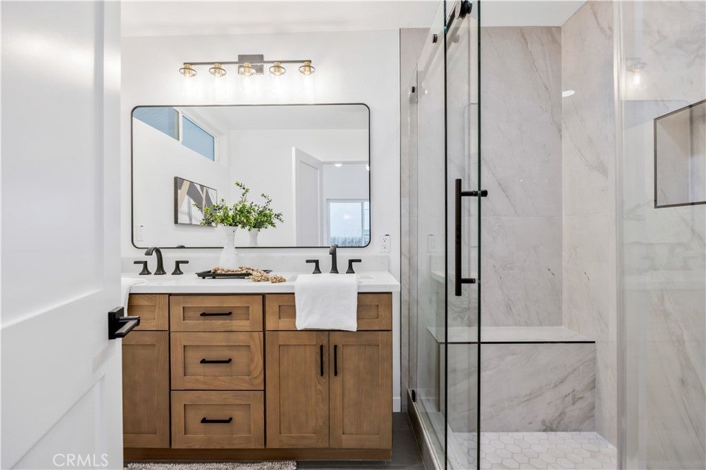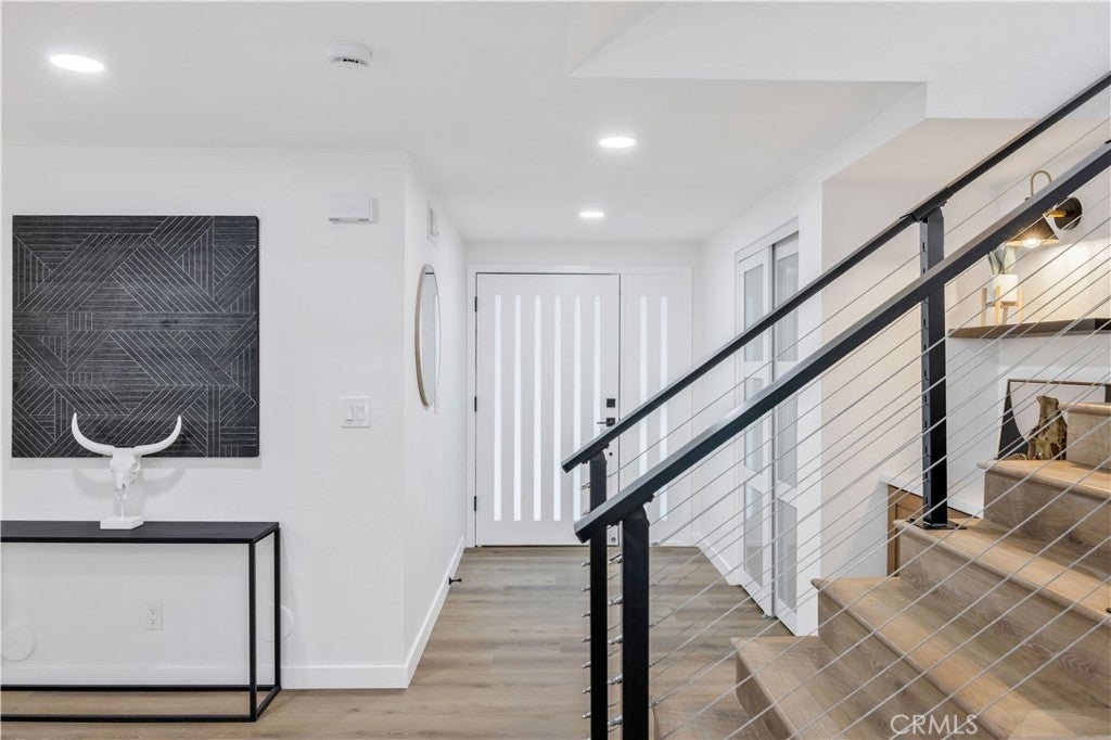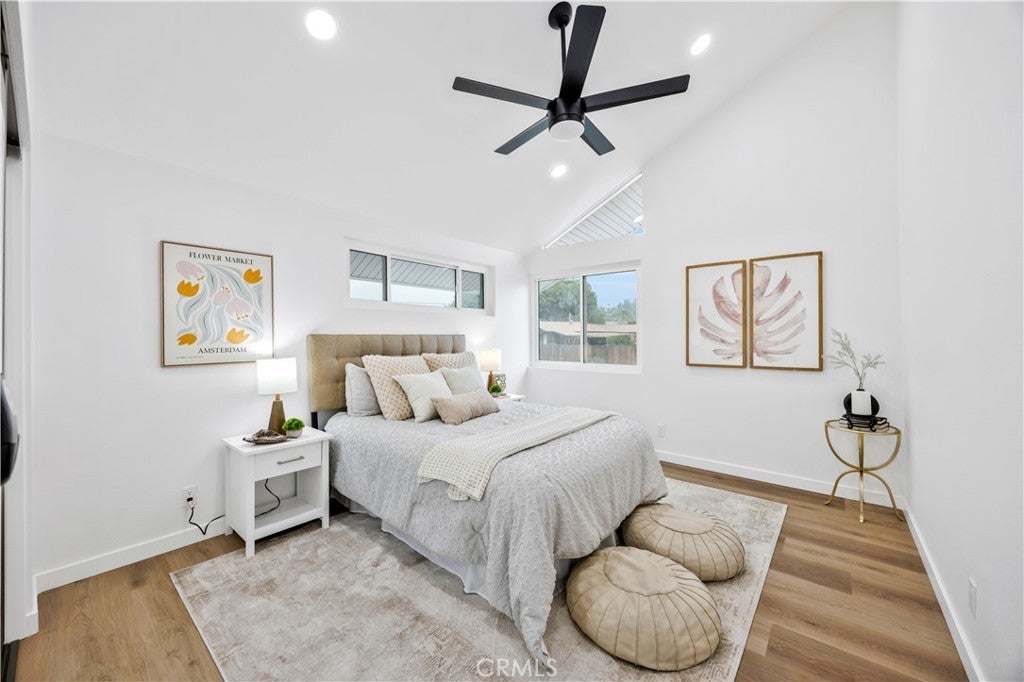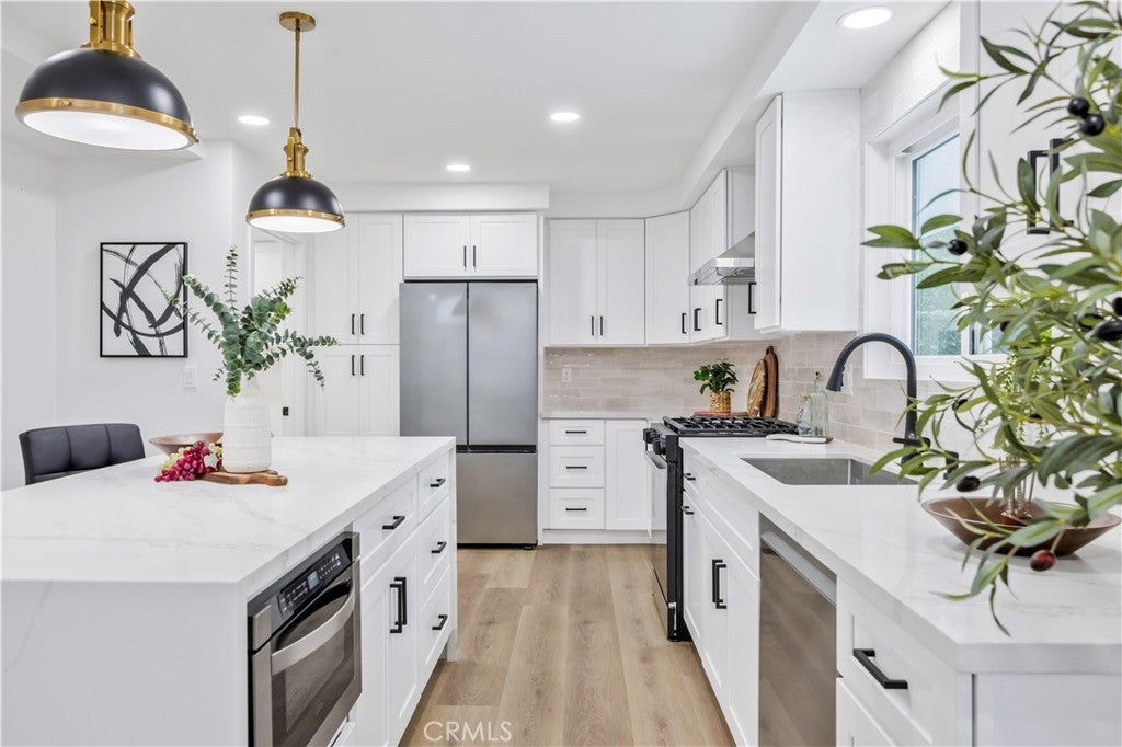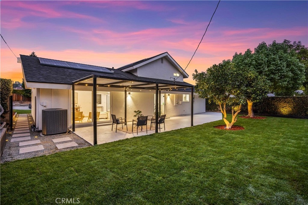 Step into a beautifully redesigned modern home where clean lines, natural light, and thoughtful craftsmanship come together seamlessly. The first-floor primary suite—with dual closets and a spa-inspired en-suite bath—adds comfort, accessibility, and everyday luxury, making the layout ideal for all ages. This fully remodeled residence features paid-off solar, an open floor plan, high ceilings, and a spacious kitchen anchored by a striking waterfall island and sleek grey-and-gold accents. New flooring, upgraded fixtures, and contemporary finishes continue throughout, leading to an inviting upstairs living area and additional bedrooms. Outside, the backyard offers a calm and relaxing setting with new lush sod, modern landscaping, ambient lighting, and mature fruit trees. A stylish pergola adds the perfect touch for outdoor dining, gatherings, or quiet evenings at home. With updated sprinkler system, beautiful curb appeal, and a layout designed for comfort and everyday living, this move-in-ready home brings together modern design and effortless livability.