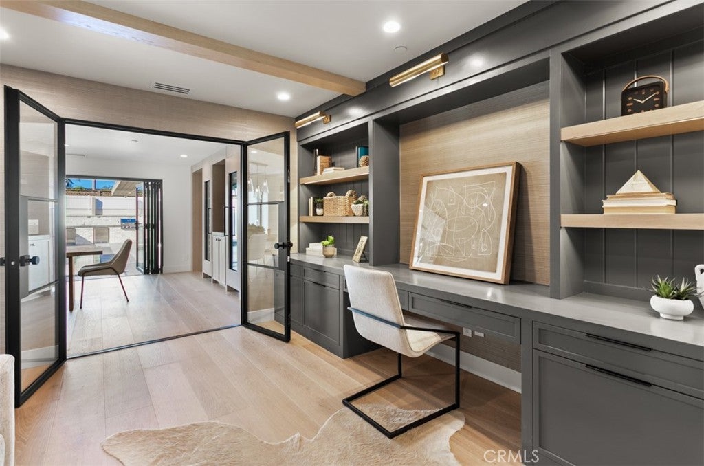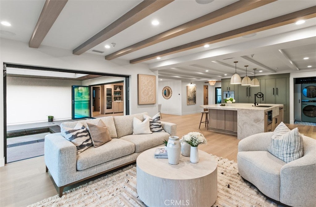 A work of modern art, 1717 Irvine Avenue emerges as a contemporary haven where architecture, nature, and luxury coexist in perfect harmony. Newly reconstructed with uncompromising craftsmanship and a bold artistic sensibility, this residence transcends traditional living. A monumental 10-foot glass pivot door introduces the home with a dramatic reveal: indoor and outdoor spaces collapse into one fluid environment shaped by elemental beauty. A waterfall wall, lush living plant installations, and a mature olive tree bring nature into the core of the home, creating an ethereal threshold that feels both tranquil and unforgettable. Inside, a sweeping open floor plan grounds the home’s modern aesthetic. The living room, wrapped in disappearing glass walls, blurs the boundaries between inside and out and flows seamlessly into the gourmet kitchen. Here, custom cabinetry, a hidden walk-in pantry, striking stone surfaces, and top-tier Thermador appliances elevate the space into a functional work of art, anchored by an oversized waterfall quartzite island. The formal dining room glows beneath a statement chandelier and is framed by dual Thermador 92-bottle wine towers—an exquisite stage for intimate dinners or grand celebrations. The entertainer’s backyard extends the modern narrative with a saltwater pool and spa illuminated by micro-LED lighting, a fully realized outdoor kitchen and BBQ, and generous lounge areas. Whether in sunlight or beneath the glow of the evening lights, the outdoor environment evokes the serenity of a private resort. The primary suite serves as a luxurious retreat—beautifully composed with a sculptural soaking tub, glass-enclosed shower, dual vanities, and a custom walk-in closet. Three additional guest bedrooms feature bespoke closets and share a spa-level bath, while one of the guest bedrooms with custom built-ins can serve as an office, which adds elegant utility to the home’s thoughtful layout. Even the garage becomes part of the design narrative, finished at showroom quality with hexagon lighting, custom cabinetry, and designer flooring. Enhanced by premium technology throughout—including Waterstone fixtures, Lutron lighting control, dual-zone HVAC, central audio, and whole-home Wi-Fi expansion—this residence is as intelligent as it is striking. Positioned near the edge of Newport Beach’s treasured Back Bay, 1717 Irvine Avenue is not merely a home but a modern compound of curated luxuries, bold design, and seamless indoor-outdoor living.