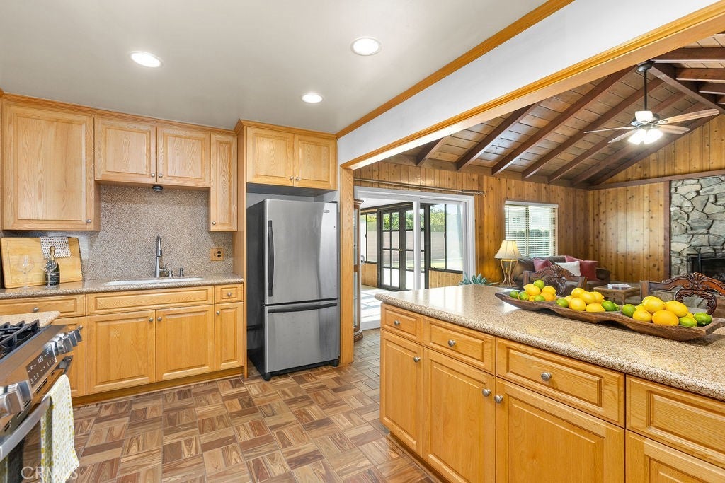 Owned and enjoyed by the same family since 1964, this 4 bedroom 2 bathroom home has been well loved and taken care of for over 61 years. The home is nestled in a quiet location at the rear of the tract and it sits on a larger-than-average lot. Plenty of space to add a pool in this expansive backyard. And plenty of living space inside this single story home (1484 square feet per the tax assessor) with lots of nice amenities too...starting with an updated kitchen with stainless appliances, granite counters, loads of cabinets AND a roomy pantry. There's a large kitchen dining bar that opens to the SPACIOUS great room with vaulted ceilings that showcase beautiful, exposed wood beams and a gas fireplace that is framed by an expansive rock hearth and surround. And this home also has a separate formal living room and a separate enclosed back patio located just off of the great room. Lots of areas to spread out and relax and entertain here. One of the 4 bedrooms was converted into a den, and it is located conveniently off the living room. Double entry doors were added to this room and the closet space is now one of two book shelves. It is the perfect space for a home office, library or a playroom...OR...you might think about converting this room once more to make it part of a massive primary bedroom suite...there are great possibilities for utilizing this space. The primary bedroom has an ensuite half bath. Two additional bedrooms are located down the hall, one of which has both a single hall entry door and double french doors that open to the enclosed back patio. There have been other updates over the years as well: The main hall bathroom was redone and boasts a stylish oversized shower with custom tile work and granite counters. Most of the original windows were replaced with dual pane and the roof was replaced in 2020. The water heater was replaced in 2018. Exterior stucco was painted in 2020. Brick capped hardscaping was added throughout the front yard of the home and there are both front and back lawns for people and pets to play...PLUS a beautiful orchid tree that blooms out in front. This home is ready for a new owner to come build a legacy and make it their own. **Centrally located in the Newport-Mesa School District and just moments from major freeways, South Coast Plaza, The CAMP and other nearby shopping, dining, and entertainment.
