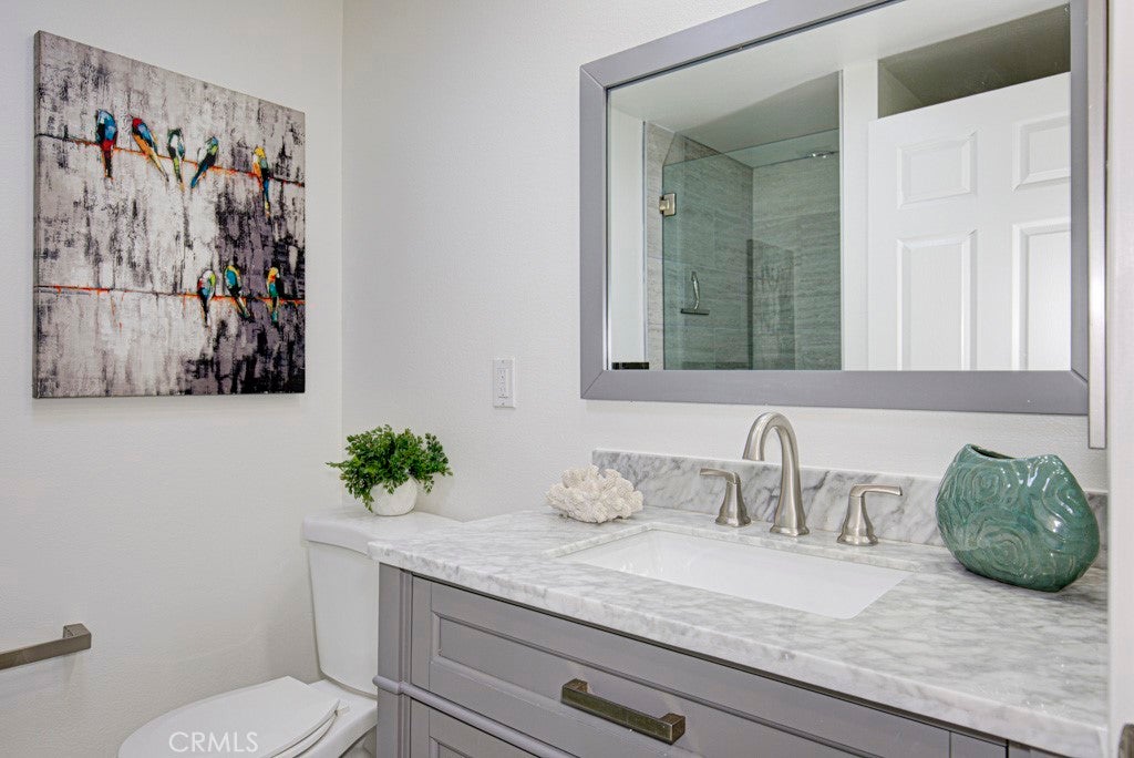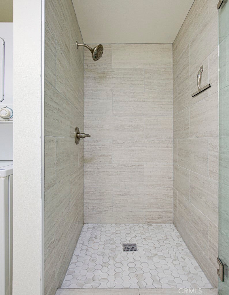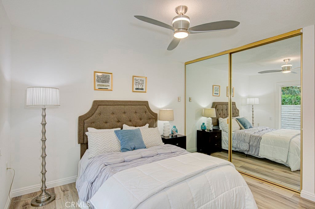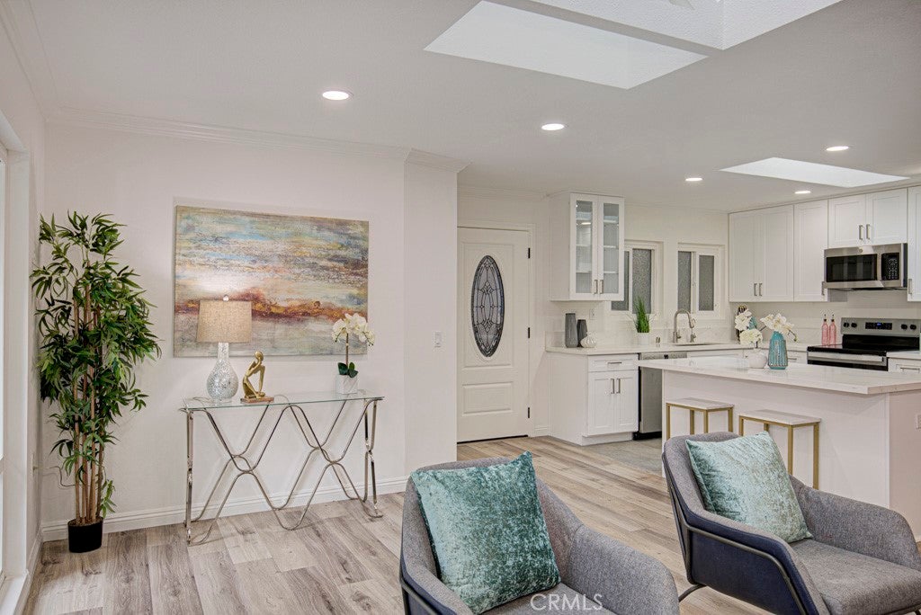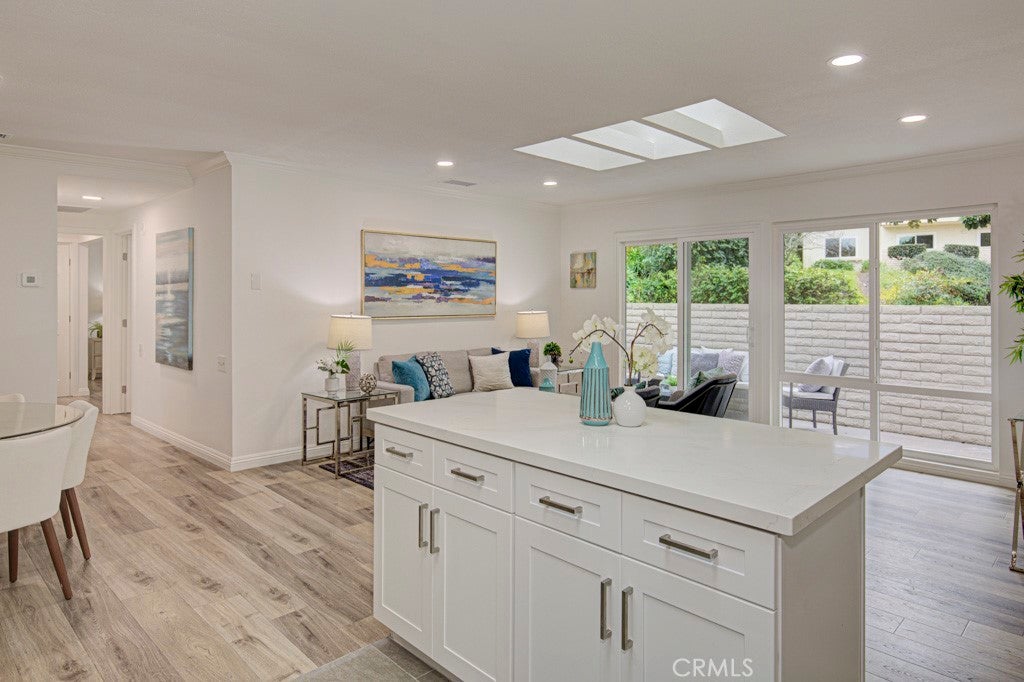 Delightful Casa Vista Condo with no-one above or below. This beautifully remodeled with 2 bedrooms, 2 baths, looks out on a serene greenbelt area. Amazing open concept as you enter the manor, notice the dual pane windows and sliders looking out on the oversize patio. Essential kitchen with impressive quartz countertops with an island, larger refrigerator, microwave, new range and LED recessed lighting. There is a stacked Washer & Dryer strategically located in the guest bathroom. Master bedroom boasts a large walk-in closet with organizers built in, and large walk-in shower. Guest bedroom has mirrored wardrobe doors. Tiled flooring in kitchen & bath. Interior features an added built-in multi-use closet for additional storage, attractive vinyl flooring, 2 skylights in kitchen & living room, smooth ceilings, the AC was installed last year... Enjoy all the amenities of this active 55+ community with 7 clubs houses, 27 hole golf course, par 3 golf course, restaurant, stables, tennis, lawn bowling, 5 swimming pools, over 200 clubs and a free external bus system. All of this while located close to freeways, shopping, medical facilities and about 7 miles to the beach!