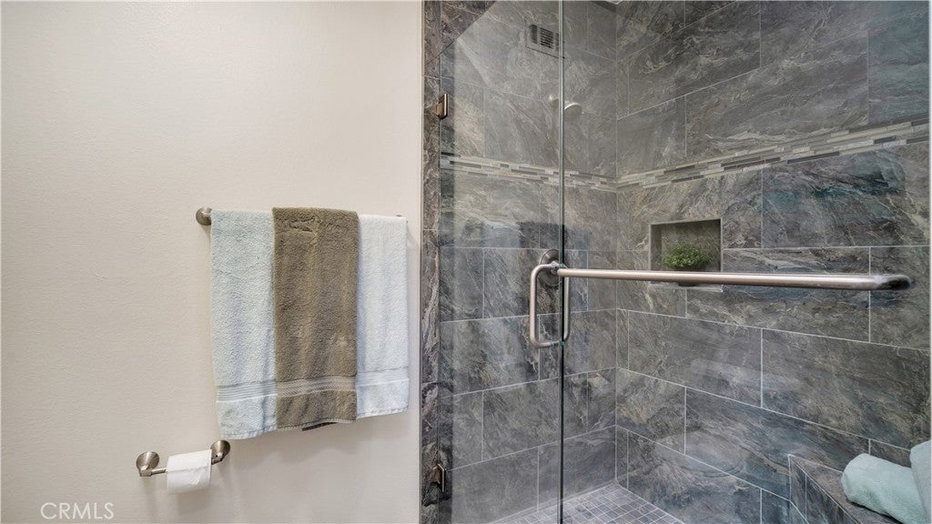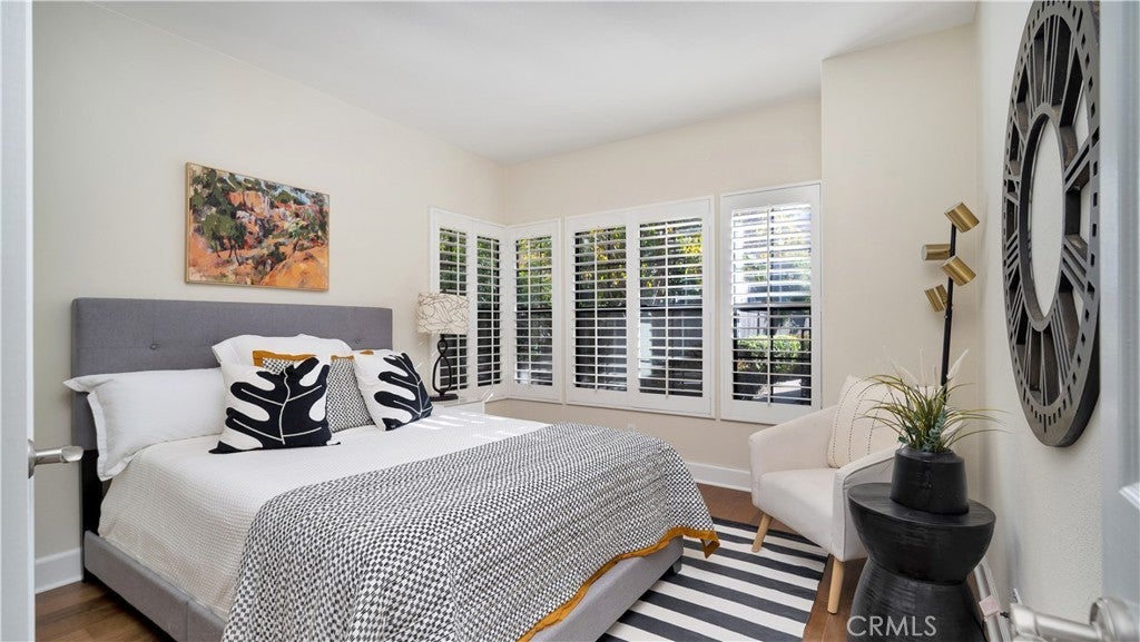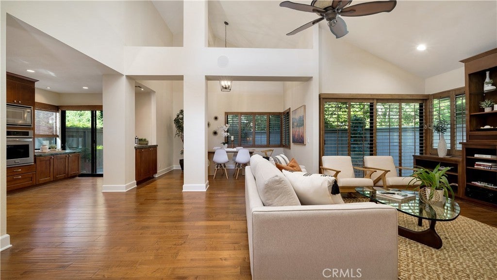 Price improvement! A rare jewel single-story home is one of the most beautiful on the market this year! Freshly painted inside and out, it boasts an airy, modern feel thanks to opened walls and high ceilings. Warm and inviting Boho style with natural cherry hardwood throughout. The home is surrounded by a private wrap-around garden and patio-an unusually large side yard. The interior was remodeled in 2013 by an exceptional finish carpenter with great attention to detail and smooth plaster walls and ceilings. Dramatic high ceilings, square corners, modern baseboards, and dramatic columns give the Ashford design its timeless contemporary look. Wide-plank cherry hardwood floors run throughout with slate tile in the entryway/foyer and baths. The spacious kitchen dazzles with emerald quartz counters, custom details, along with premium appliances - a Samsung French door fridge, Whirlpool dishwasher, Frigidaire dual wall ovens, and a 5-burner Gas cooktop. The slate wood burning/gas log fireplace is enhanced with built-in cherry wood shelves and bookcases. A TV outlet is installed over the fireplace. The "Great Room" enjoys garden views, wide windows with custom shutters. 2 sets of Milgard dual pane sliding doors open onto the very private patio. Both bathrooms have been remodeled with stone and quartz including an over-sized walk-in shower in the primary suite. Custom lighting has been added throughout. The garage has been finished with an epoxy floor, finished walls, storage cabinets, a sectional roll-up door, and a custom attic with pull down ladder. Located in the picturesque Pinewood neighborhood—famous for its winding road, magnificent trees, park and pool. It’s an easy and wonderful place to make friends and truly feel at home without leaving your neighborhood. Every home has just been painted and termite clearance will be provided. The Woodbridge Village Association has recreation amenities that are unmatched in their breadth and scope when compared to similar private Homeowner Associations. The amenities include 2 landmark lakes with docks, 2 beach lagoons, 22 pools, 16 spas, 13 waders, 24 tennis courts, a splash pad, numerous parks with play equipment, volleyball courts, a big wheel park, horseshoe facilities, a fitness course, and much, much more. All told, the Association owns and operates 41 recreational facilities. The Irvine unified School District is one of the best in the Nation. Woodbridge is a wonderful place to call Home!