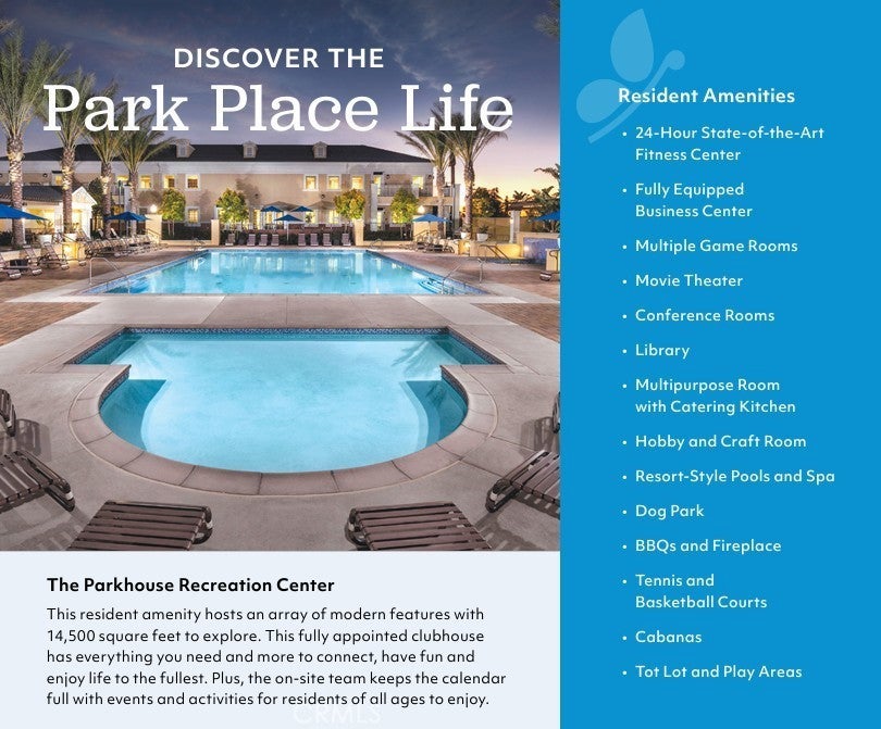 • AmenitiesCall for Rules, Clubhouse, Sport Court, Dog Park, Fitness Center, Meeting Room, Management, Meeting/Banquet/Party Room, Outdoor Cooking Area, Barbecue, Picnic Area, Playground, Pickleball, Pool, Recreation Room, Spa/Hot Tub, Tennis Court(s)