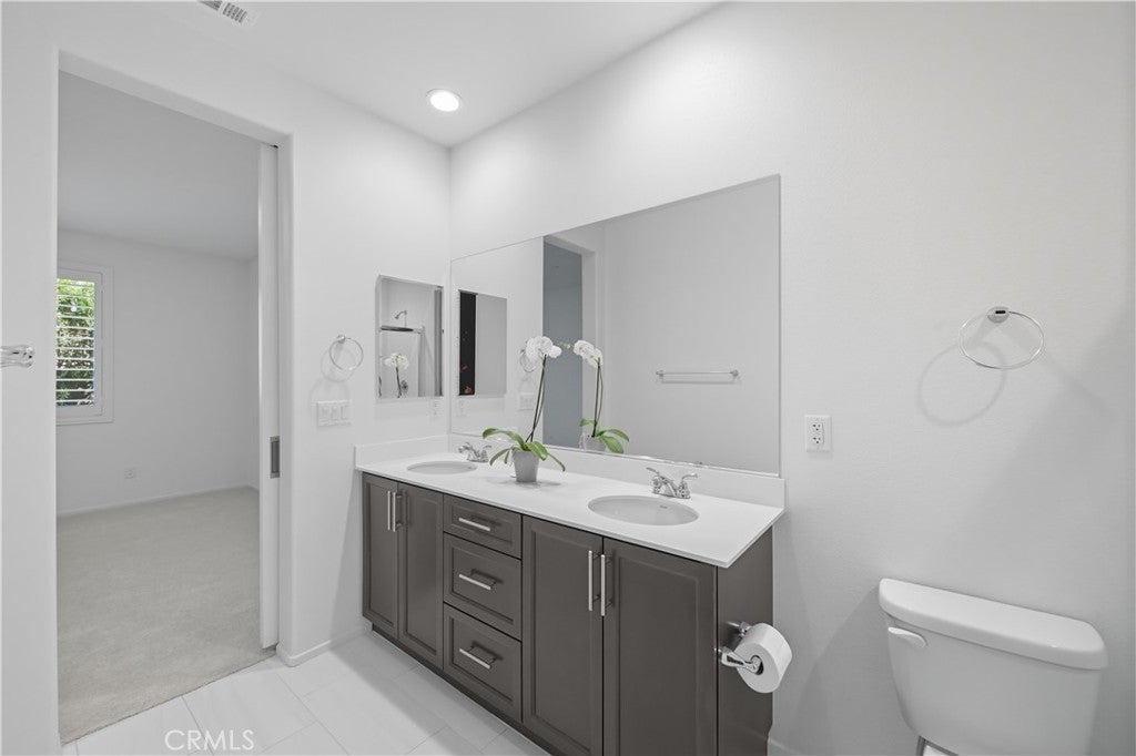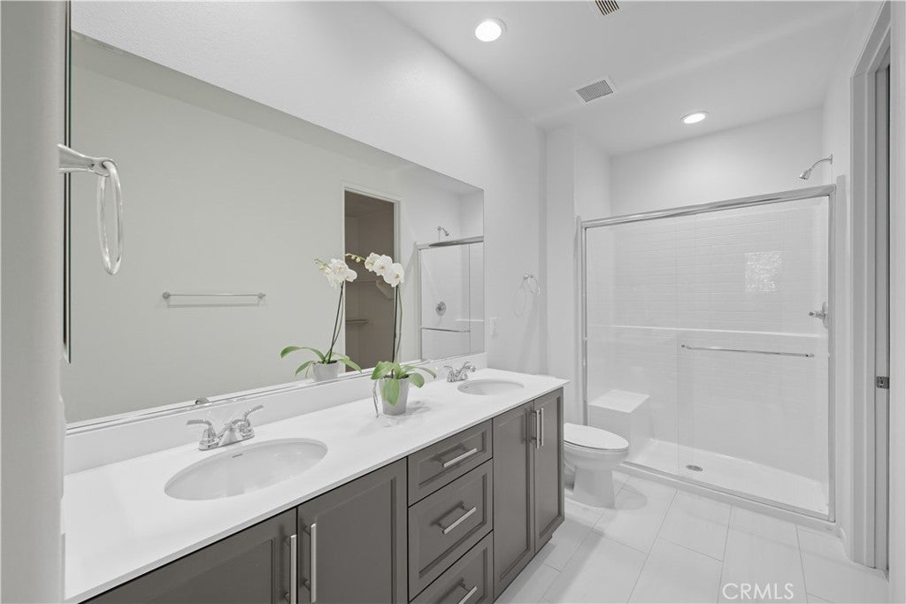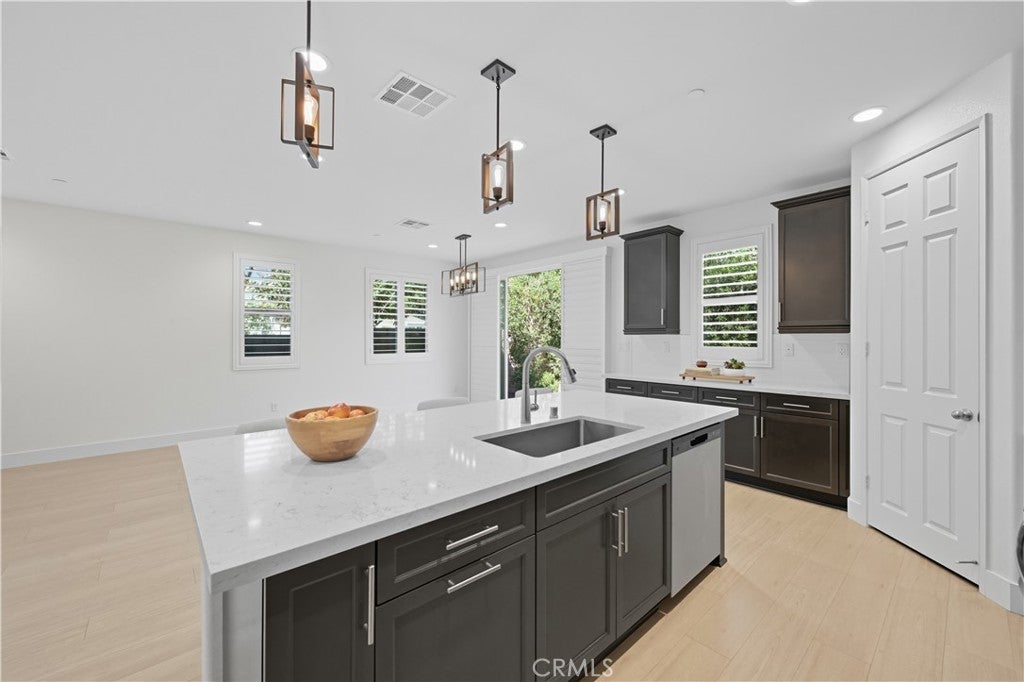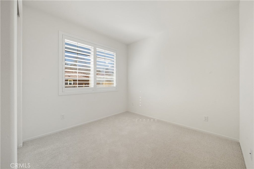 Situated at the end of a quiet street with no rear neighbors, this single-story Skyview home offers exceptional privacy, peaceful surroundings, and a calm sense of separation from the everyday bustle. Fresh interior paint, new bedroom carpet, and plantation shutters throughout create a bright, refined, and inviting atmosphere. The heart of the home is the open-concept living area, where the kitchen, dining space, and great room blend seamlessly. A spacious quartz island, warm cabinetry, recessed lighting, and a gas range make the kitchen both beautiful and functional, perfect for daily routines, relaxed weekends, and hosting friends with ease. The primary suite provides a welcome retreat with a walk-in closet and a generous ensuite featuring a large step-in shower. Two additional bedrooms offer versatility for guests, remote work, hobbies, or a fitness space. The backyard enhances the experience even further. Set on one of the largest lots in the Skyview neighborhood, the outdoor space feels open, private, and thoughtfully low-maintenance. A paver patio creates a wonderful setting for dining or entertaining, while the artificial turf keeps the yard looking fresh year-round. Mature Indian Laurels frame the back of the property, adding greenery, shade, and a tranquil sense of enclosure. Energy-efficient upgrades, including paid solar and a tankless water heater, help keep monthly costs low and comfort high. Beyond the home itself, Terramor offers a vibrant lifestyle with resort-style amenities, scenic trails, neighborhood dog parks, toddler play areas, and community gatherings that bring residents together. Located just minutes from shopping, dining, and the 15 Freeway, 11702 Glenridge Drive offers a blend of ease, comfort, and convenience that makes everyday living feel effortless.