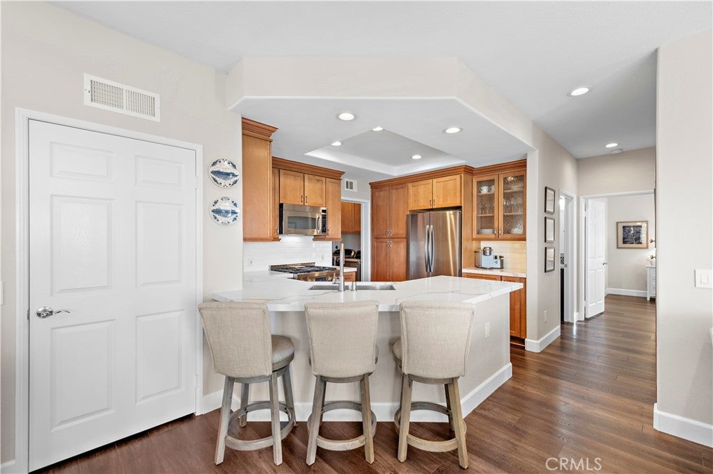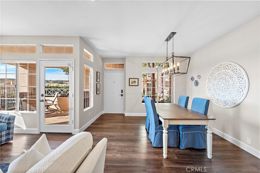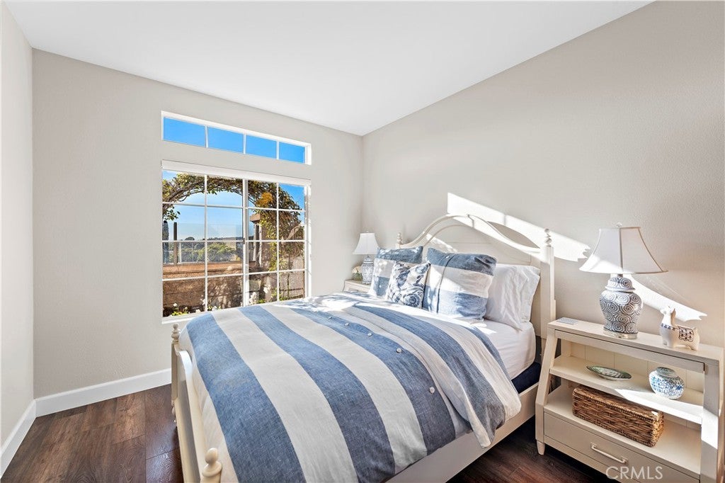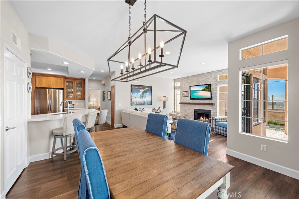 This unit is one of the best locations within the complex with ocean, hills and Catalina views. This private end unit single story home features custom luxury, an abundance of natural light and an open living concept with a wrap around yard. Remodeled in 2018 this home adorns a custom kitchen, bathrooms, fireplace, hardwood-style flooring, custom built-ins and modern appliances. You will love the spacious primary suite with dual vanities, a privacy closet, a walk-in shower and a walk-in closet. The second bathroom features dual vanities as well, perfect for your guests. No steps inside the unit or to the unit from the parking lot. Just 2 steps up from the garage to the laundry room off the kitchen. This is the perfect home for those looking for privacy and open feel. Enjoy scenic hills, city lights, ocean and Catalina sunset views complemented by the wrap around yard that creates a coastal ambiance. This can be sold fully furnished, turn-key!