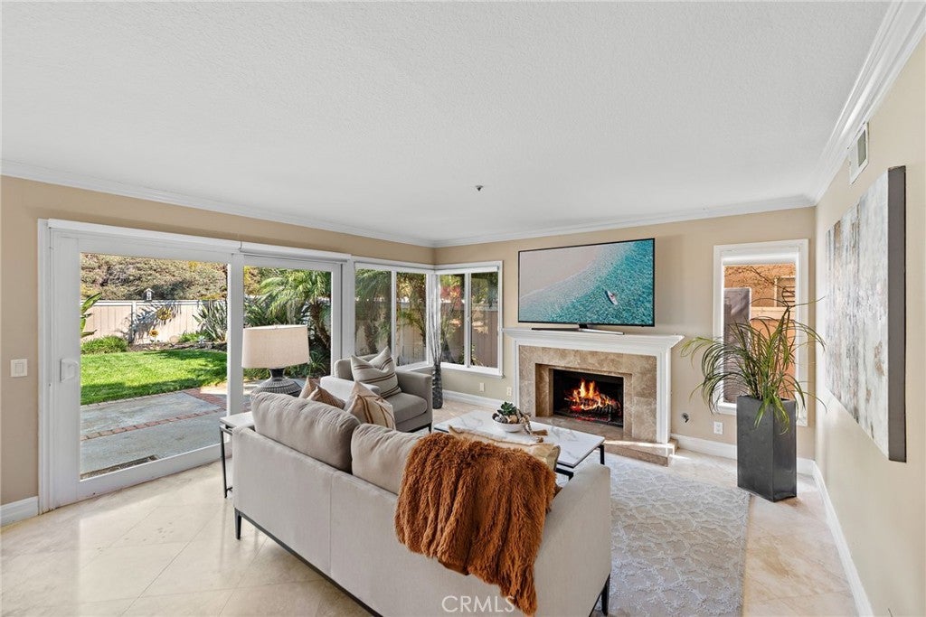 This single family home tucked at the end of one of Marblehead’s most desirable cul-de-sacs, 2170 Via Teca blends timeless craftsmanship with modern coastal elegance. Set on a quiet street-end location with generous off-street parking, this home enjoys an expansive backyard, lush landscaping, and peek-a-boo ocean views. Inside, four bedrooms and three baths showcase high-end finishes at every turn. Crown molding, detailed casings, and travertine floors create a refined backdrop, while a beautifully renovated kitchen serves as the heart of the home. Custom hardwood cabinetry, a built-in Sub-Zero style refrigerator, Fisher & Paykel double dishwasher, and handcrafted baked-clay sink are all illuminated by subtle under-cabinet lighting. Two marble-faced fireplaces with bespoke mantels bring warmth to the living spaces, and an upstairs loft adds flexibility with built-in linen cabinets, an entertainment center, and dual workstations. The primary suite is a true retreat with floor-to-ceiling hardwood built-ins and a spa-inspired bath featuring a Jacuzzi tub, custom tile, and designer fixtures. Thoughtful upgrades include a fully insulated two-car garage with loft storage, a spacious laundry room with custom cabinetry, and brand-new double-pane windows, furnace, and water heater. Outdoors, a multi-level patio runs the width of the home, perfect for dining under the stars or enjoying sunset cocktails. A charming entry fountain completes the welcoming curb appeal. With Marblehead’s parks and trails nearby, and world-class beaches, dining, and shopping just minutes away, 2170 Via Teca offers rare coastal luxury and effortless indoor-outdoor living in one of San Clemente’s most sought-after neighborhoods.