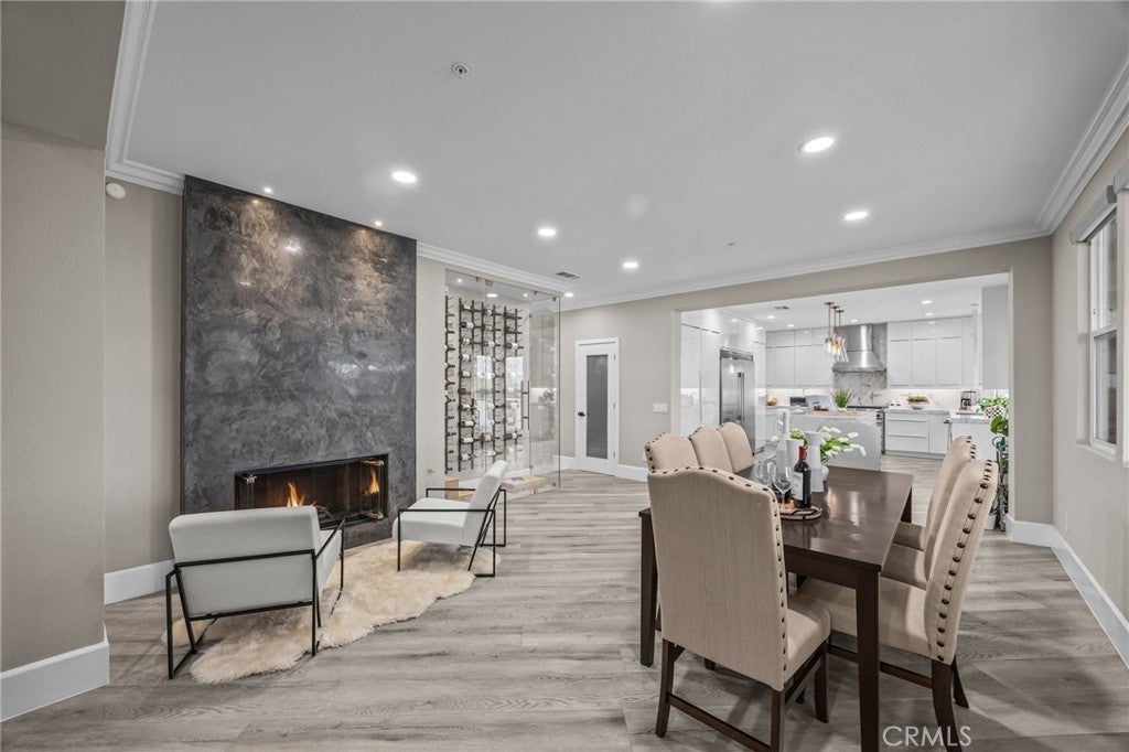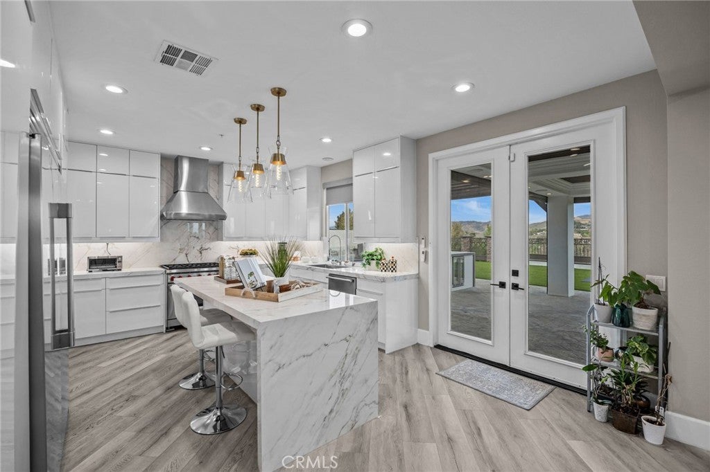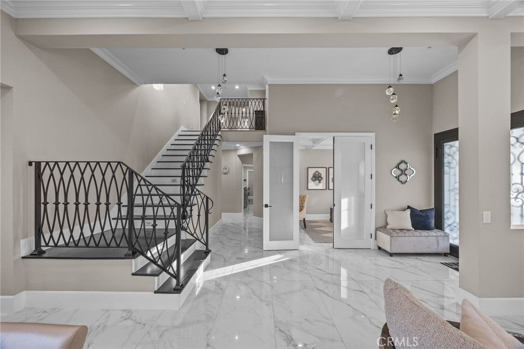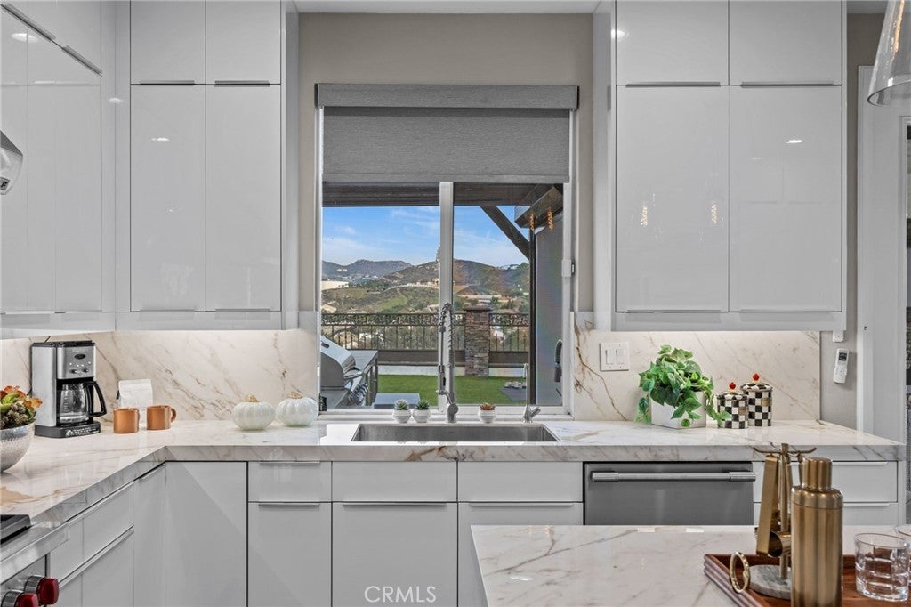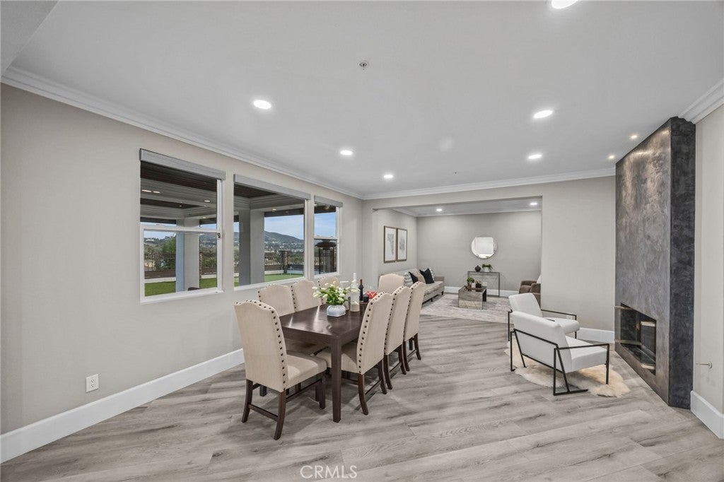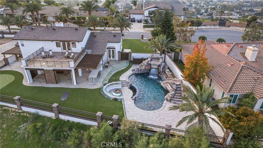 Nestled in the prestigious Norco Hills neighborhood on a upscale cul-de-sac, this home enjoys a stunning panoramic VIEW! The front walkway leading to impressive wrought-iron double entry doors, sets a bold and elegant first impression. As you step inside, the grand entry welcomes you with exquisite porcelain flooring, striking pendant chandeliers and a sleek staircase with designer wrought-iron railings that fill the space with modern sophistication. The living and dining areas feature a refined coffered ceiling with crisp architectural detailing and integrated recessed lighting. Along with a convenient main-floor BR/full bath, the home offers a dedicated office and enhanced safety features including fire sprinklers and upgraded multiple security cameras.The family room features a beautifully crafted fireplace and an impressive glass wine display perfect for entertainment. The designer kitchen showcases custom high-gloss cabinetry, sleek porcelain countertops, & a stunning island with custom pendent lights that serves as the centerpiece of the space. Top-of-the-line appliances—including a Wolf range stove and a commercial-grade refrigerator—complete this chef-inspired culinary environment. The luxurious master suite is a true retreat, opening to an expansive private balcony with breathtaking, unobstructed VIEWS—perfect for sunrise coffee or evening unwinding. The spa-inspired bathroom impresses with quartz countertops, a freestanding soaking tub framed by picture-perfect VIEWS, a walk-in shower, dual sinks with a makeup vanity, and two generous walk-in closets for exceptional storage and comfort. Step outside to a resort-caliber backyard anchored by a spectacular custom pool and spa, this outdoor oasis features a dramatic rock waterfall, and water slide, all surrounded by sleek glass fencing that preserves unobstructed views. The expansive California room provides year-round comfort with rich wood-inlaid ceilings, recessed lighting, a stunning stone fireplace with built-in TV, and surround-sound speakers that transform the space into an immersive open-air theater. Custom automatic exterior shutters fully enclose the space when desired, offering privacy, shade, and exceptional security. The luxury outdoor kitchen island includes a high-end grill, sink, refrigerator, wine cooler, ample storage, and generous counter space—perfect for hosting events of any size. A manicured putting green, multiple lounging areas, and a sunken fire pit complete the experience.