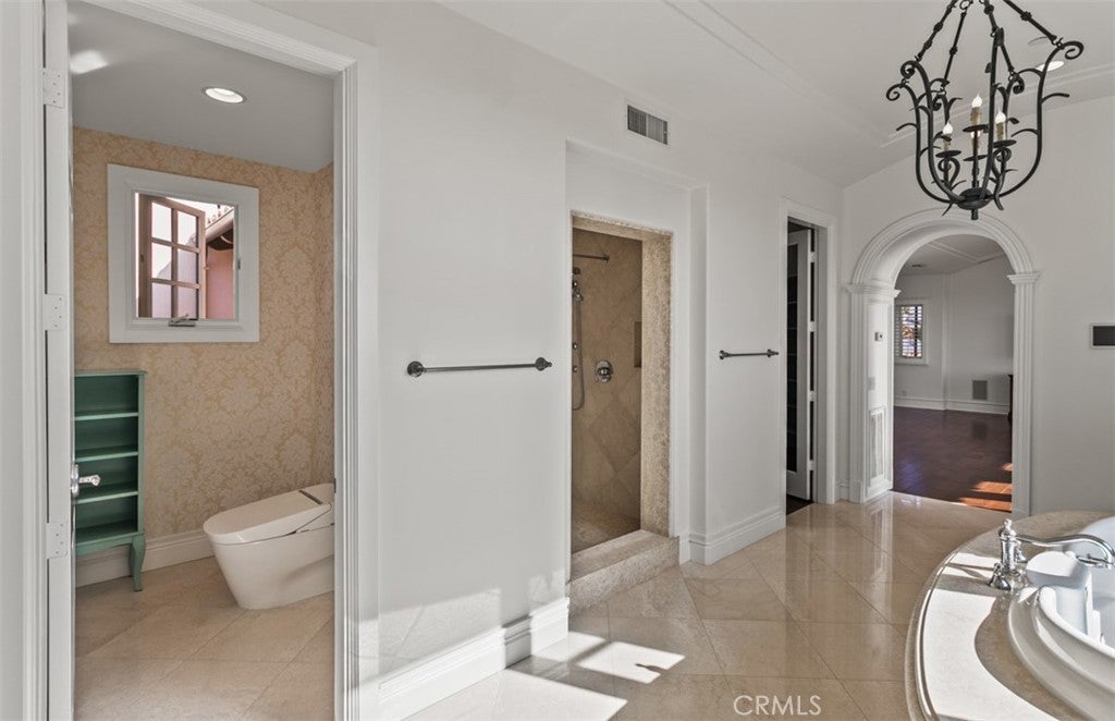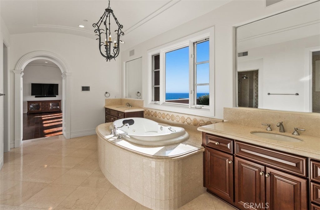 Perched above the Pacific in Newport Coast’s prestigious Crystal Cove, this Mediterranean-inspired estate offers sweeping views of Catalina Island, El Morro Cove, and Abalone Point. Set on an expansive 11,077 (+/-) sq ft lot, the home spans 5,082 (+/-) sq ft of refined living space designed to embrace coastal beauty at every turn. Beyond a private gated courtyard, the residence welcomes you with wood-beamed ceilings, distressed walnut floors, and European tile floors, blending timeless elegance with relaxed sophistication. The formal living room features a precast fireplace, custom crystal chandeliers, and opens to a heated, covered loggia—perfect for enjoying ocean sunsets year-round. The chef’s kitchen is fully equipped with top-tier appliances, granite countertops, two dishwashers, a prep island, and a separate catering kitchen. An open-concept layout connects seamlessly to the family room and breakfast nook, all framed by panoramic ocean views. The primary suite is a peaceful retreat with French doors opening to a stunning, private ocean view terrace and a spa-inspired bath featuring a jetted tub, large walk-in shower, and dual walk-in closets. The thoughtful floor plan includes a dual-desk upstairs office and four bedrooms, five bathrooms, inclusive of a separate guest casita with private entrance—ideal for visitors or multigenerational living. Enjoy a manicured lawn with plenty of room for relaxation and recreation, a 3-car garage with built-in storage, a built-in audio system, and ADT Security installed on all doors and windows. Living in Crystal Cove means more than enjoying an extraordinary home—it’s access to a world-class lifestyle. Residents enjoy a heightened level of privacy, prestige, and 24-hour guard-gated security along with exclusive amenities at The Canyon Club, including a resort-style pool, spa, fitness center, and sport courts. Private beach access, miles of scenic trails, and proximity to Laguna Beach, Newport Beach, and upscale shopping and dining at Fashion Island make this one of the most desirable communities on the California coast.