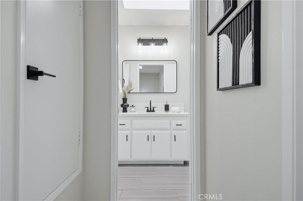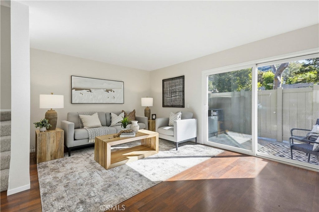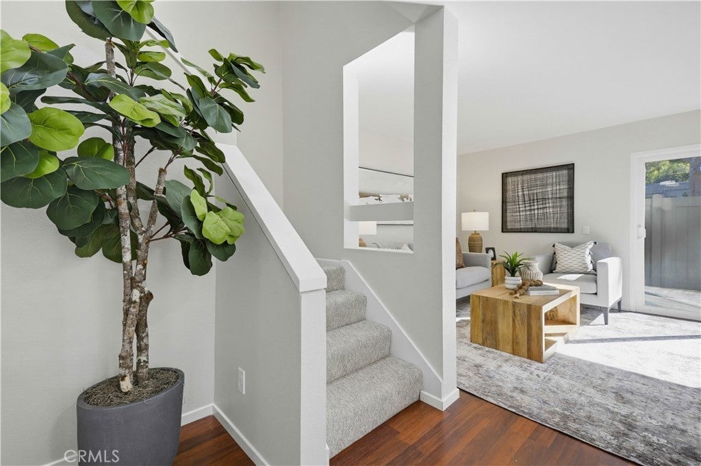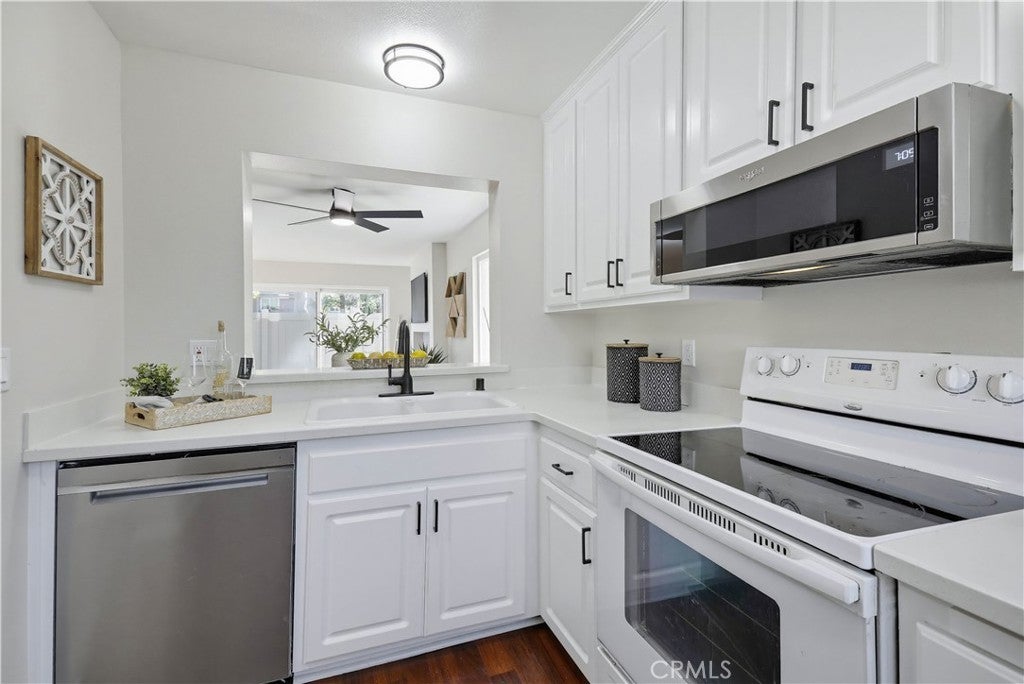 Beautifully updated end unit ideally located in the desirable Villeurbanne community nestled amongst picturesque rolling hills in sought-after Orange Park Acres area. Blessed with a prime end unit location facing a peaceful manicured greenbelt with stately trees creating a welcoming first impression. Step inside and soak in the light filled, freshly painted interior, with gorgeous rich wood laminate floors throughout the open concept main level, high scraped ceilings, skylights, updated lighting, updated ceiling fan, updated kitchen and baths, and new carpet, all providing a superb living environment. The light and bright living room with a cozy fireplace is open to the dining area creating the perfect gathering space with sliders opening the private patio, an ideal indoor-outdoor living space for relaxing and entertaining friends and family. The sparkling kitchen boasts Quartz countertop, timeless white cabinetry, updated faucet and fixtures, and updated hardware and pulls. The main level includes a convenient updated powder room and laundry closet with stackable washer and dryer. Travel up the newly carpeted light filled stairway to the bedroom level. The spacious Primary Bedroom has new carpet, mirrored closet doors, and a Quartz topped updated bathroom vanity with framed vanity mirrors, updated lighting, updated faucet and hardware, and linen storage. Travel through to the shared full bathroom with an additional updated vanity and a tub and shower with gorgeous custom-tiled shower surround. The secondary bedroom also boasts new carpet and a prized walk-in closet. The private fully enclosed patio is a sunny haven for relaxing and BBQing with loved ones. Additional storage available in the storage closet on the patio. 1 Covered Carport Space #38 conveniently located closest to the back gate, 2 uncovered unassigned parking spaces included, passes to be provided. HOA covers Trash and Water. Resort-like Villeurbanne community amenities include a striking clubhouse, sparkling pool and spa, lounging and gathering areas, BBQ and picnic areas, and lush manicured landscaping. Quiet community just steps from numerous hiking and biking trails and wildlife viewing, within walking distance of local schools, close to dining at Orange Hill Restaurant & Bar and Iconic Orange County Mining Co with spectacular views, close to shopping, just minutes from Irvine Regional Park and Peters Canyon. Easy 55 frwy and Toll Road access. No Mello Roos!
