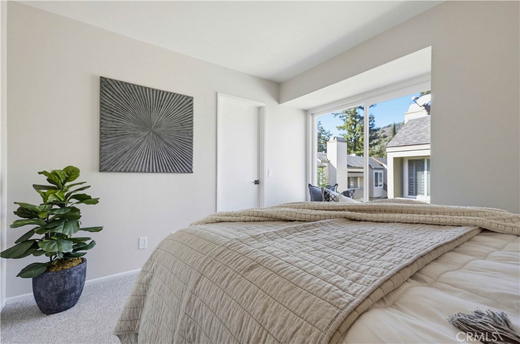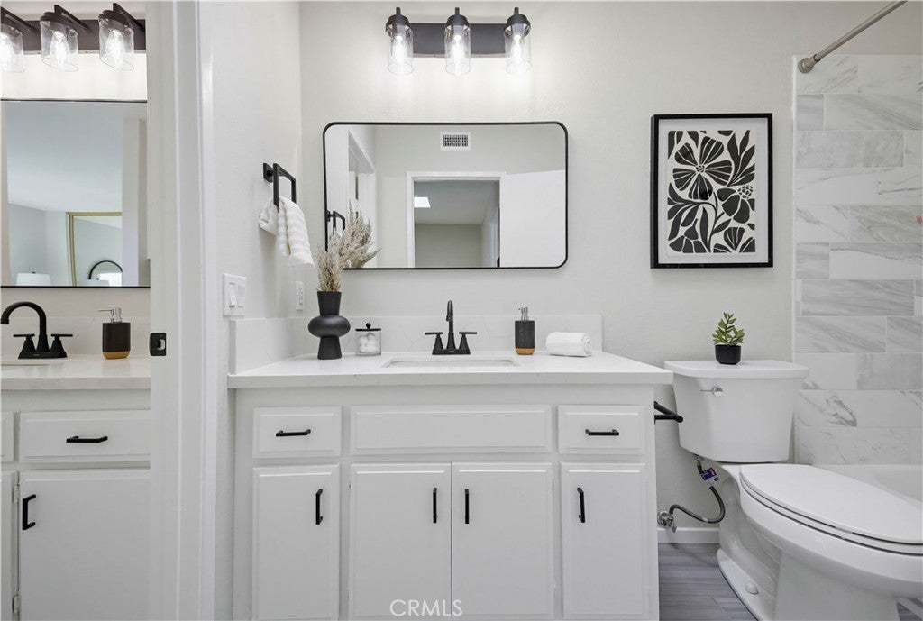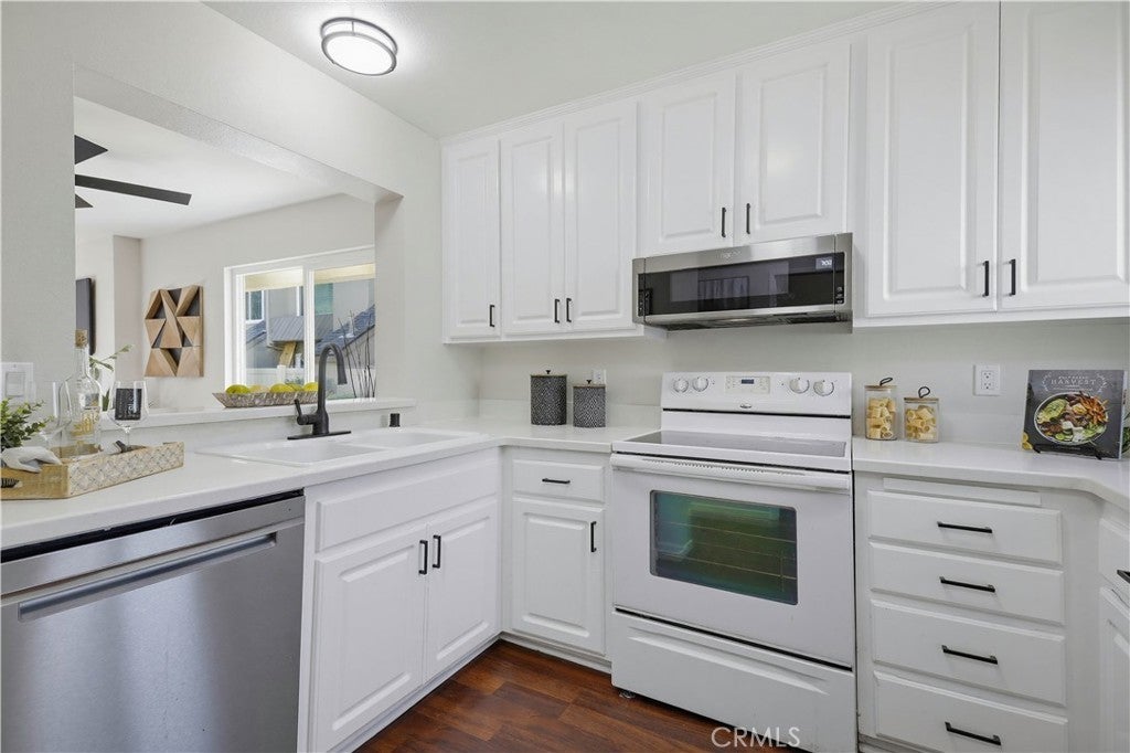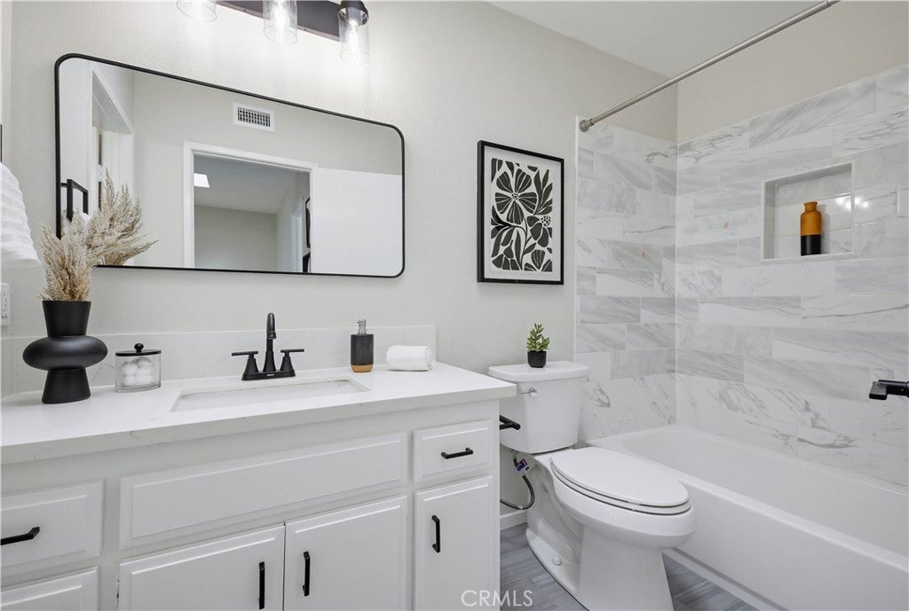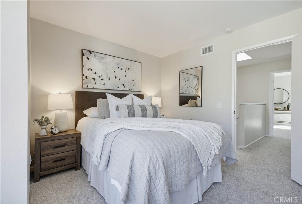 Beautifully updated end unit ideally located in the desirable Villeurbanne community nestled amongst picturesque rolling hills in sought-after Orange Park Acres area. Blessed with a prime end unit location facing a peaceful manicured greenbelt with stately trees creating a welcoming first impression. Step inside and soak in the light filled, freshly painted interior, with gorgeous rich wood laminate floors throughout the open concept main level, high scraped ceilings, skylights, updated lighting, updated ceiling fan, updated kitchen and baths, and new carpet, all providing a superb living environment. The light and bright living room with a cozy fireplace is open to the dining area creating the perfect gathering space with sliders opening the private patio, an ideal indoor-outdoor living space for relaxing and entertaining friends and family. The sparkling kitchen boasts Quartz countertop, timeless white cabinetry, updated faucet and fixtures, and updated hardware and pulls. The main level includes a convenient updated powder room and laundry closet with stackable washer and dryer. Travel up the newly carpeted light filled stairway to the bedroom level. The spacious Primary Bedroom has new carpet, mirrored closet doors, and a Quartz topped updated bathroom vanity with framed vanity mirrors, updated lighting, updated faucet and hardware, and linen storage. Travel through to the shared full bathroom with an additional updated vanity and a tub and shower with gorgeous custom-tiled shower surround. The secondary bedroom also boasts new carpet and a prized walk-in closet. The private fully enclosed patio is a sunny haven for relaxing and BBQing with loved ones. Additional storage available in the storage closet on the patio. 1 Covered Carport Space #38 conveniently located closest to the back gate, 2 uncovered unassigned parking spaces included, passes to be provided. HOA covers Trash and Water. Resort-like Villeurbanne community amenities include a striking clubhouse, sparkling pool and spa, lounging and gathering areas, BBQ and picnic areas, and lush manicured landscaping. Quiet community just steps from numerous hiking and biking trails and wildlife viewing, within walking distance of local schools, close to dining at Orange Hill Restaurant & Bar and Iconic Orange County Mining Co with spectacular views, close to shopping, just minutes from Irvine Regional Park and Peters Canyon. Easy 55 frwy and Toll Road access. No Mello Roos!