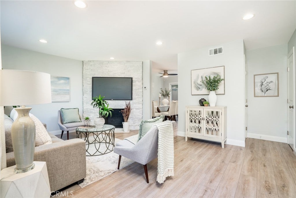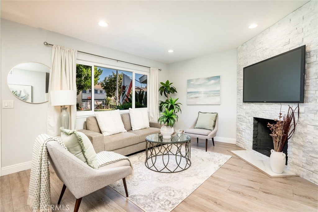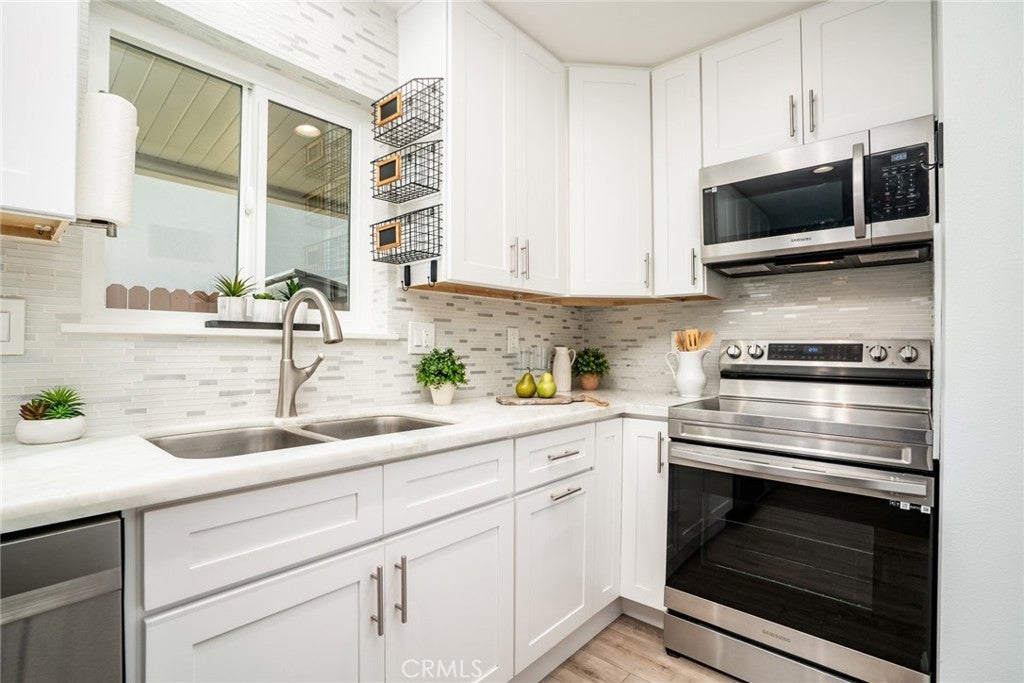 THIS IS THE ONE YOU'VE BEEN WAITING FOR!!! This fantastic 3 bedroom Huntington Bay townhome is absolutely gorgeous and 100% move-in ready. This home was recently remodeled and features a beautiful kitchen w/white shaker cabinetry, quartz countertops, glass tile backsplash, and stainless steel Samsung refrigerator, stove, microwave, and dishwasher. Both bathrooms have been totally remodeled w/white shaker vanities, quartz counters, and modern fixtures. You're going to love all of the elegant upgrades including 2 Costway mini split A/C - Heater systems, ledge stone fireplace, vinyl dual pane windows & glass sliding door, laminate flooring downstairs, contemporary interior paint, scraped ceilings, recessed lights, 4 ceiling fans + much more. There's even inside laundry with a newer Samsung washer & dryer included. This home has 1 assigned carport + plenty of guest parking right out front. The Huntington Bay development is known for being a very quiet community with great neighbors who have true pride of ownership. The monthly HOA dues of $265.00 are some of the lowest in the City of Huntington Beach and includes a large pool, kiddie pool, clubhouse, exterior building/greenspace maintenance, and insurance. This home has incredible schools including Oka Elementary (8), Talbert Middle School (8), and Edison High School (9). Best of all is you are just minutes away from Surf City USA's world famous beach & pier, restaurants, shops, and all major super markets. Come enjoy the year round balmy breezes and beach lifestyle at a very affordable price.