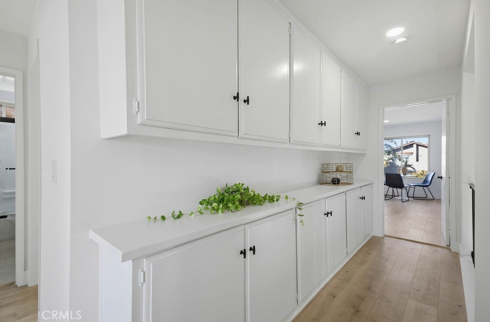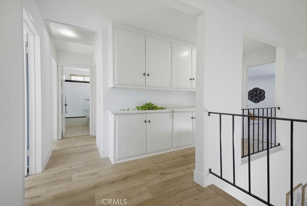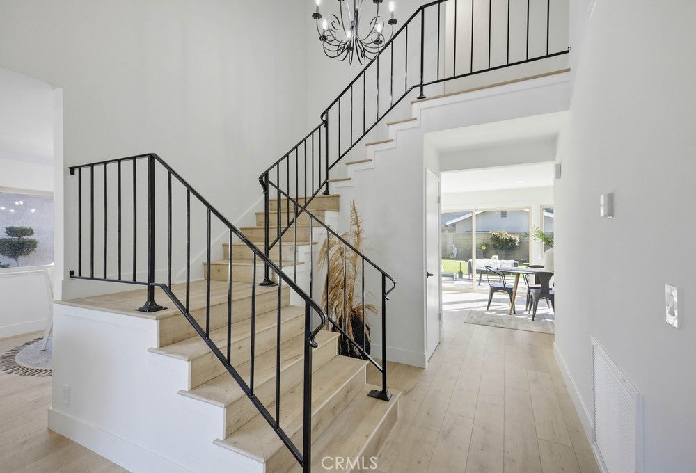 Located on a quiet Anaheim street, this updated home offers clean curb appeal with a white exterior, black trim, and a neatly landscaped front lawn. Inside, wood floors and an airy, open layout create a bright and welcoming first impression. The main living area features high ceilings, recessed lighting, and a large front window that fills the space with natural light. Nearby, the dining area showcases a sleek black metal light fixture and open sightlines to the staircase with modern black railings, setting the tone for the home's contemporary aesthetic. Toward the back of the home, a second expansive living space connects seamlessly to the updated kitchen. This room features a striking dark stone fireplace as its focal point, with sliding glass doors and a full wall of windows providing abundant natural light and backyard views. The kitchen offers white cabinetry, marble countertops and backsplash, black fixtures, and an open layout with space for a breakfast table or additional dining area. A dedicated laundry area and a convenient half bath complete the downstairs level. Upstairs, the hallway includes built-in cabinetry and leads to multiple rooms branching in different directions. A spacious bonus room serves as a flexible playroom or additional living space, enhanced by recessed lighting and large windows. The primary suite includes an updated ensuite bathroom and a walk-in closet. Three additional well-sized bedrooms provide ample accommodation, while a bright, modern full bathroom with white finishes and black accents serves the secondary rooms. The backyard offers a wide, open layout with both hardscape and a crisp grassy lawn ideal for play, entertaining, or future customization. Overall, this home stands out with its modern updates, cohesive black-and-white design elements, abundant natural light, and multiple living spaces designed for comfort and versatility.