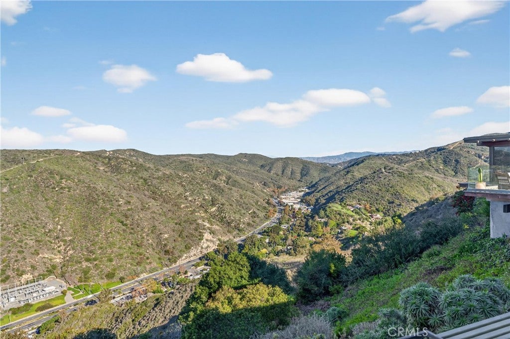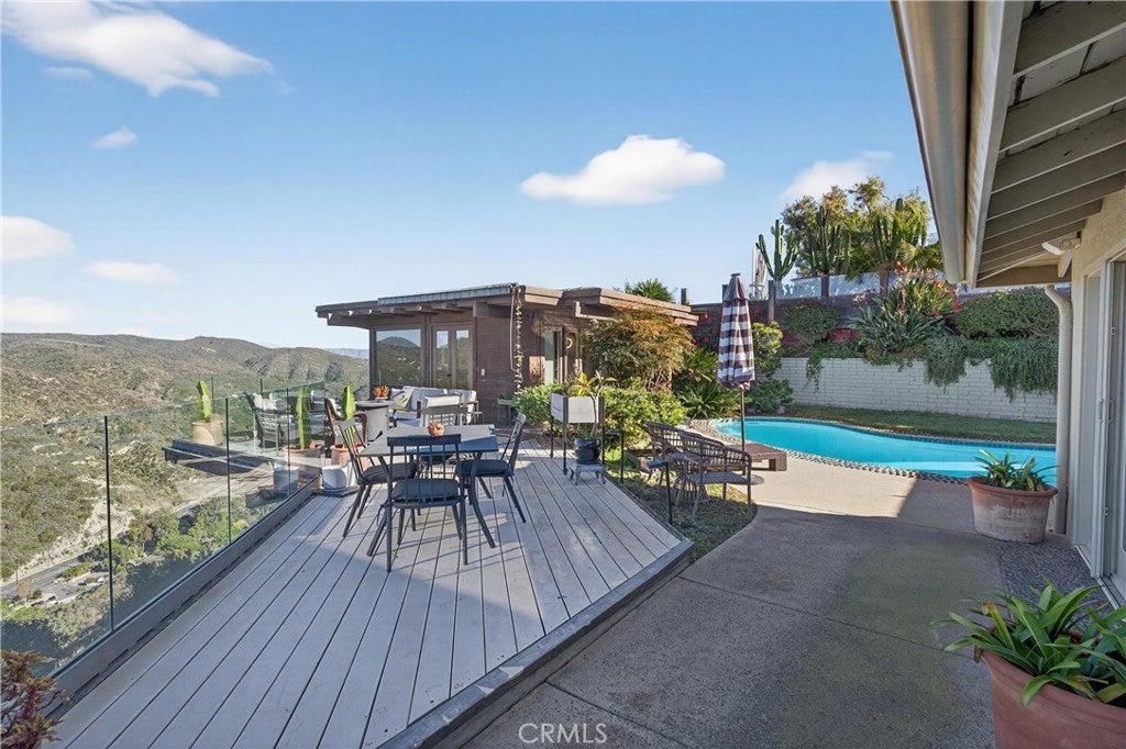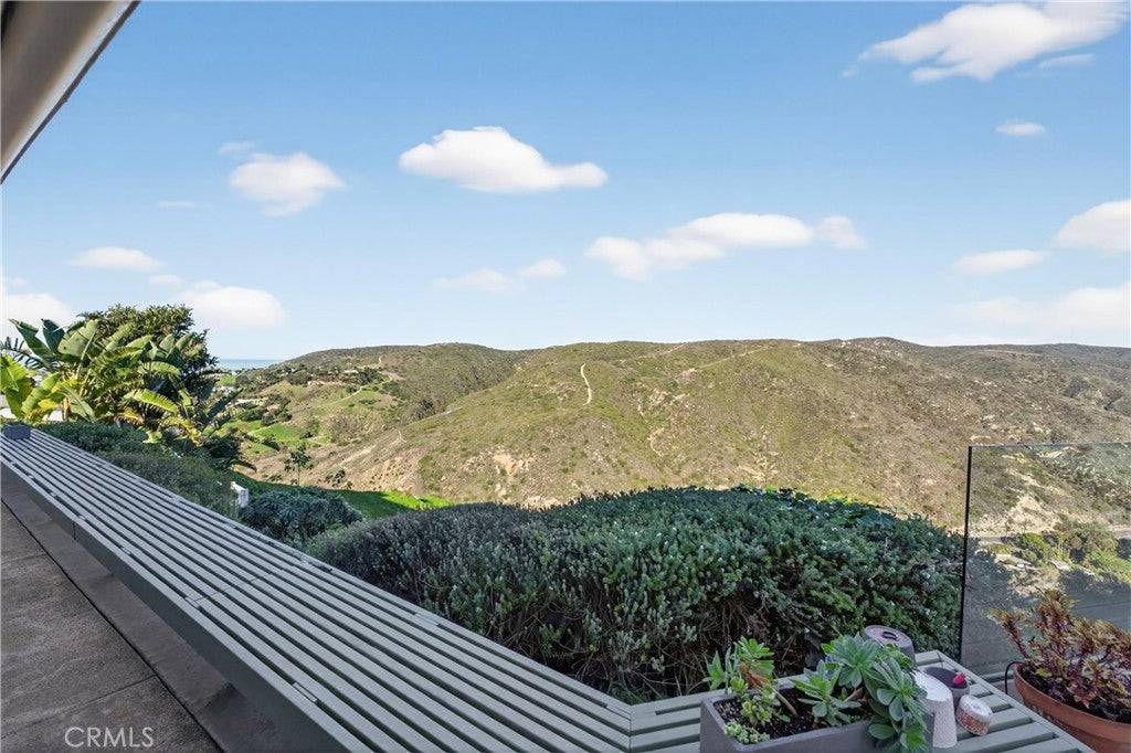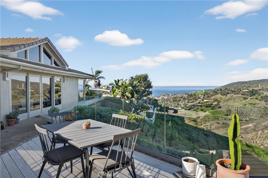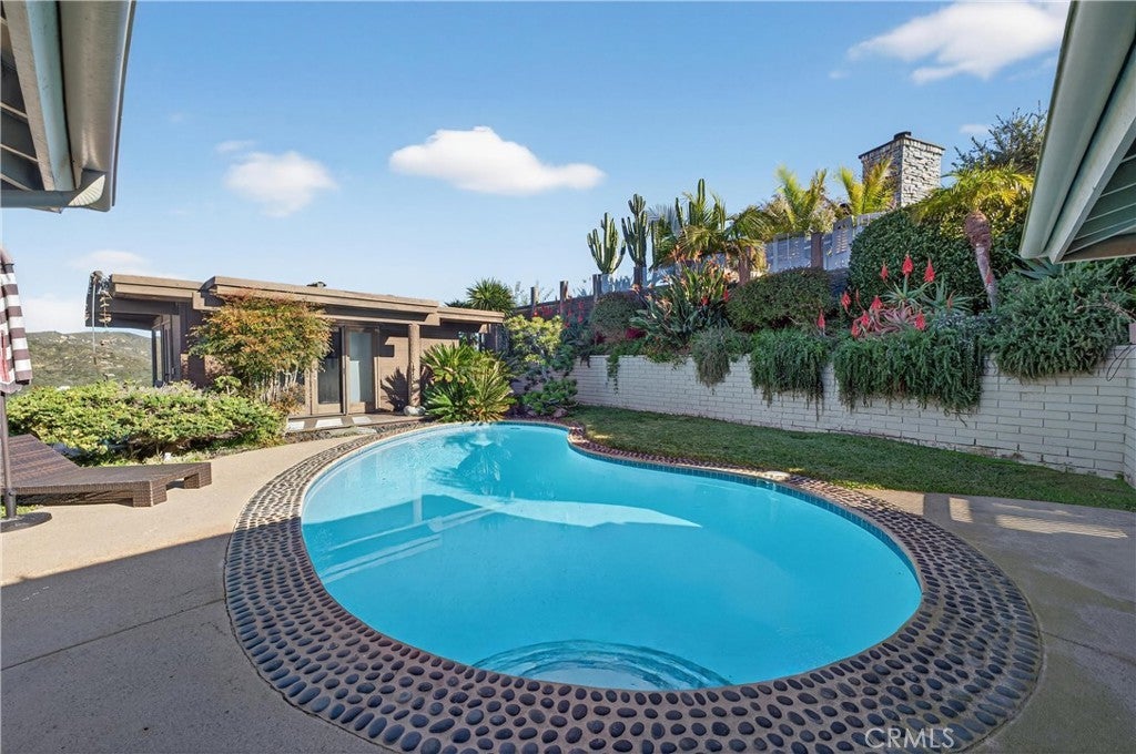 Single Level Ranch home in Prime Laguna Beach. Located in the desirable Mystic Hills, this stunning contemporary residence is situated on an ideal lot with ocean and panoramic canyon views. Only a few minutes from Laguna Main Beach. 3 bed, 2 bath entertainers dream main house with an additional DETACHED 1 bed and 1 bath guest house/casita comes with many architectural designs such as beamed high ceilings, built-in entertainment cabinets, soft LUTRON lighting, hardwood floors, and modern rounded wall edges and colors. Once inside, the spacious living room and dining room opens to a grand deck with a breathtaking panoramic canyon, ocean views and the swimming pool. Indoor outdoor living at it's best as well as a lawn area for the pets. Gourmet kitchen with Subzero and Miele appliances including a wine fridge, Rational German kitchen cabinets and pocket doors from the dining room kitchen separation. Guest house built like a modern retreat with shoji sliding screens with views of the pool, ocean and canyon. It provides a flexible space for possible ADU conversion, a home office, or artist studio, expanding the total living area to approximately 2020 square feet. Main house has hidden TV in cabinet over the fireplace. Garage has a stainless steel door and an electrical outlet for electric car charging. Ample street parking.