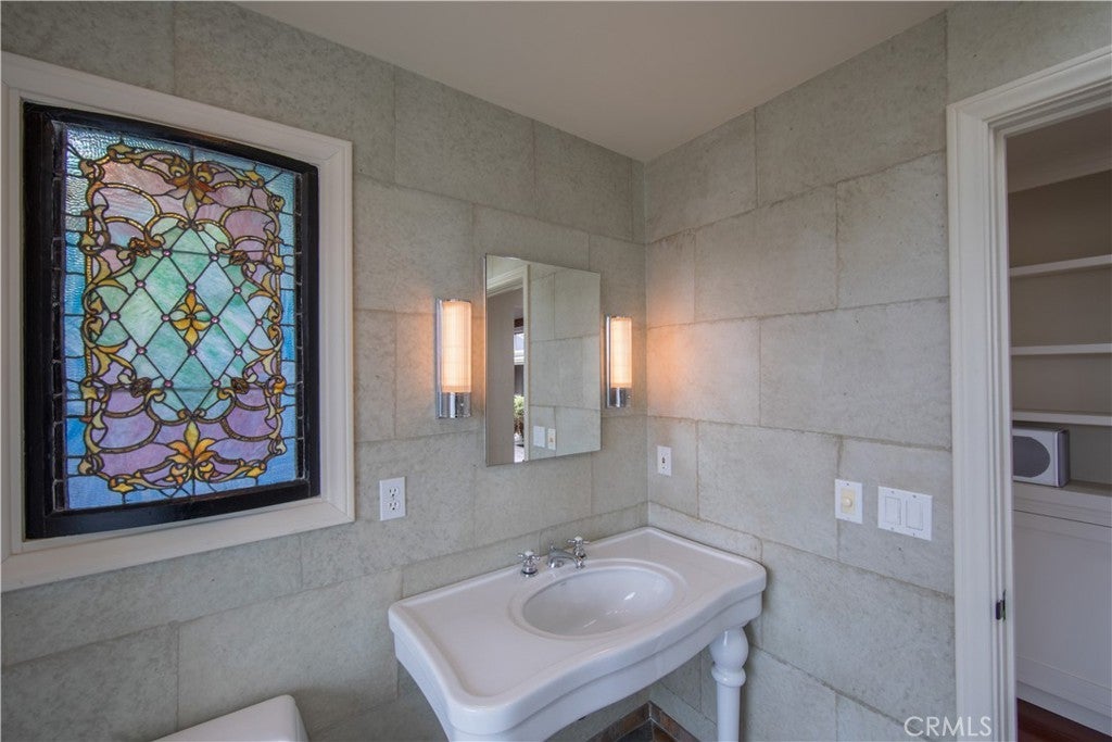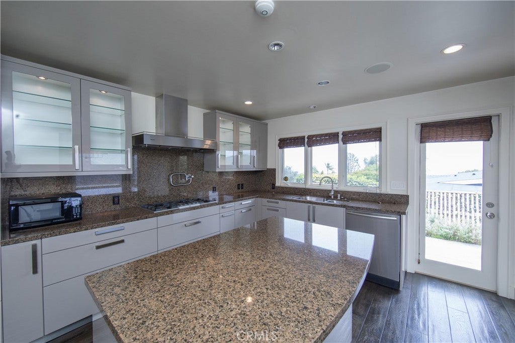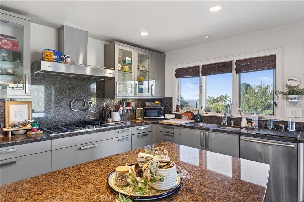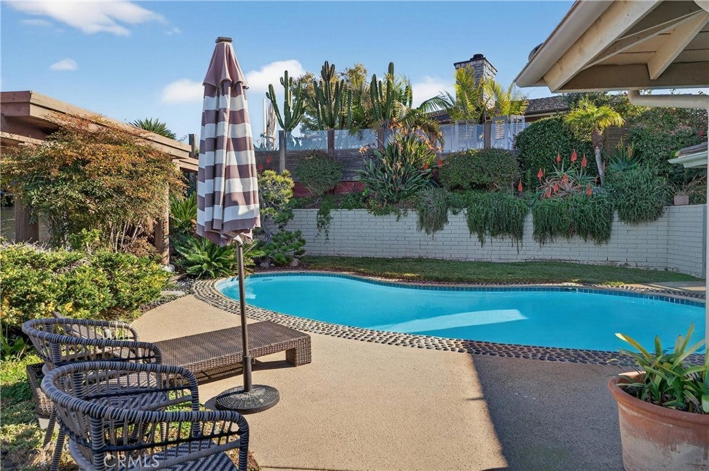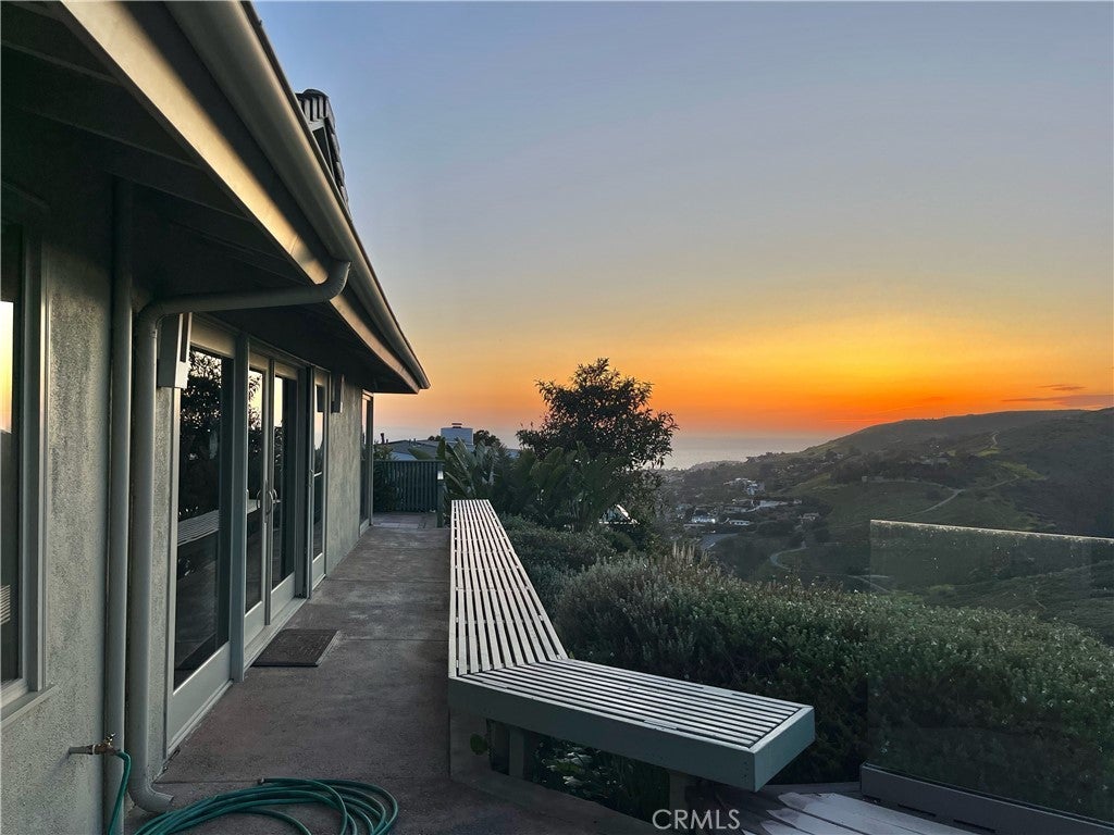 Single Level Ranch home in Prime Laguna Beach. Located in the desirable Mystic Hills, this stunning contemporary residence is situated on an ideal lot with ocean and panoramic canyon views. Only a few minutes from Laguna Main Beach. 3 bed, 2 bath entertainers dream main house with an additional DETACHED 1 bed and 1 bath guest house/casita comes with many architectural designs such as beamed high ceilings, built-in entertainment cabinets, soft LUTRON lighting, hardwood floors, and modern rounded wall edges and colors. Once inside, the spacious living room and dining room opens to a grand deck with a breathtaking panoramic canyon, ocean views and the swimming pool. Indoor outdoor living at it's best as well as a lawn area for the pets. Gourmet kitchen with Subzero and Miele appliances including a wine fridge, Rational German kitchen cabinets and pocket doors from the dining room kitchen separation. Guest house built like a modern retreat with shoji sliding screens with views of the pool, ocean and canyon. It provides a flexible space for possible ADU conversion, a home office, or artist studio, expanding the total living area to approximately 2020 square feet. Main house has hidden TV in cabinet over the fireplace. Garage has a stainless steel door and an electrical outlet for electric car charging. Ample street parking.