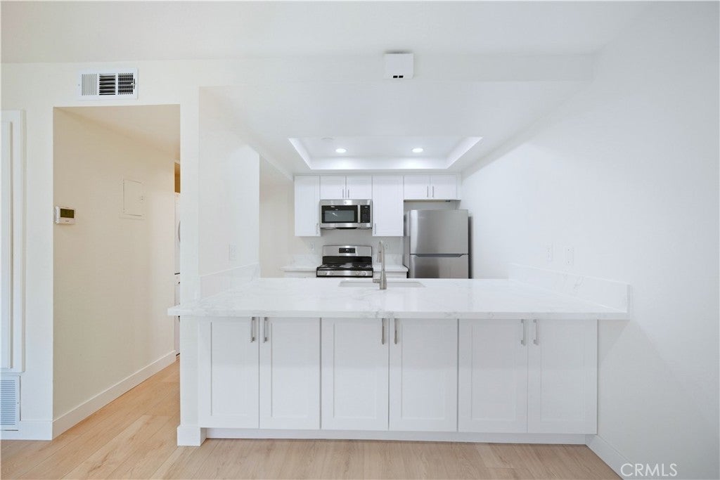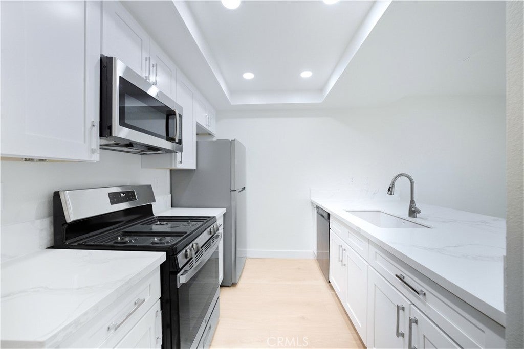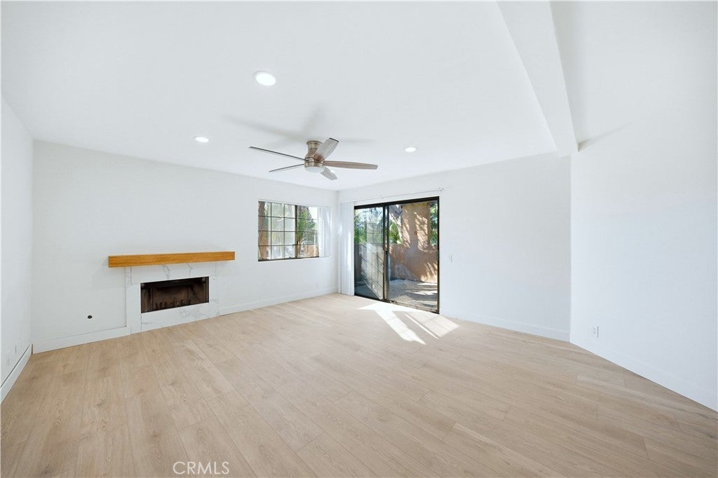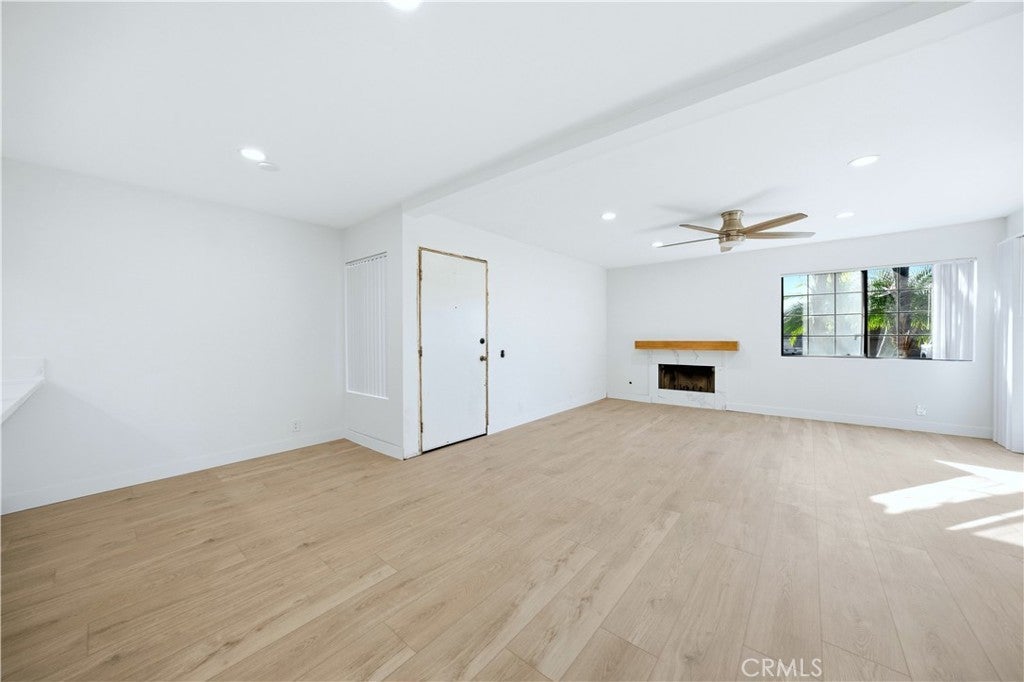 Exquisitely Remodeled Luxury End Unit! This impeccably redesigned 1 bedroom, 1 bathroom first-floor residence has been completely remodeled from top to bottom, offering refined coastal living at its best. The open-concept floor plan is highlighted by wide-plank vinyl flooring and an abundance of natural light, creating a sophisticated yet inviting atmosphere. The brand-new designer kitchen features sleek cabinetry, premium finishes, and all-new appliances, seamlessly flowing into the living space anchored by an elegant fireplace. The spa-inspired bathroom showcases modern fixtures and upscale details, while the convenience of an in-unit washer and dryer enhances everyday living. As a private end unit, this home offers an exceptionally large patio—ideal for entertaining or quiet relaxation—along with a dedicated carport parking space. Ideally situated near the community pool and just moments from Pacific City, downtown Huntington Beach, world-class dining, shopping, and the coastline. A rare opportunity to enjoy turnkey luxury in one of Huntington Beach’s most desirable locations.
