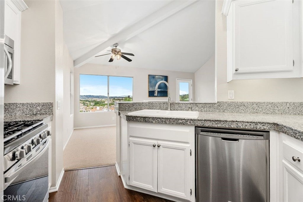 PANORAMIC MOUNTAIN VIEWS!! This turnkey residence in the highly sought-after Expressions community of Laguna Niguel offers a perfect blend of modern comfort and coastal convenience. The home features a bright, open-concept floor plan highlighted by dramatic cathedral-vaulted ceilings and a cozy fireplace that anchors the living area. The updated kitchen, featuring sleek stone countertops and premium stainless steel appliances, flows seamlessly into the dining space, making it ideal for entertaining. Relax in your spacious primary suite complete with a generous walk-in closet and a private balcony that captures serene city and mountain views. Practical upgrades include a direct-access 1-car garage, in-unit laundry with washer/dryer included, and the peace of mind provided by a community that has been recently re-piped. This home also includes ALL APPLIANCES- refrigerator and washer/dryer! Ready to move in. Life in the Expressions neighborhood feels like a year-round vacation, with access to a resort-style pool, spa, and beautifully landscaped grounds. Strategically located near the 73 Toll Road and I-5, this home offers an effortless commute while keeping you minutes away from the shopping and dining at The Shops at Mission Viejo. Outdoor enthusiasts will appreciate the proximity to the trails at Laguna Niguel Regional Park and the world-class beaches of Dana Point Harbor, all while being served by the prestigious Capistrano Unified School District. What else could you ask for?