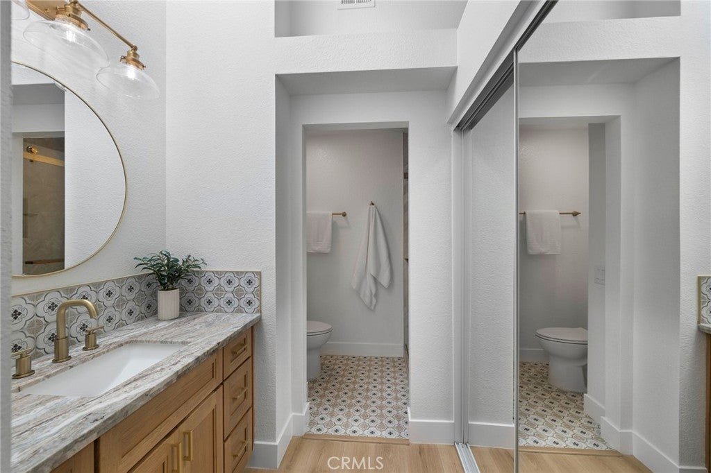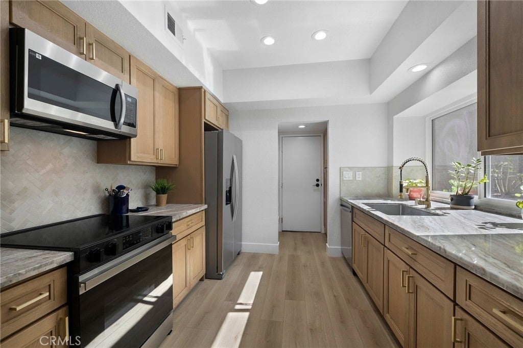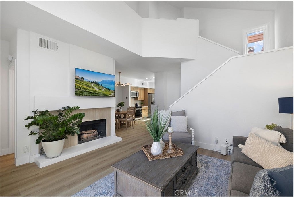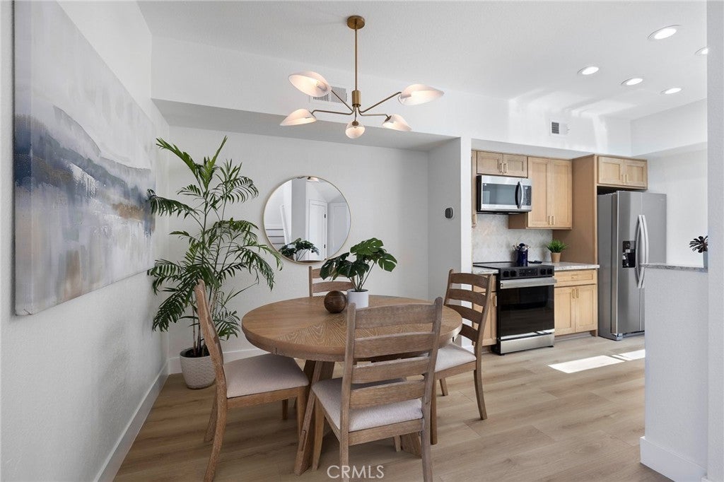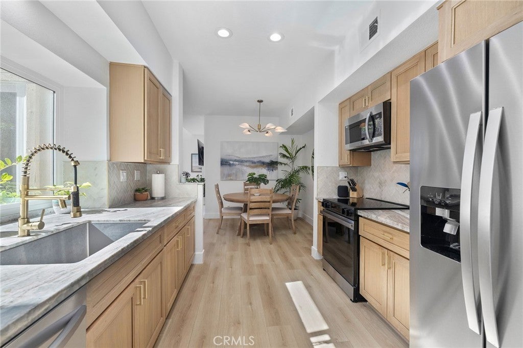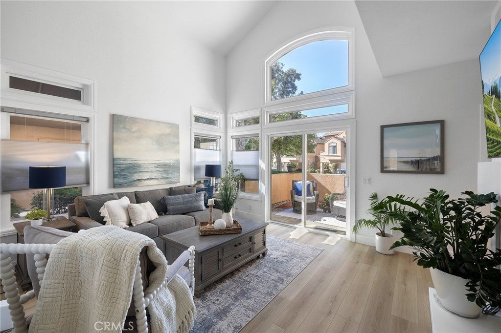 Light and bright, this exceptional end-unit three-bedroom, two-bath condominium in the desirable Silvertide community has been totally updated and is truly move-in ready. The functional floor plan features a downstairs bedroom with a full bath, ideal for guests, multi-generational living, or a home office. Vaulted ceilings enhance the open feel of the home, filling the space with natural light. The home has been extensively upgraded with new kitchen cabinets featuring soft-closing drawers and doors, accented by elegant gold hardware, along with new appliances and fully updated bathrooms. Additional improvements include luxury vinyl plank flooring throughout, new interior doors and hardware, and fresh interior paint. The property also offers new dual-pane windows installed in 2025, a new garage door, an epoxy-coated garage floor with overhead storage, a direct-access garage, and a new AC condenser. Enjoy a quiet interior location with refreshing ocean breezes, just minutes from shopping, dining, and the beach. The perfect-sized patio is ideal for relaxing, entertaining, and enjoying the outdoors. Don’t miss this incredible opportunity, approximately two miles from Dana Point Harbor.