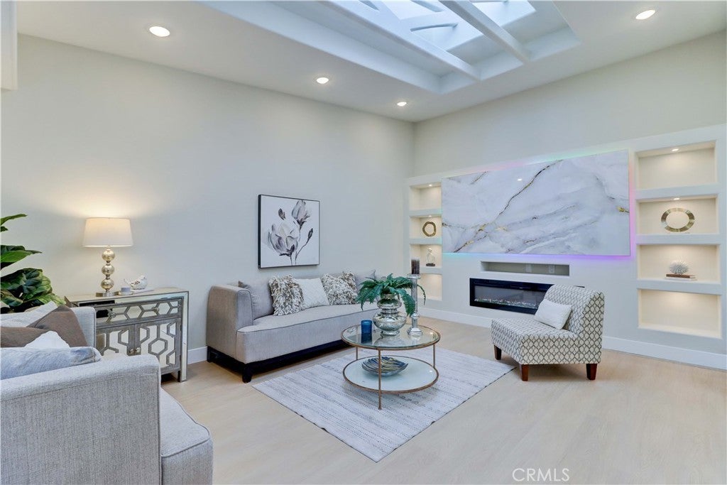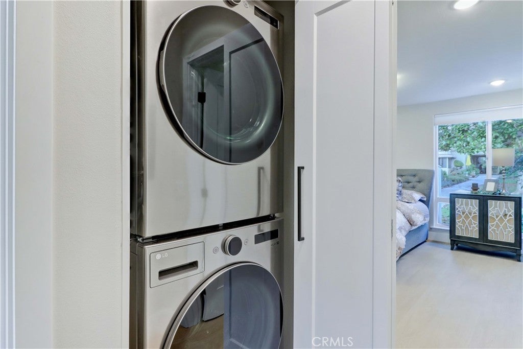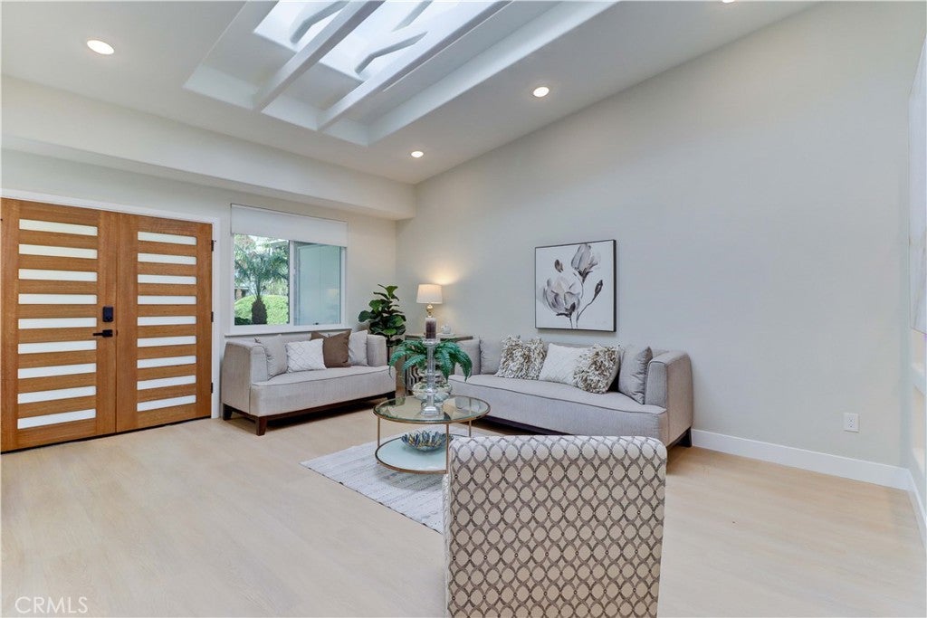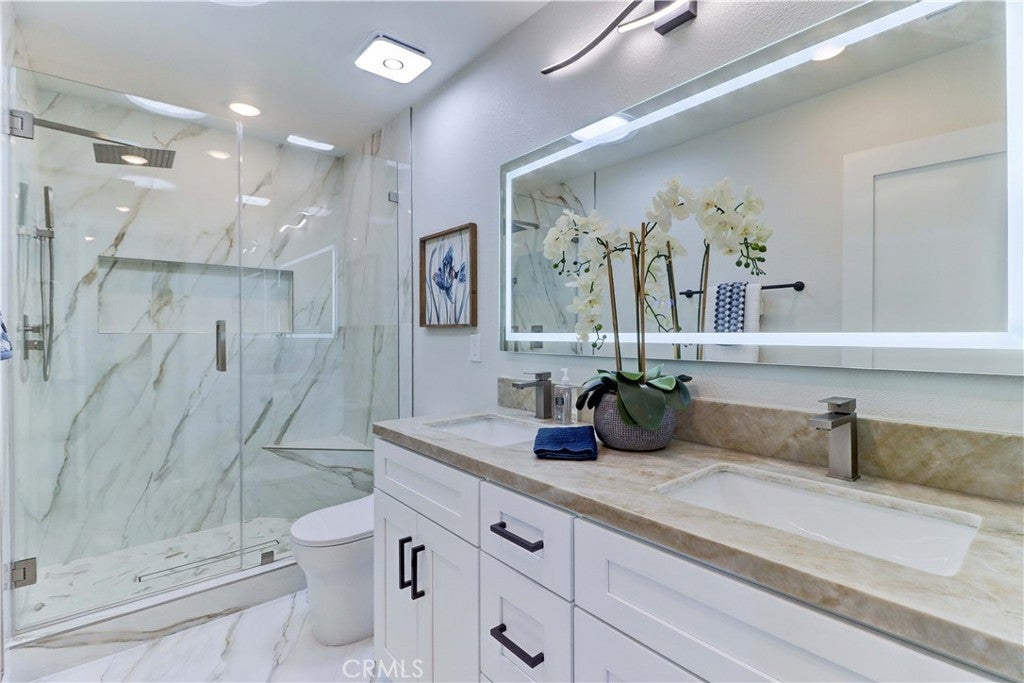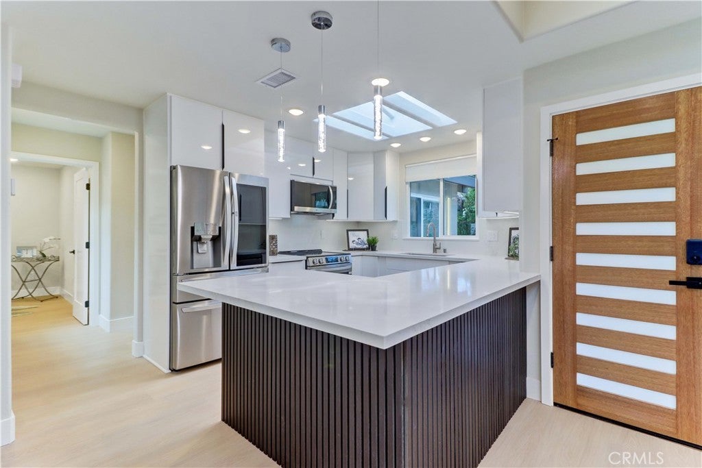 LOCATION, LOCATION, LOCATION! Gorgeous single level home, GRANADA MODEL, completely remodeled and truly move- in- ready, with no one above or below. This is a rare opportunity to own a beautifully updated, bright cottage style residence that blends timeless charm with modern upgrades in the highly desirable 55+ Laguna Woods Community. Step inside to discover a thoughtfully resigned interior featuring new waterproof luxury vinyl flooring throughout, elegant baseboards, vaulted ceiling, and recessed LED lighting. The open floor plan is filled with natural light , enhanced by a designer skylight and beautifully designed entertainment center in the living room.The modern kitchen showcases quartz countertops, stainless steel appliances, and sleek finishes perfect for both everyday living and entertaining. Both bathrooms have been fully renovated with comfort and style in mind. The spacious primary bedroom offers direct access to a charming front patio through high double sliding glass doors, creating a seamless indoor- outdoor feel. The primary bathroom features a double sink vanity and a beautifully designed walk- in shower with a frameless glass enclosure. Additional highlights include a brand- new full size washer and dryer, cleverly concealed in a custom hallway closet, new double- pane windows and modern blinds throughout. This dream home is bright, elegant, and thoughtfully upgraded- a perfect blend of comfort, style and convenience.