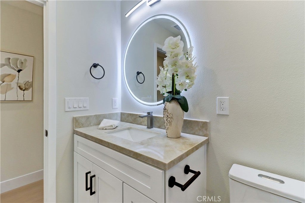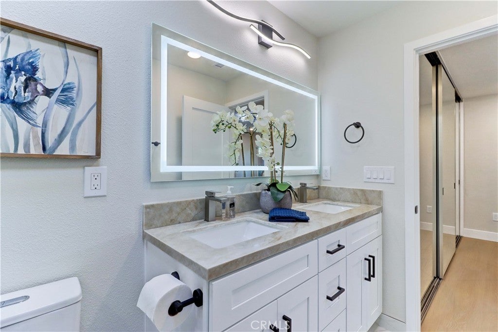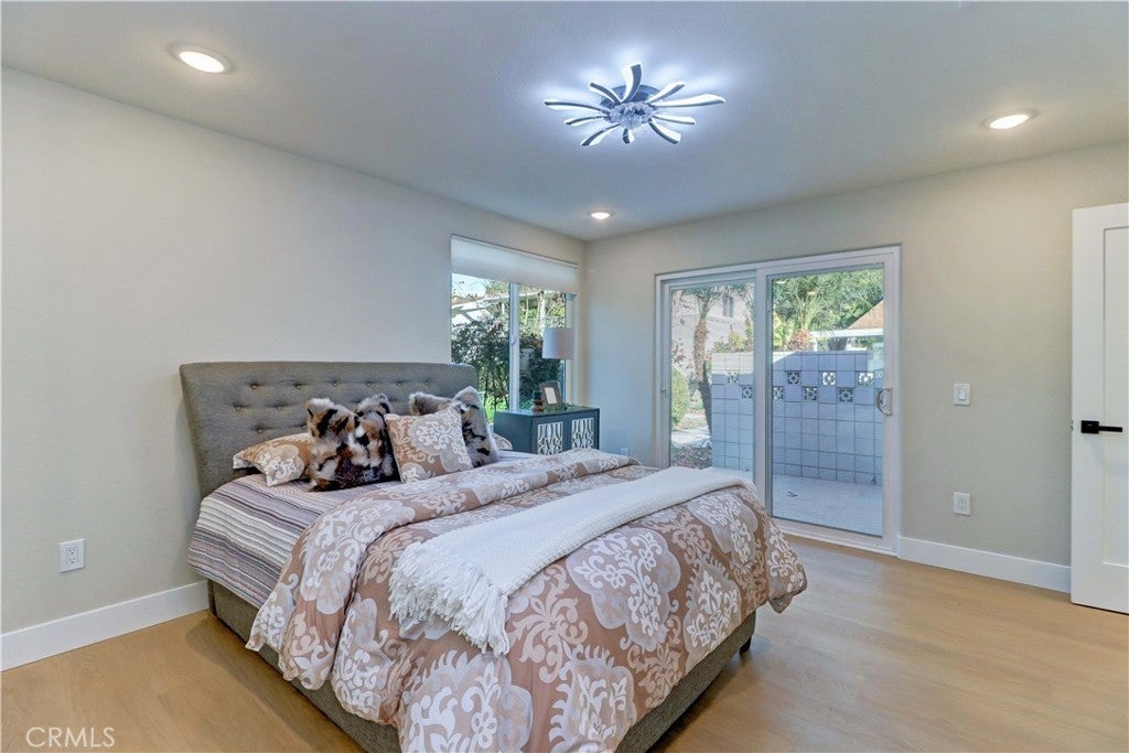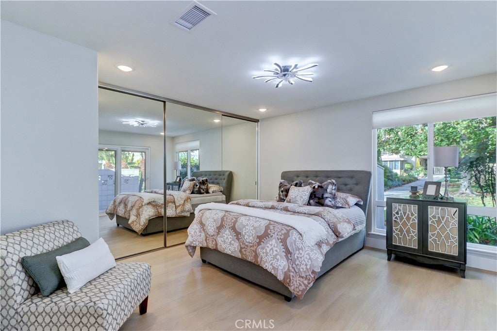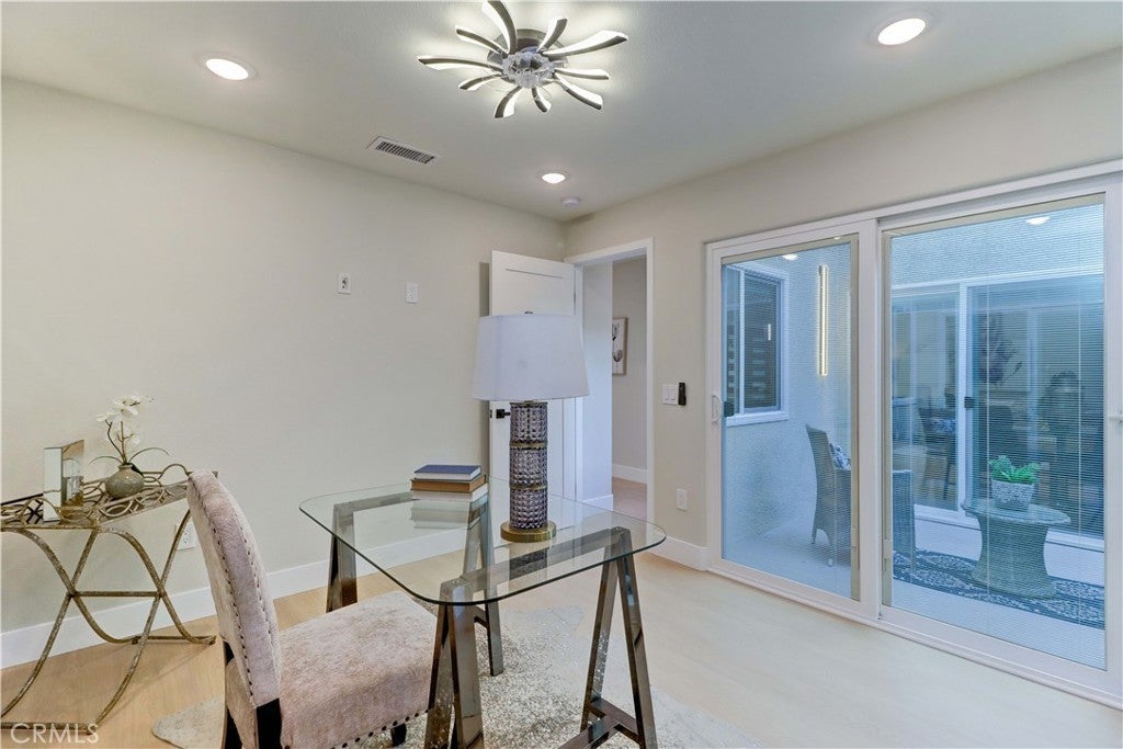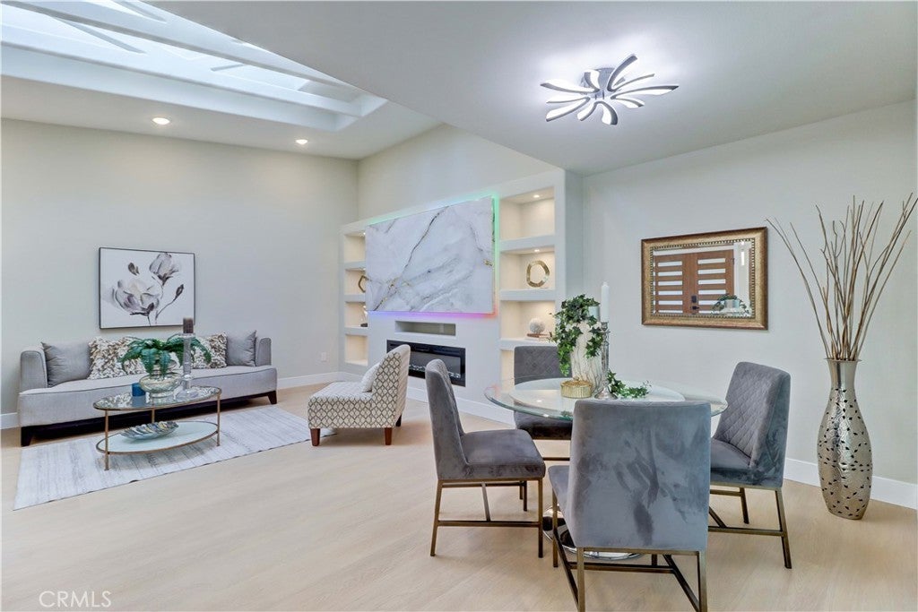 LOCATION, LOCATION, LOCATION! Gorgeous single level home, GRANADA MODEL, completely remodeled and truly move- in- ready, with no one above or below. This is a rare opportunity to own a beautifully updated, bright cottage style residence that blends timeless charm with modern upgrades in the highly desirable 55+ Laguna Woods Community. Step inside to discover a thoughtfully resigned interior featuring new waterproof luxury vinyl flooring throughout, elegant baseboards, vaulted ceiling, and recessed LED lighting. The open floor plan is filled with natural light , enhanced by a designer skylight and beautifully designed entertainment center in the living room.The modern kitchen showcases quartz countertops, stainless steel appliances, and sleek finishes perfect for both everyday living and entertaining. Both bathrooms have been fully renovated with comfort and style in mind. The spacious primary bedroom offers direct access to a charming front patio through high double sliding glass doors, creating a seamless indoor- outdoor feel. The primary bathroom features a double sink vanity and a beautifully designed walk- in shower with a frameless glass enclosure. Additional highlights include a brand- new full size washer and dryer, cleverly concealed in a custom hallway closet, new double- pane windows and modern blinds throughout. This dream home is bright, elegant, and thoughtfully upgraded- a perfect blend of comfort, style and convenience.