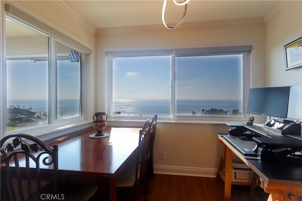 View, View, View! Located directly across from the Montage Resort, this single-level, 2-bedroom, 1-bath condominium offers ocean views from the kitchen, dining area, and living room. The open floor plan features large windows that provide natural light and highlight the surrounding coastal setting. Interior features include updated flooring, granite countertops, custom cabinetry, and remote-controlled window shades. The unit includes a private front porch with ocean-facing seating space, as well as a separate rear patio offering additional outdoor area. The floor plan consists of two bedrooms and one full bathroom. Community amenities include landscaped common areas, a swimming pool, and a clubhouse. The property also includes a detached one-car garage. Conveniently located near beaches, coastal walking paths, restaurants, and local amenities, this property presents an opportunity for coastal living in Laguna Beach.