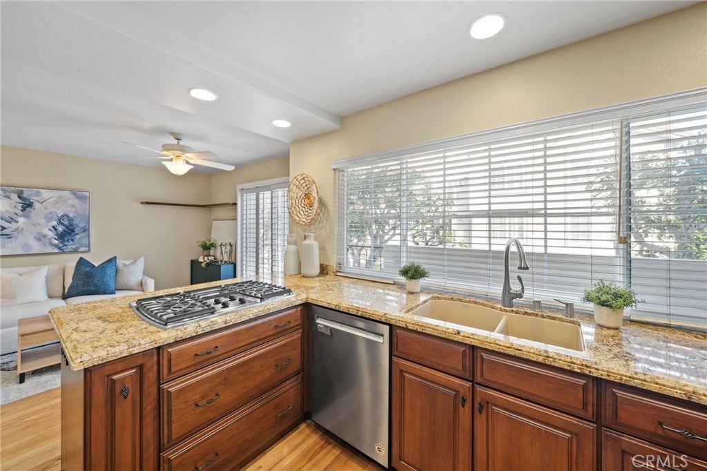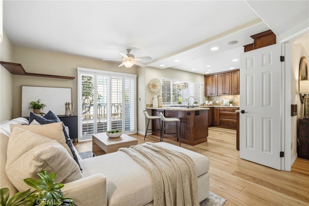 Don't be left out in the cold–this beautifully remodeled 2 bedroom features a flexible loft space with option for a third bedroom. Keep the loft as-is or sellers will accomodate conversion; value reflected in list price. Behind the 24-hour guard-gated community of prestigious Seacliff on the Greens, lies this tri-level residence offering coastal living within one of Huntington Beach’s most sought-after neighborhoods. Residents enjoy multiple community pools, spas, clubhouses, and lush greenbelts, with a nearby gate for easy ocean access and a prime location positioned between the two community pools. Situated near The Huntington Club and just minutes from the beach, dining, and local attractions. A welcoming front patio and deck lead inside to a thoughtfully designed floor plan featuring a guest bathroom upon entry and an attached oversized two-car garage with motion-sensor lighting and EV charger plug-in readiness. The main living space offers a gas fireplace and custom wet bar, perfect for both relaxed evenings and entertaining. A formal dining area and additional living space flow seamlessly off the remodeled kitchen, which offers cherrywood soft-close cabinetry, granite countertops, premium appliances, and bar seating. Upstairs, a light-filled loft provides flexible space for a home office, seating area, or can easily be converted into a third bedroom with its own private deck. The primary bedroom offers 2 walk-in closets with built-in organizers. The attached primary bath has been remodeled with an expanded walk-in tiled shower with dual shower heads, quartz countertops, hot tool drawer organizers and private toilet room. Additional features include engineered wood flooring, dual-pane windows, custom shutters, central A/C, a water softening system, and multiple outdoor decks designed to enjoy the coastal breeze.