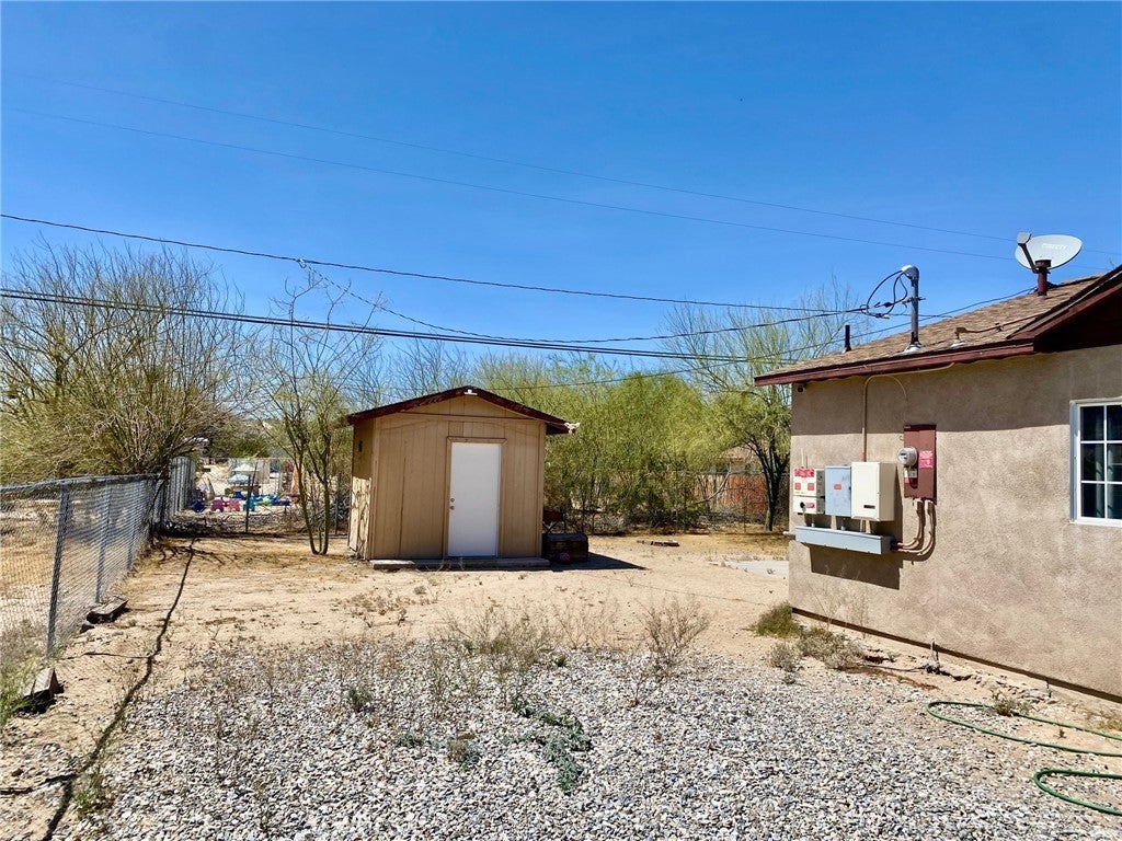 Well-located and functional, this 2-bedroom, 2-bath property has over 1000 sq ft of living space and sits on a fully chain-link fenced lot. large, flat yard—ideal for outdoor living, pets, or future projects. Tile floors throughout and recessed lighting. The large kitchen is equipped with granite countertops, dark cabinets, freestanding gas stove, and attached microwave. A convenient interior laundry closet right off of the kitchen. Huge master bedroom has recessed lighting and an attached master bath. A backyard shed provides additional storage or workspace. Conveniently located close to Highway 62, this property also features leased solar already installed for added energy efficiency. Current lease is $109/month buyer to take over contract. Current lease is paying for monthly electricity usage. A solid opportunity with a large, flat lot and great potential.